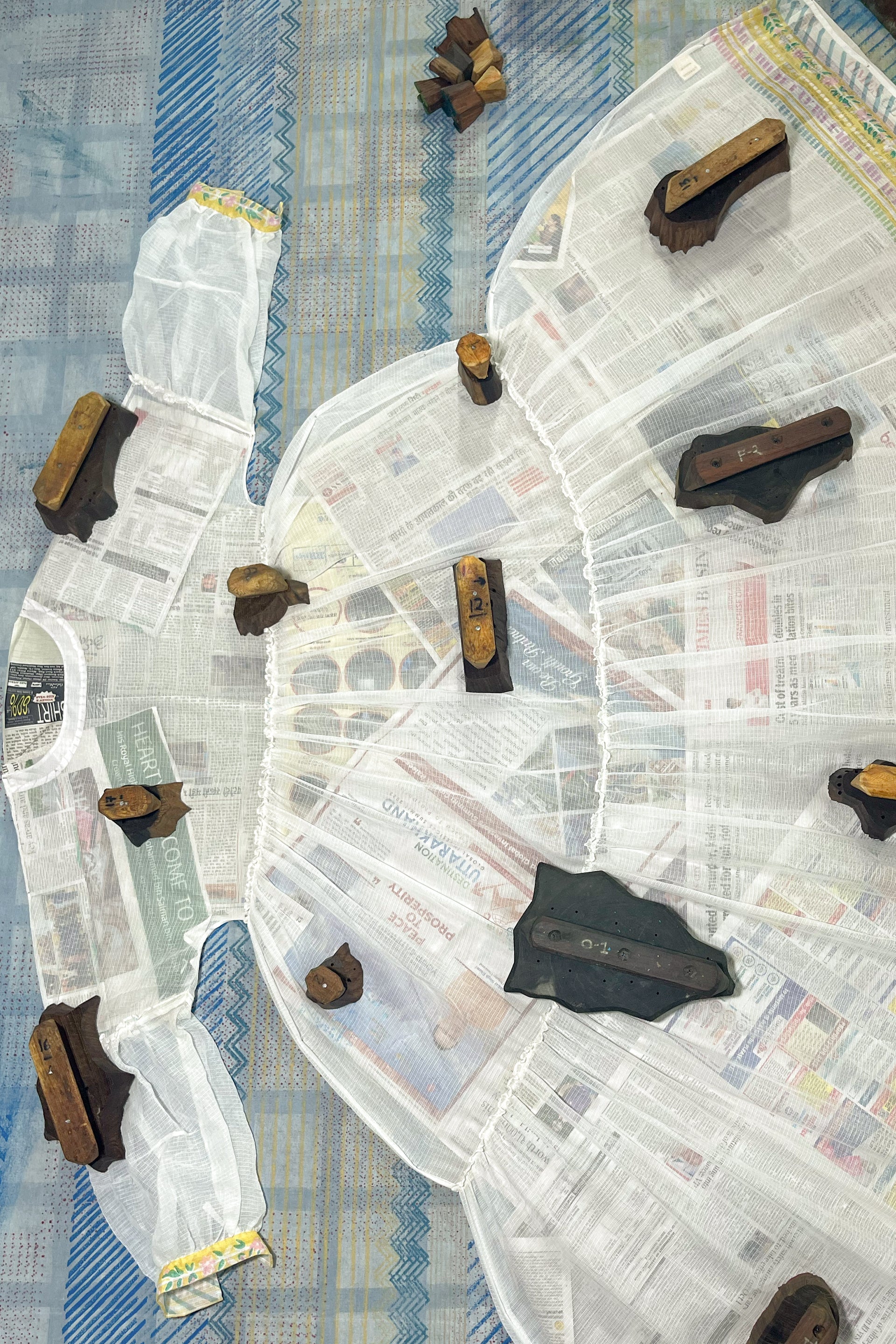 Motifs inspired by the diverse floral elements of Amer were first translated into hand-drawn watercolor paintings. These designs were then meticulously adapted into hand-carved blocks, carefully considering the limitations of the medium. The play with negative-positive space, color separation, and outlining led to both singular motifs and intricate, multi-layered repeats. As many as 80 small and large wooden blocks were used to create pattern repeats for a single garment.