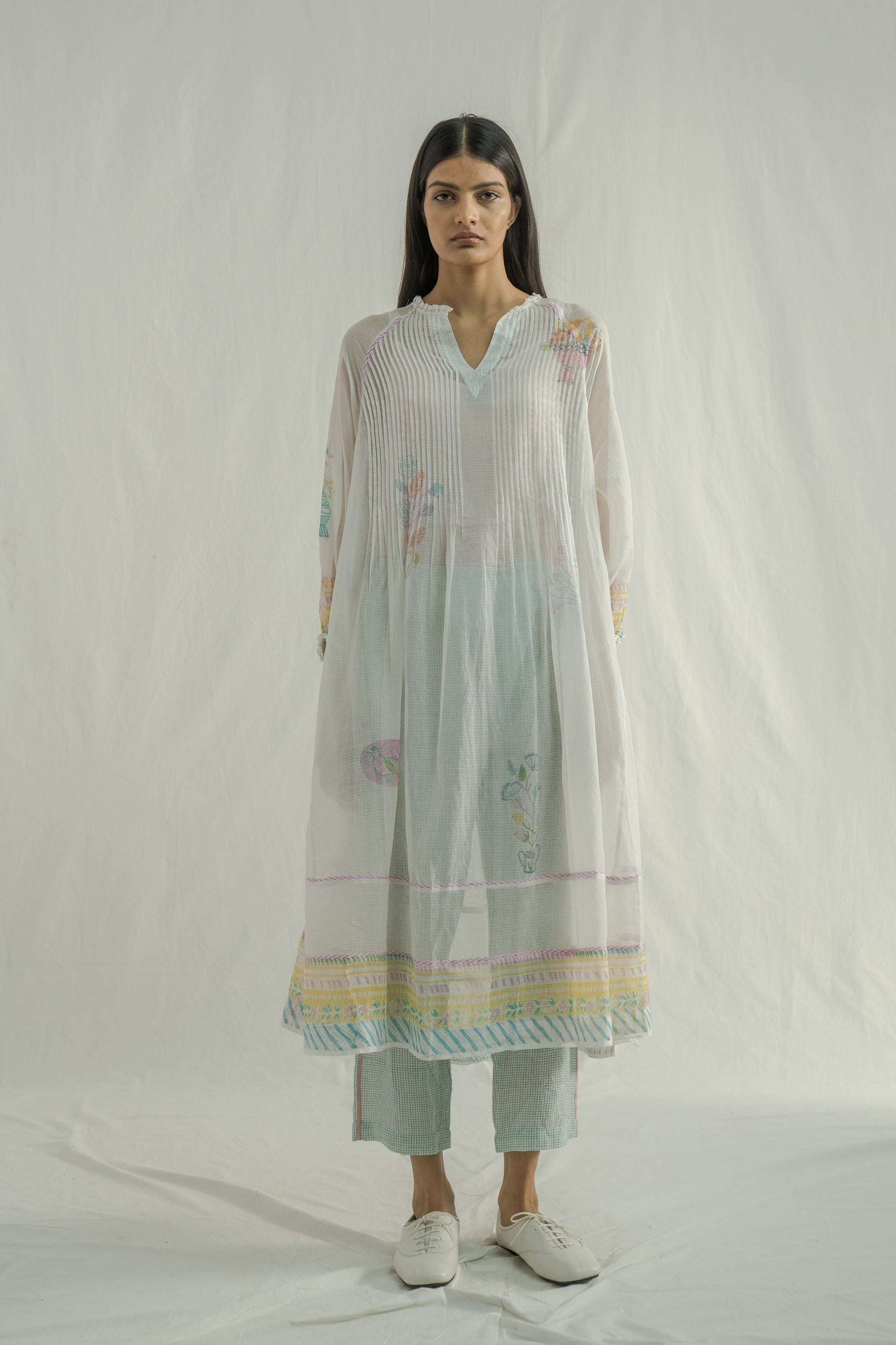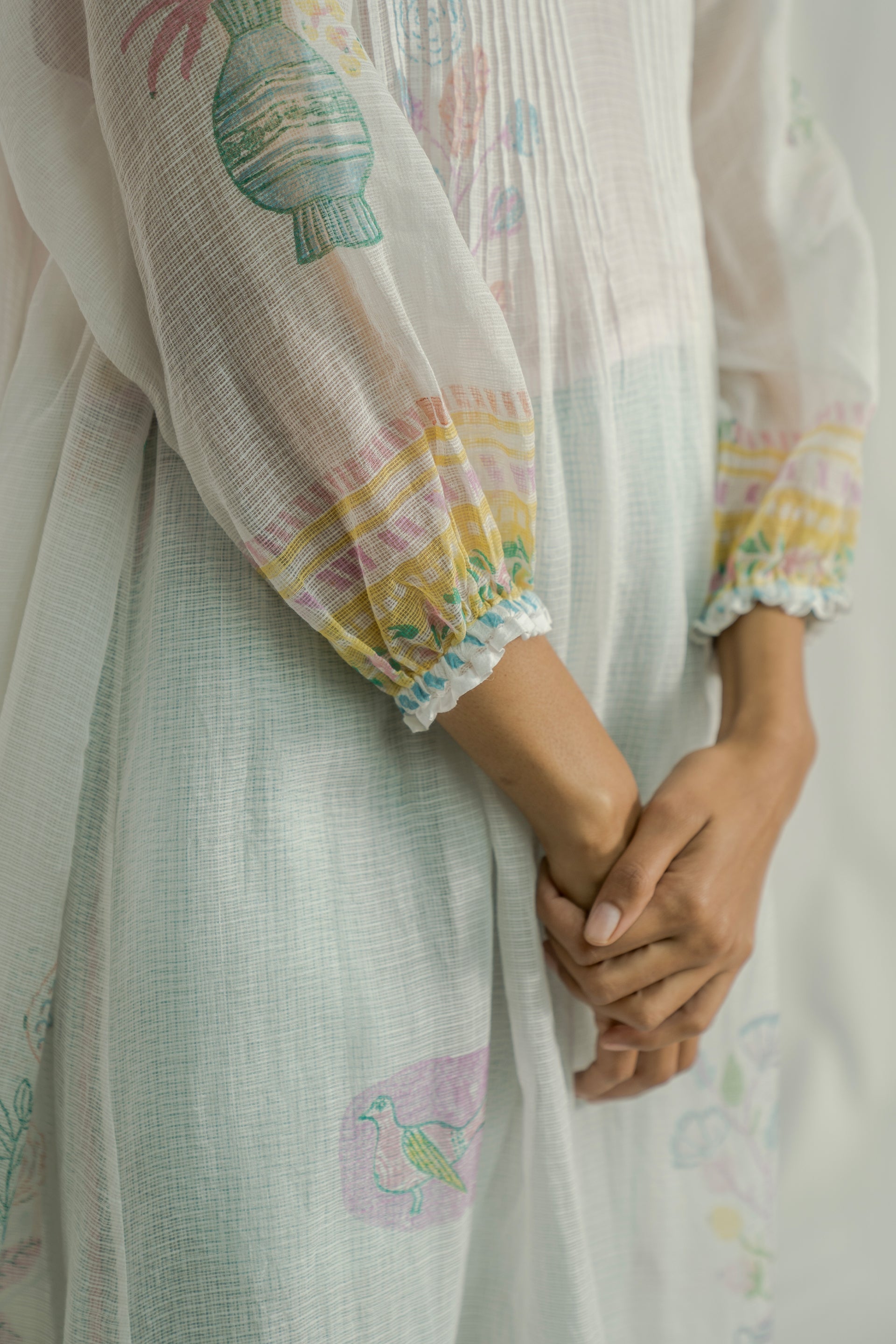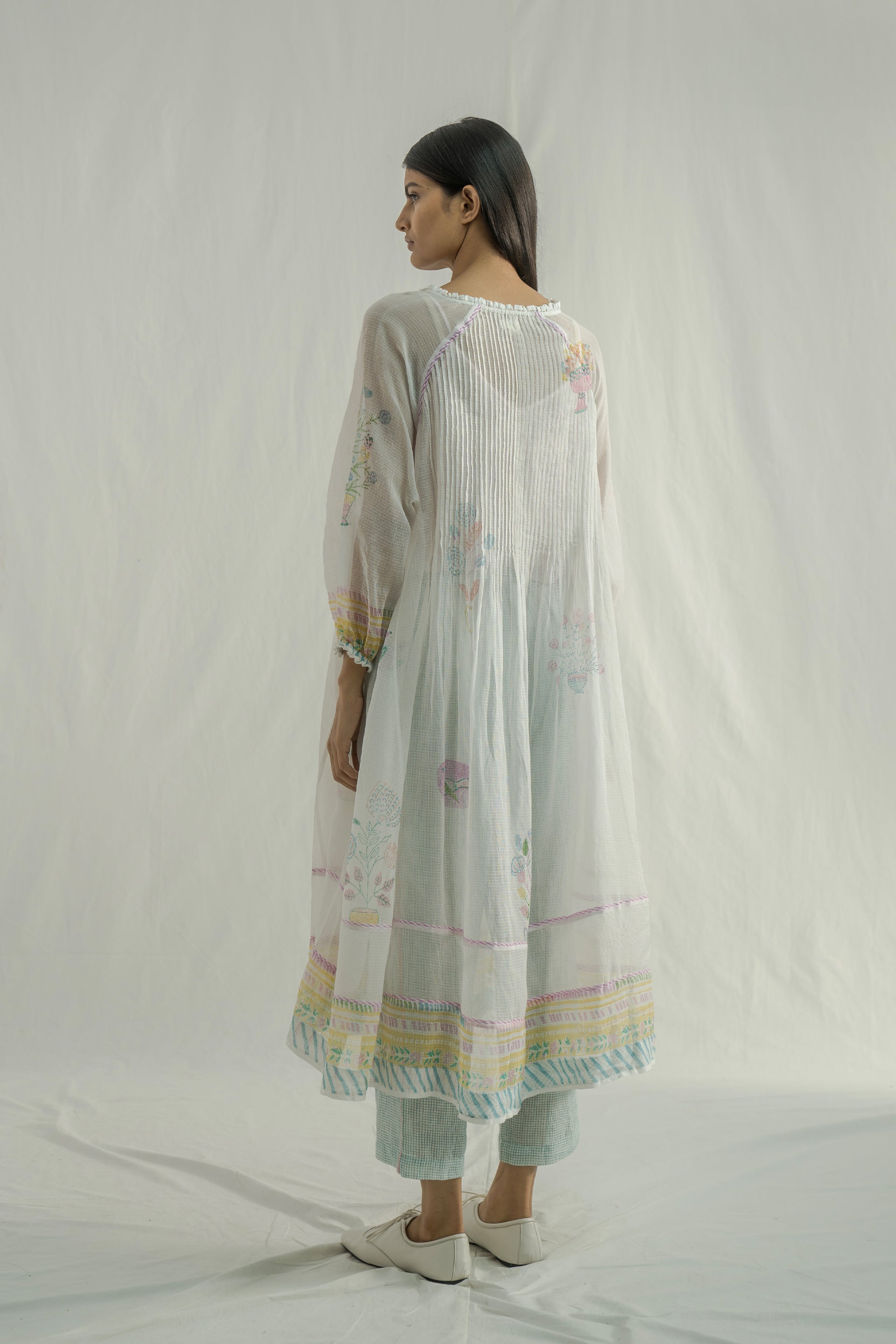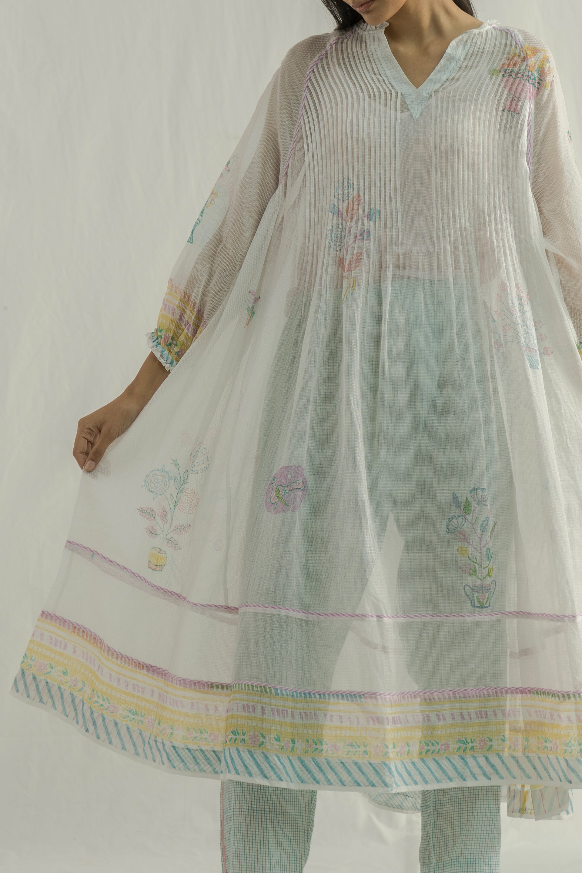A round neckline midi dress with raglan sleeves ,featuring pintucks on the bodice and striped hand-block printed piping details. Crafted from multicolor handblock printed border and all-over placement kota fabric. The dress also includes a separate lining for extra comfort.
