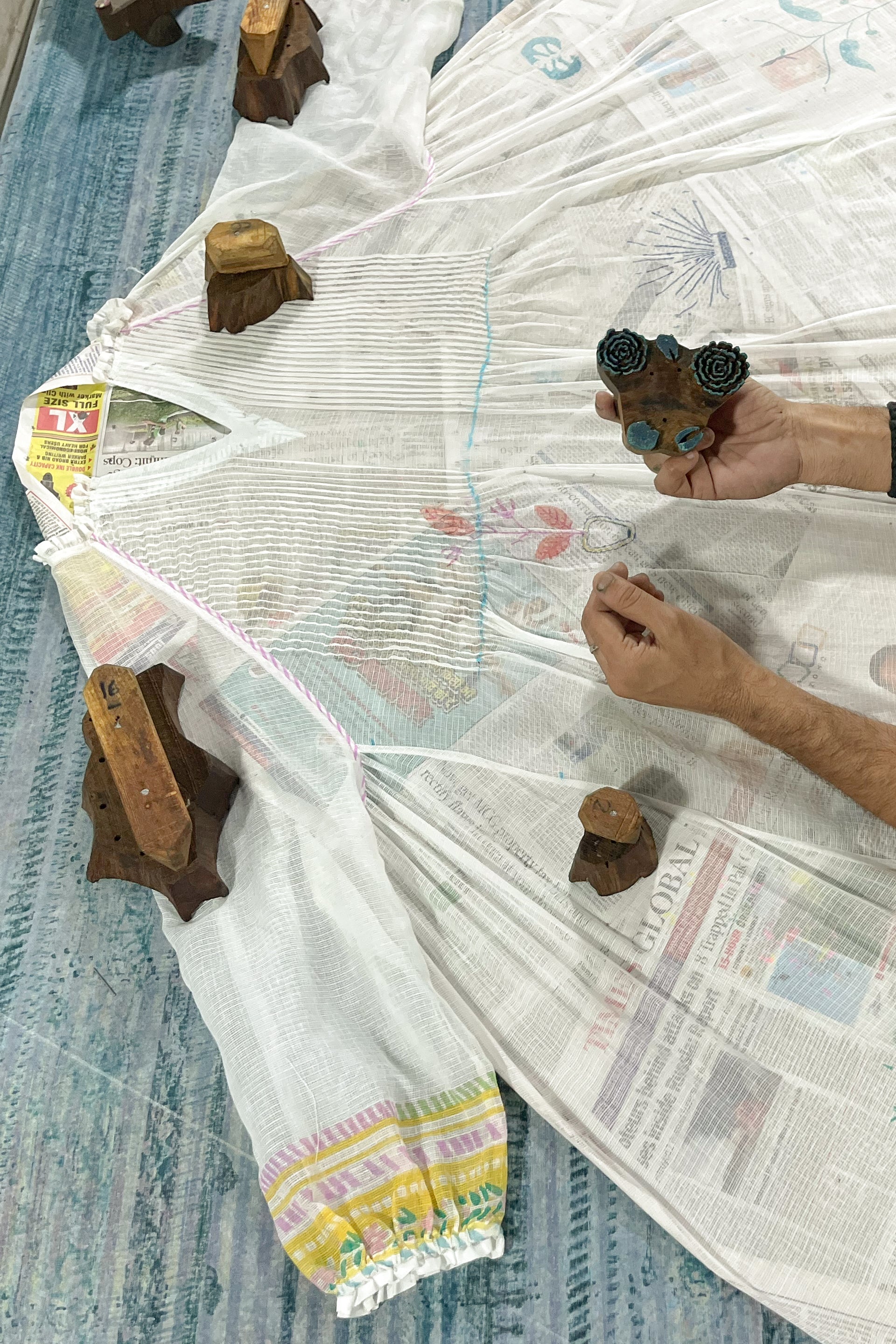 Motifs inspired by the diverse floral elements of Amer were first translated into hand-drawn watercolor paintings. These designs were then meticulously adapted into hand-carved blocks, carefully considering the limitations of the medium. The play with negative-positive space, color separation, and outlining led to both singular motifs and intricate, multi-layered repeats. As many as 80 small and large wooden blocks were used to create pattern repeats for a single garment.