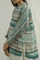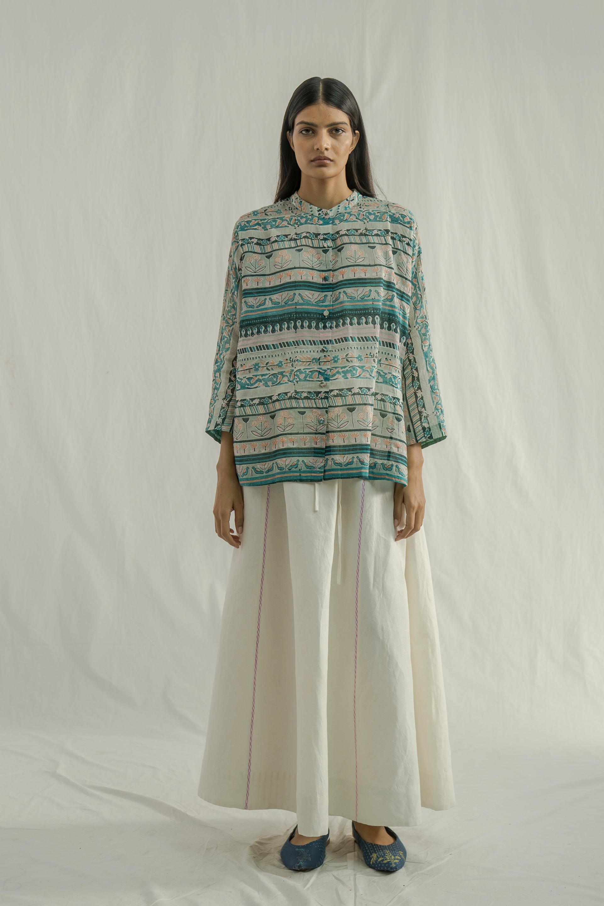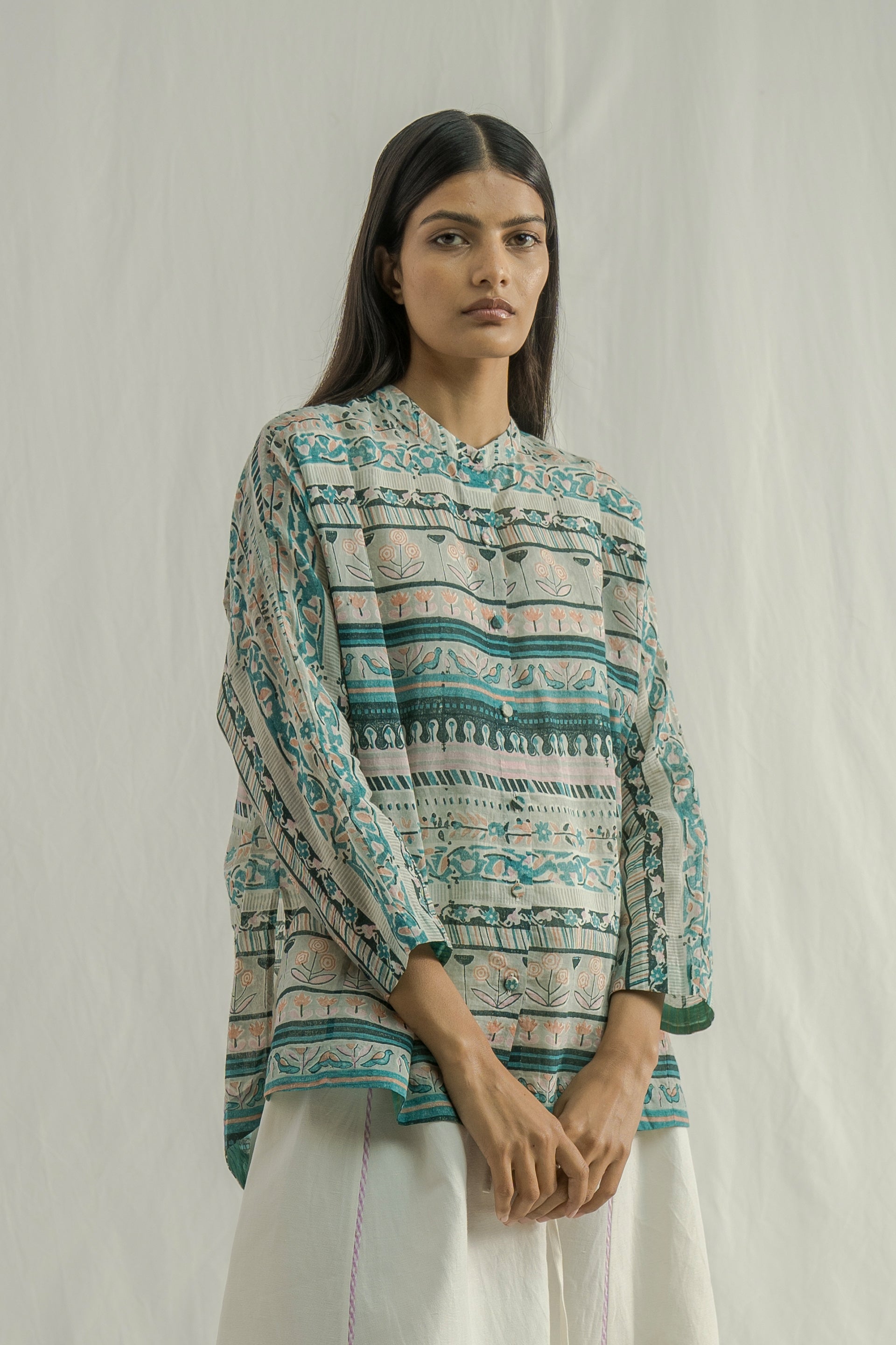 A stand collar, straight fit button down shirt with front opening and full sleeve. crafted from a cotton silk-blend fabric, featuring an all-over handblock print with 17 meticulously aligned hand blocks.