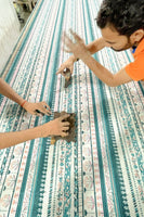 Motifs inspired by the diverse floral elements of Amer were first translated into hand-drawn watercolor paintings. These designs were then meticulously adapted into hand-carved blocks, carefully considering the limitations of the medium. The play with negative-positive space, color separation, and outlining led to both singular motifs and intricate, multi-layered repeats. As many as 80 small and large wooden blocks were used to create pattern repeats for a single garment.