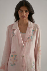 Motifs inspired by the diverse floral elements of Amer were first translated into hand-drawn watercolor paintings. These designs were then meticulously adapted into hand-carved blocks, carefully considering the limitations of the medium. The play with negative-positive space, color separation, and outlining led to both singular motifs and intricate, multi-layered repeats. As many as 80 small and large wooden blocks were used to create pattern repeats for a single garment.