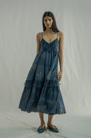 A midi dress with an adjustable strap and a flattering v-neckline , featuring gathered tiers and ruffled embroidery inserts. crafted from a 100% cotton silk blend , The fabric features a collage pattern in handblock print, beautifully complemented by scattered multicolor floral embroidery . The embroidery inserts are meticulously hand-cut and carefully inserted into the dress, creating a refined and polished finish as well as the hem is delicately adorned with scalloped embroidery in a tonal hue.