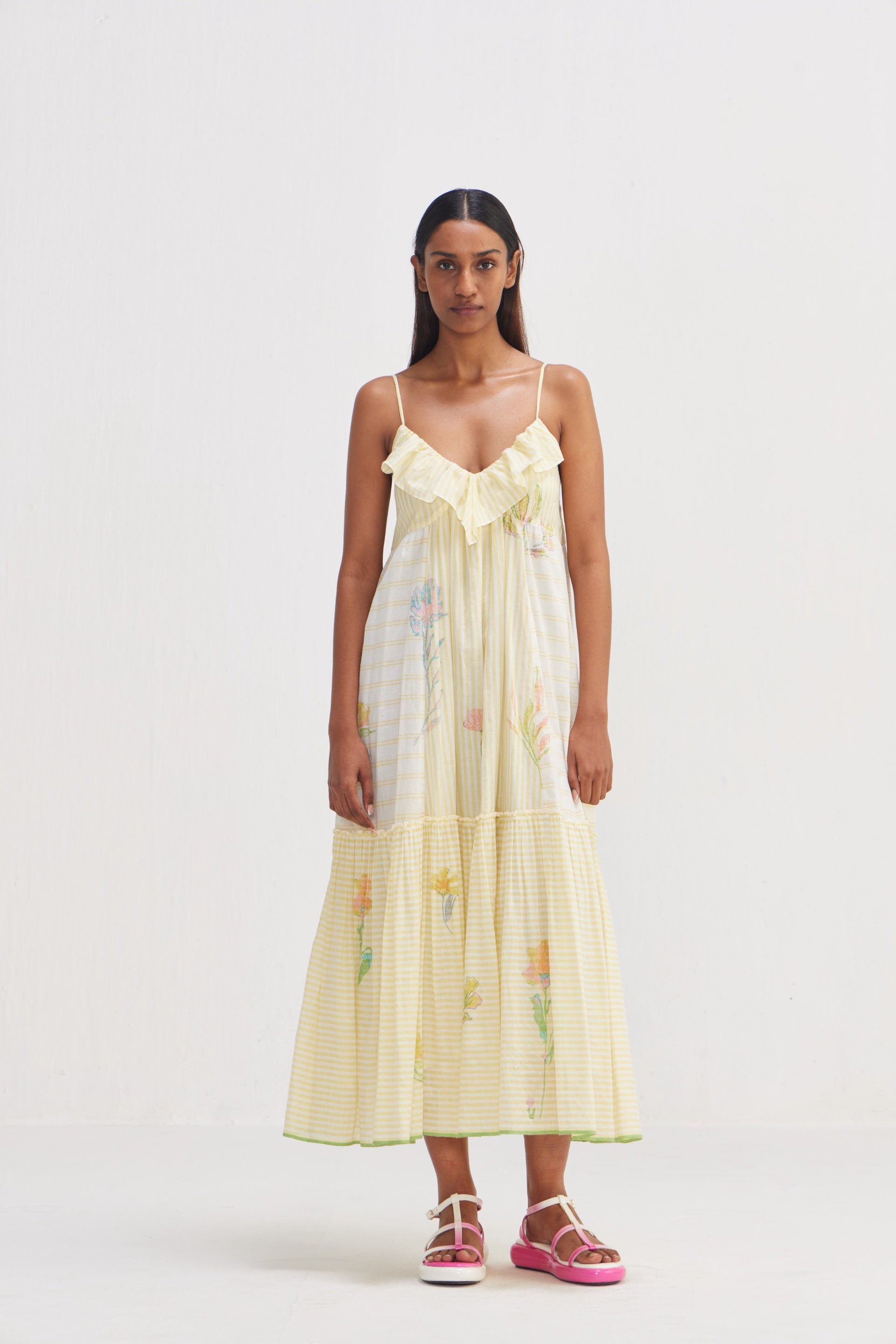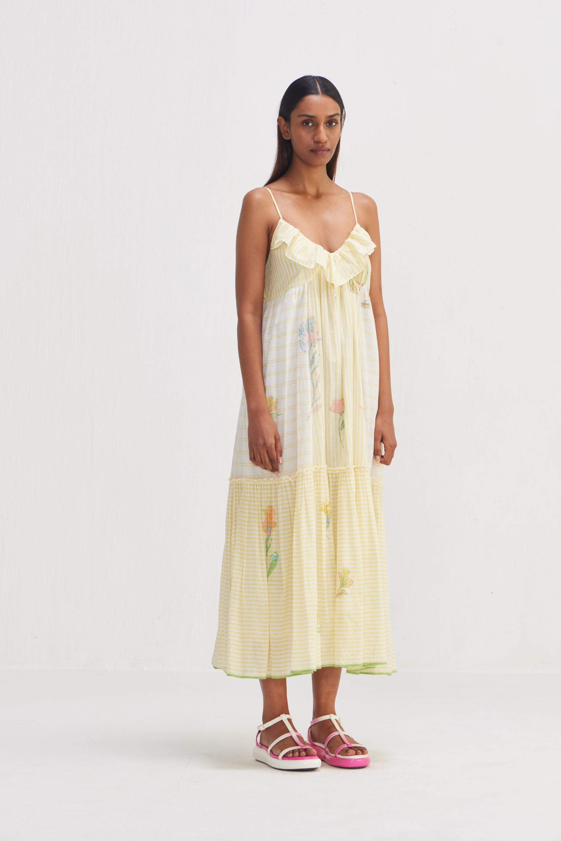 Sleeveless spaghetti strap dress in striper mix and multicolor placement chunky floral hand block print pattern. From the hand-woven cotton to the intricately block-printed florals, every element is crafted with precision and care. With ruffle detail on the neckline, the dress consist of 5 floral hand block printed placement, where 3-4 blocks are used to complete the pattern. Hand-woven cotton tiered dress with patchwork with selvedge detail on the hem. Comes with an attached hand block text printed lining.