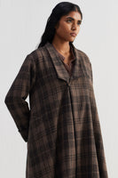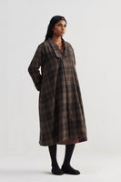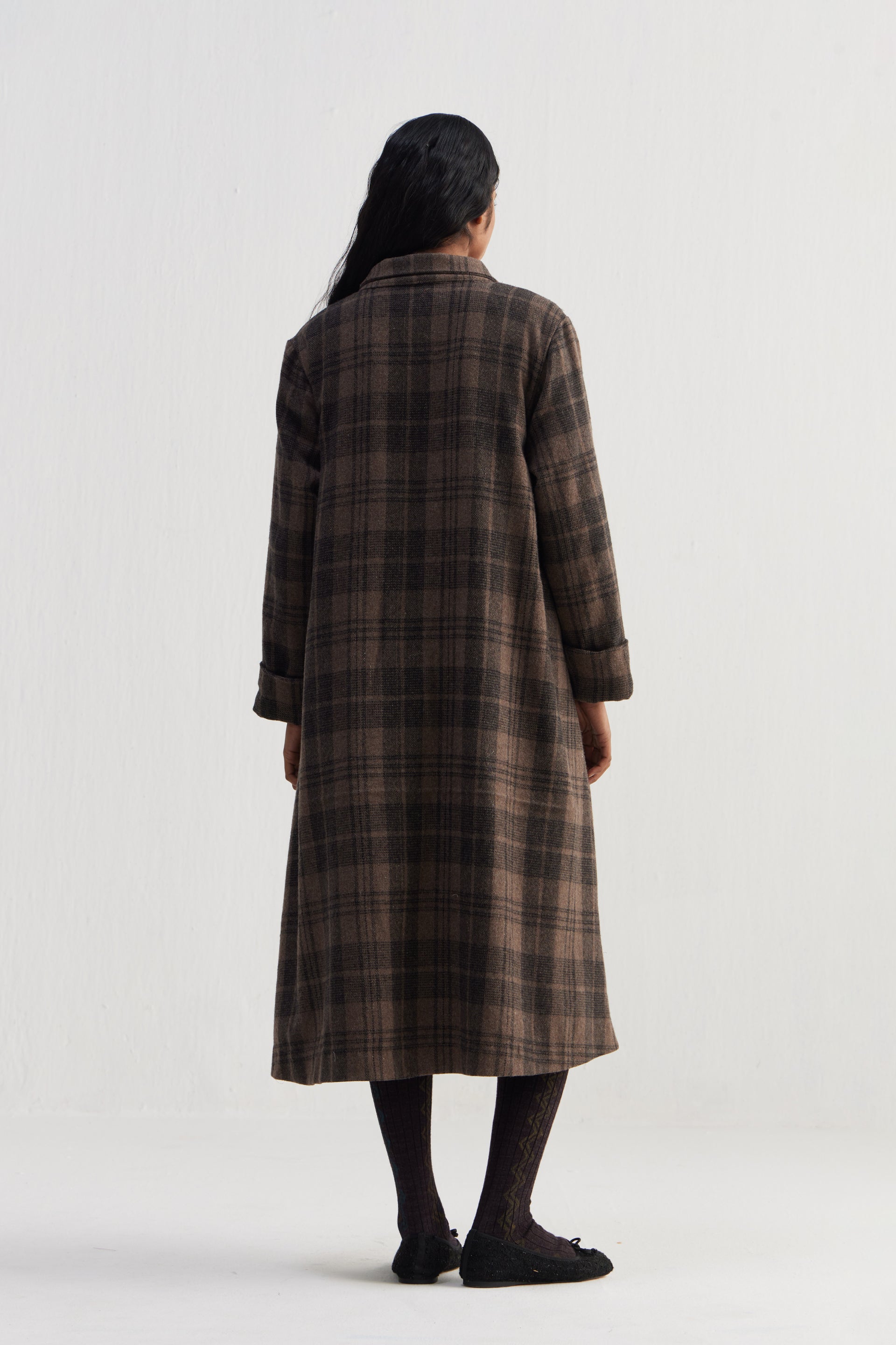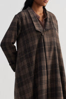 Oversize A-line cut shawl collar single button closure long jacket with full sleeves. Constructed in tone-on-tone thick and thin checkered 100% wool fabric. Finished with contrast collage print 100% silk facing.