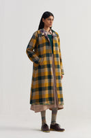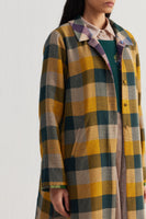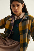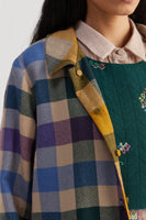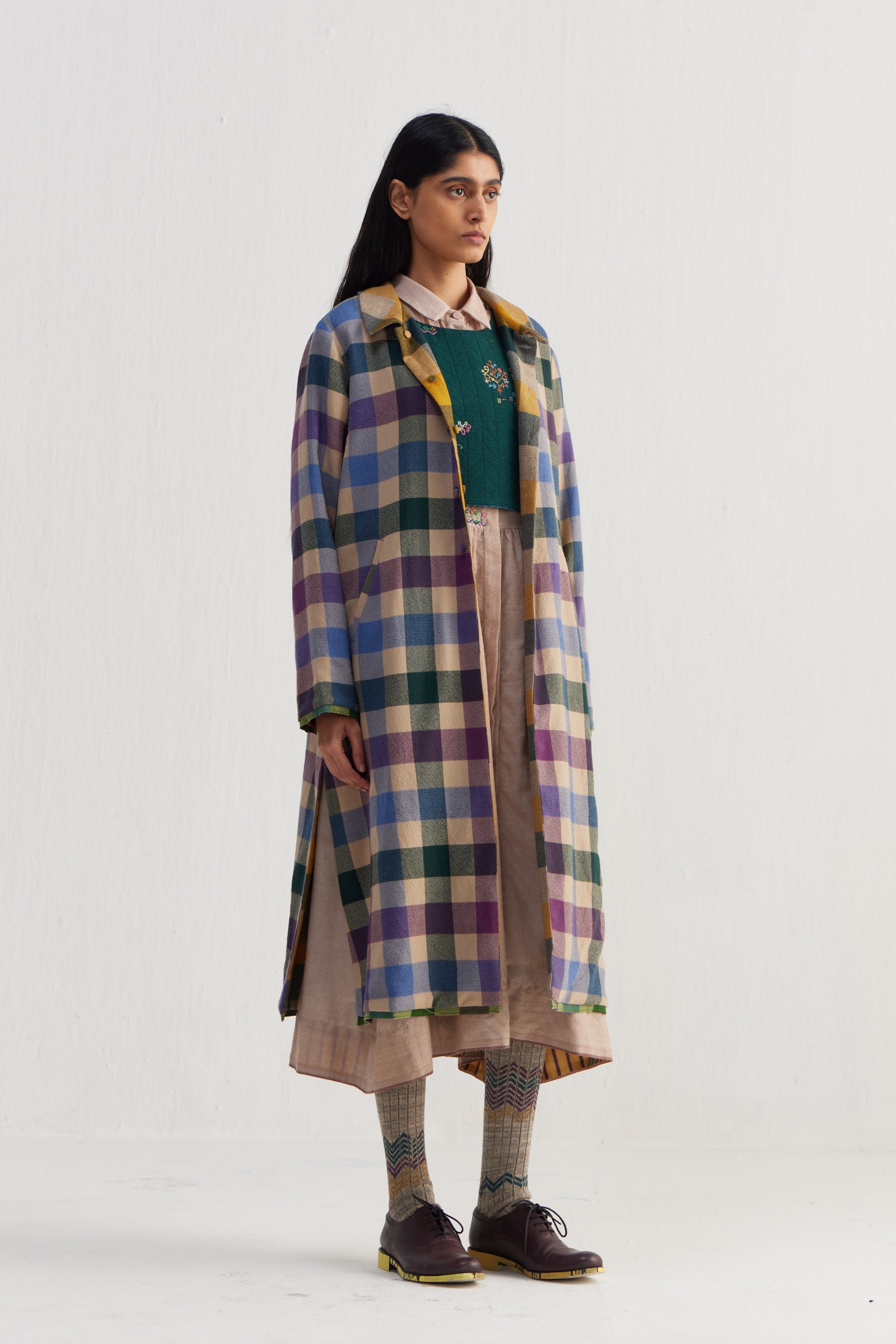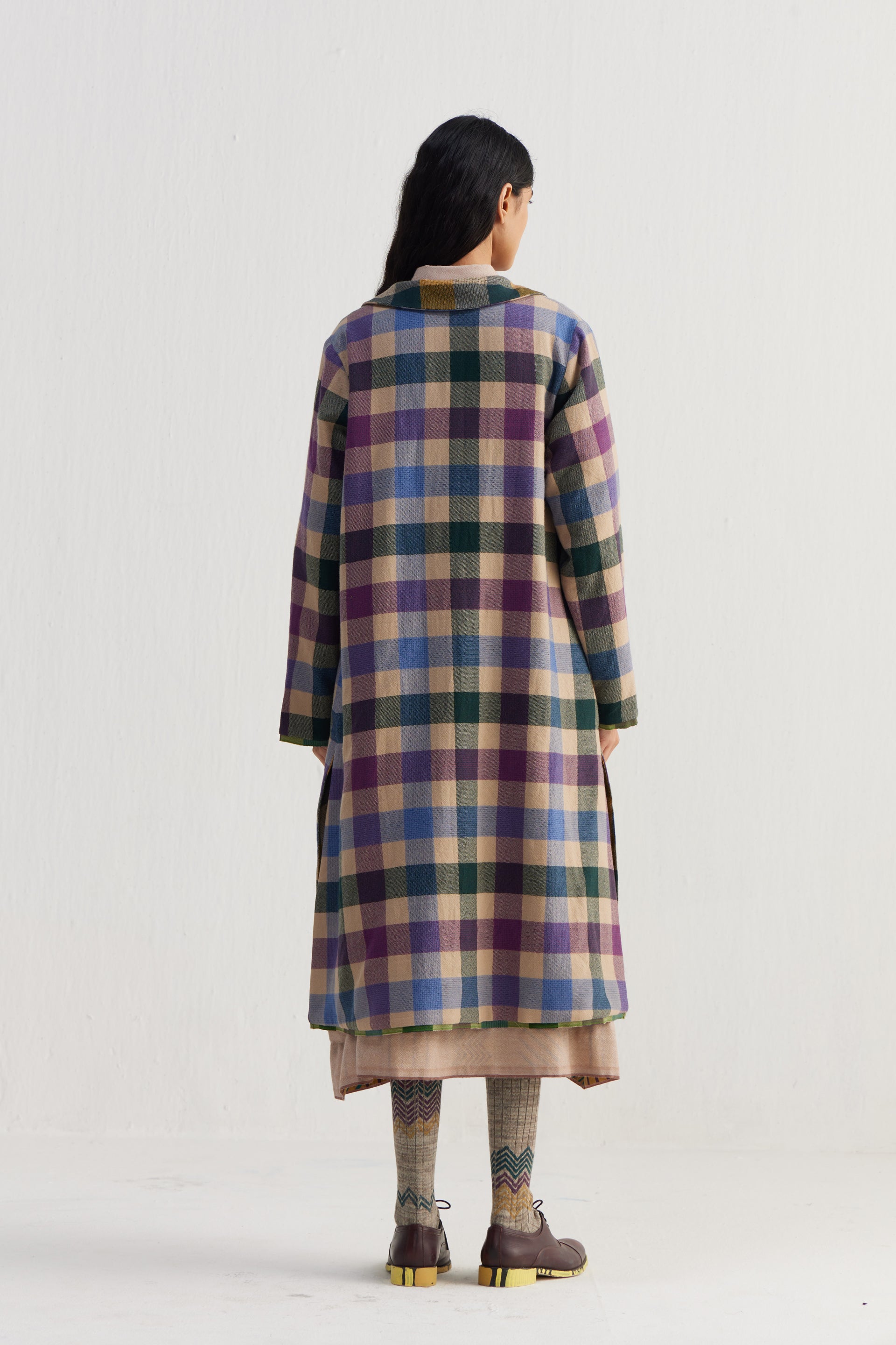 Reversible straight fit flat collar button down full sleeves jacket. Constructed in multicolor checkered 100% merino wool fabric. Finished with tonal selvedge detail insert on hem and sleeves.