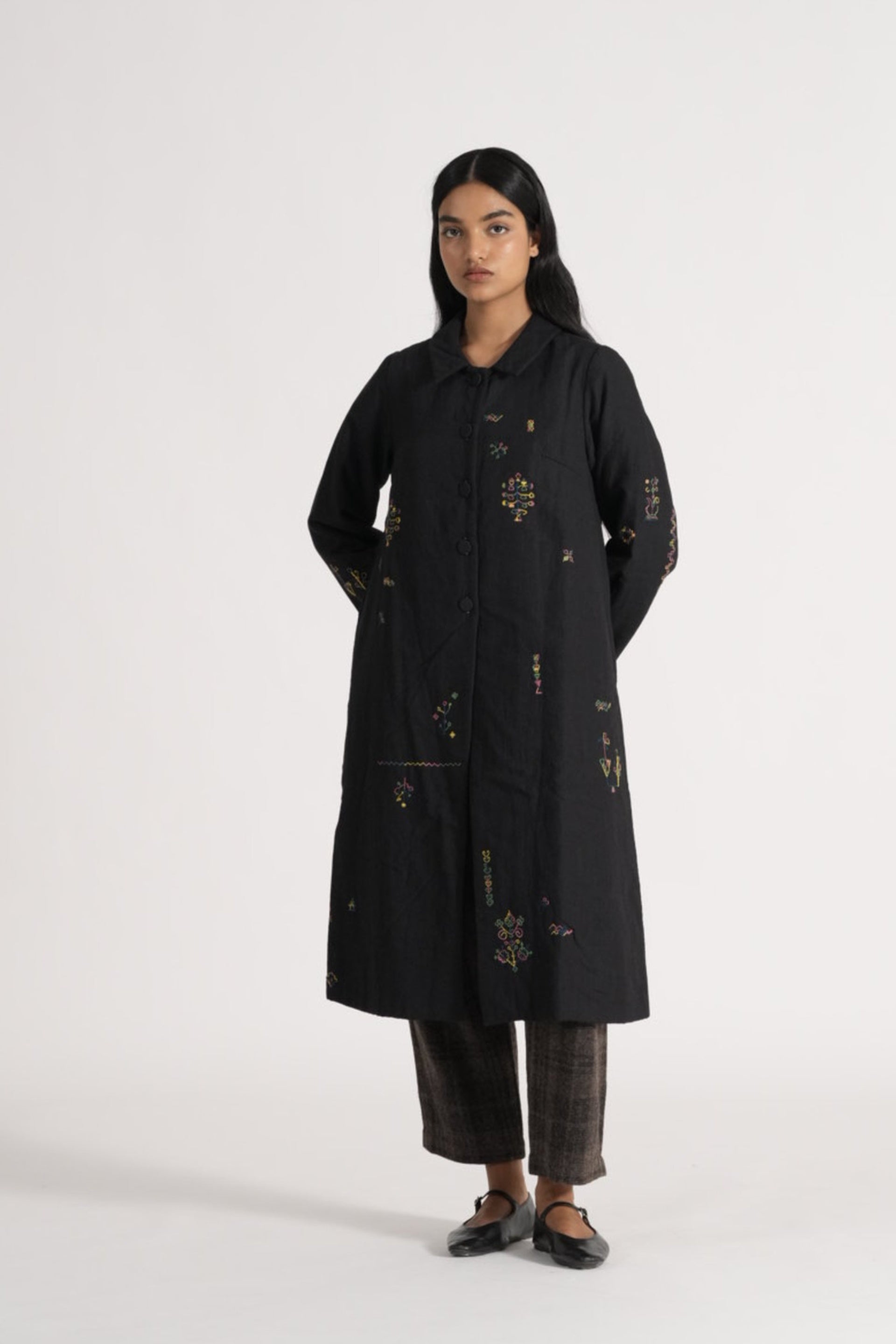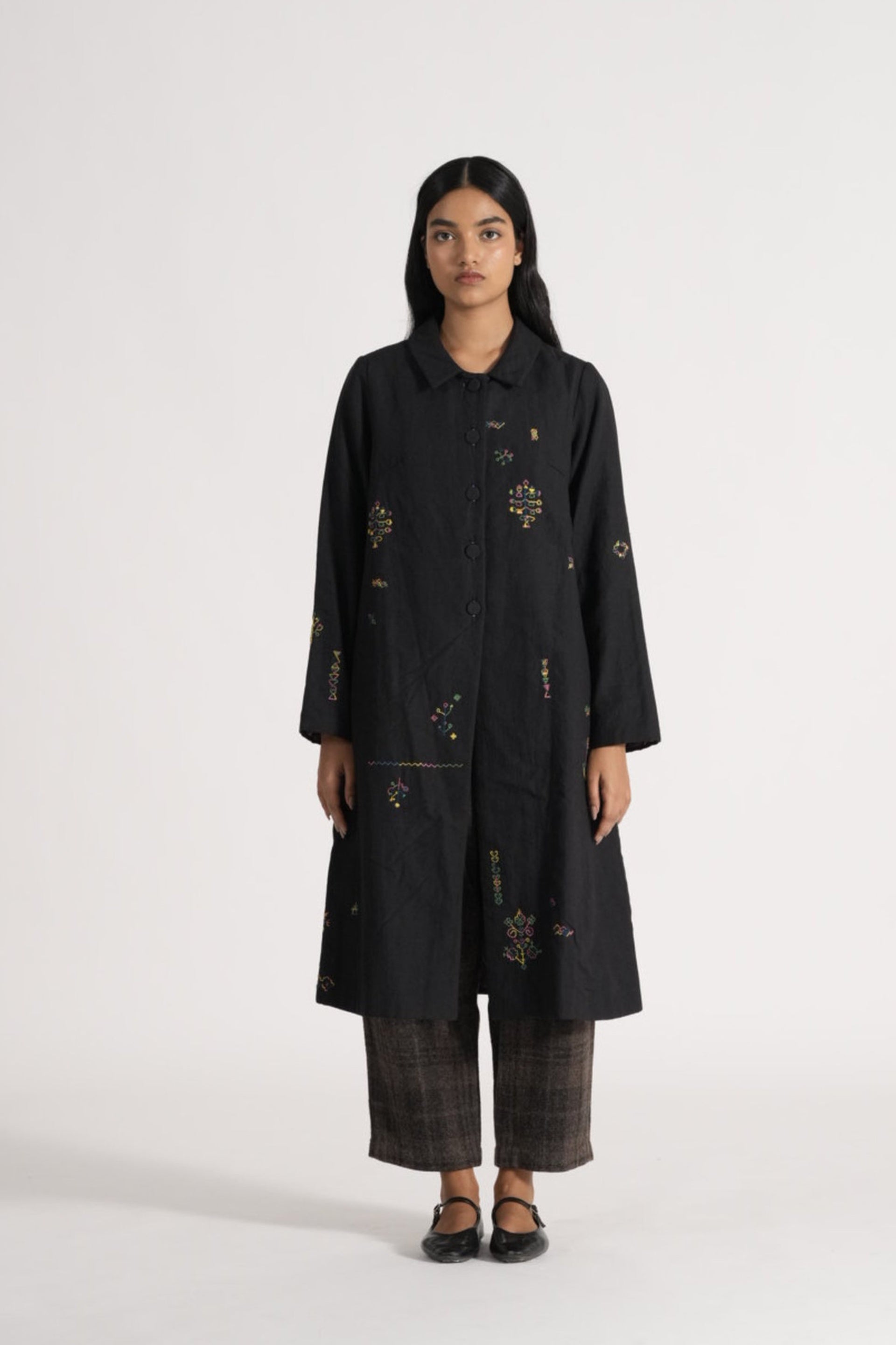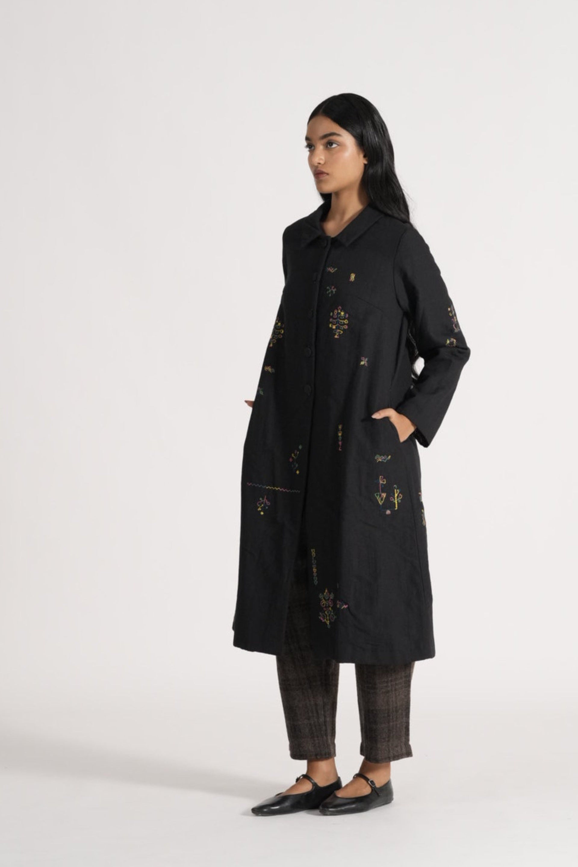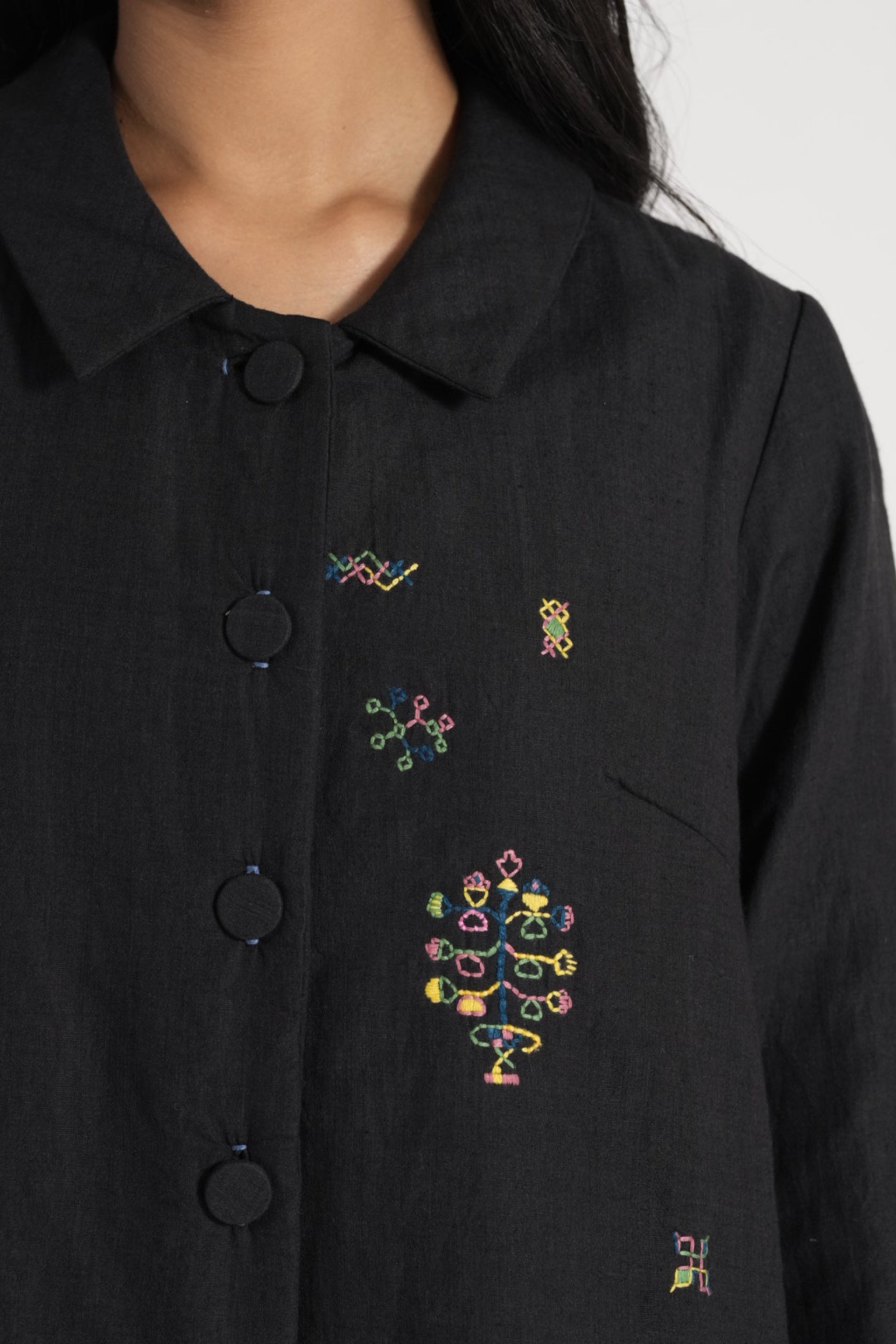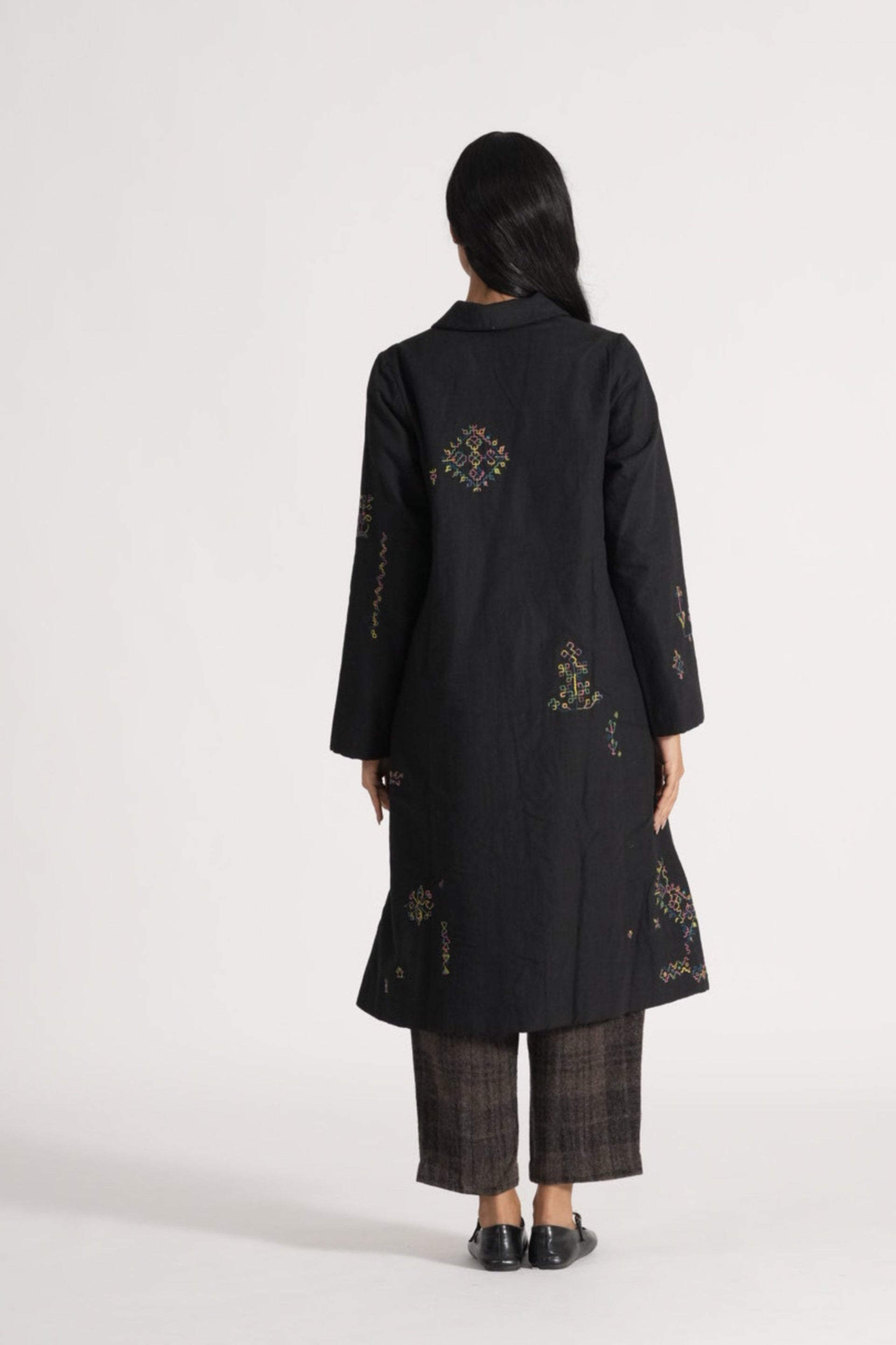 Straight fit button down jacket in placement delicate kasuti hand embroidery on quilted wool silk linen. Lind with handblock print silk lining.