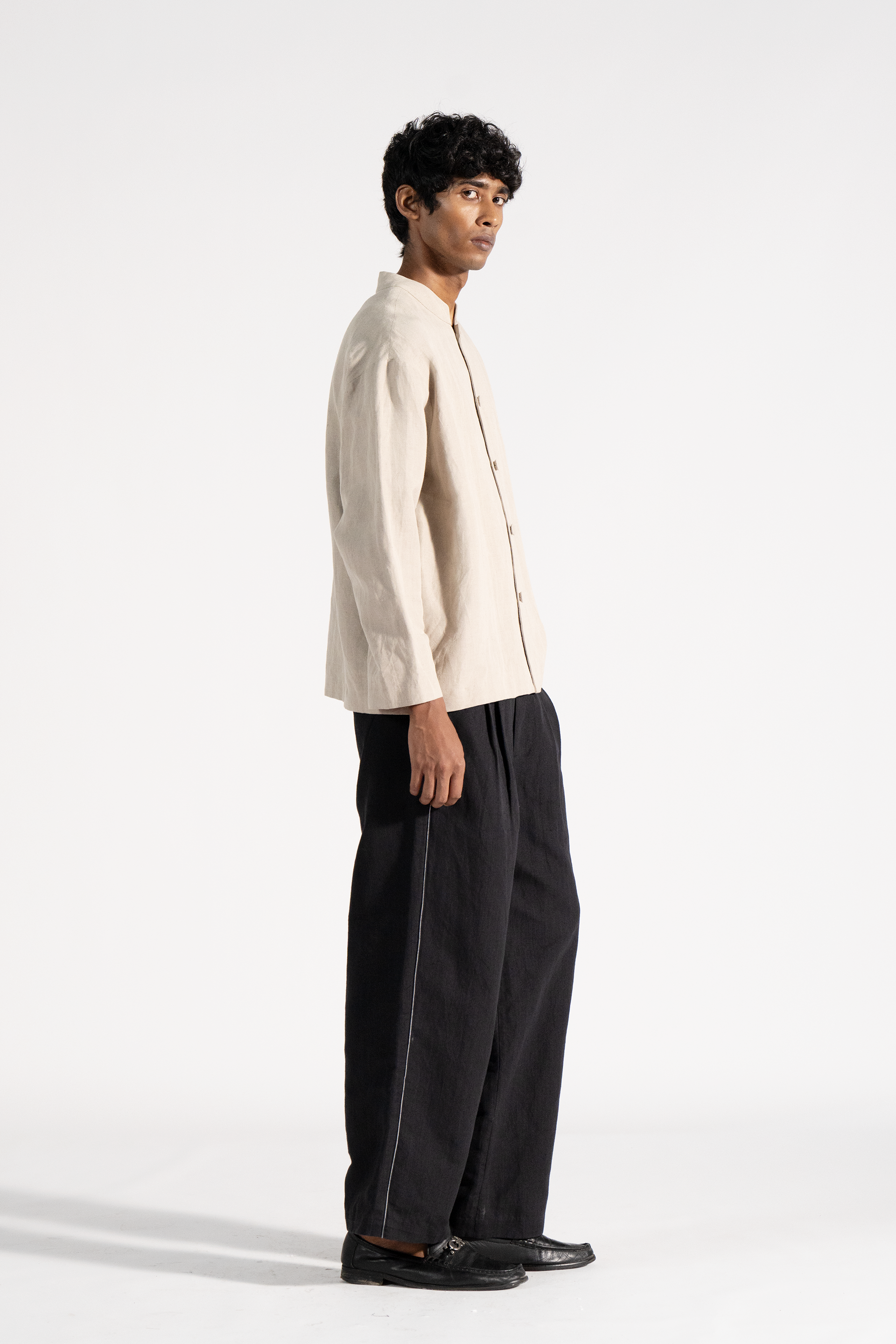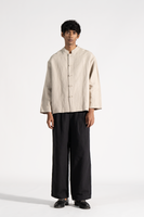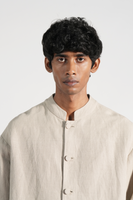 Stand collar relaxed fit button down jacket with side seam pockets in cotton linen fabric comes with an attached hand block print silk lining.