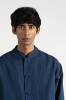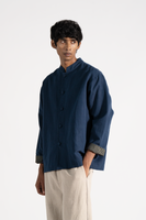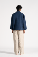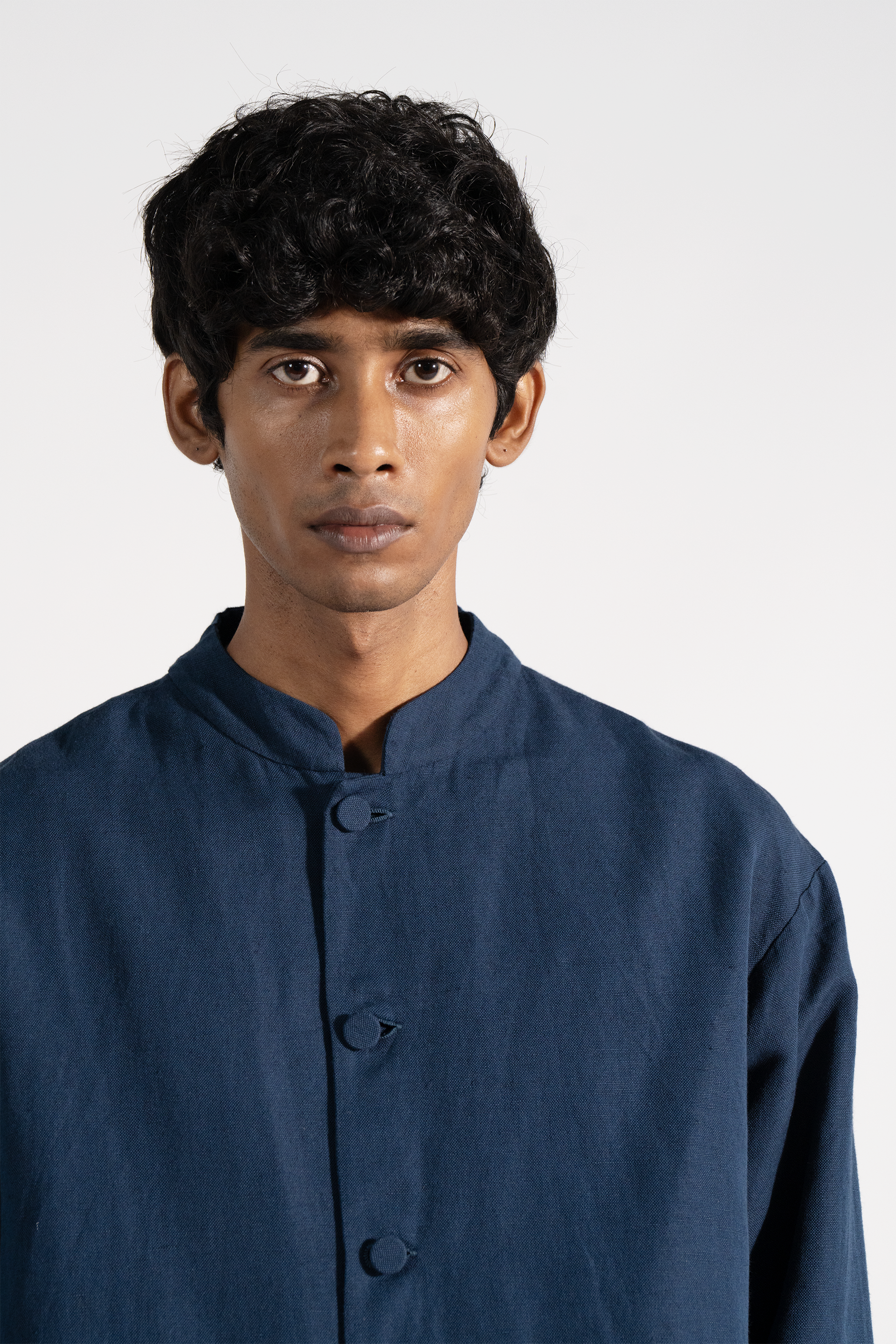 Stand collar relaxed fit button down jacket with side seam pockets in cotton linen fabric comes with an attached hand block print silk lining.