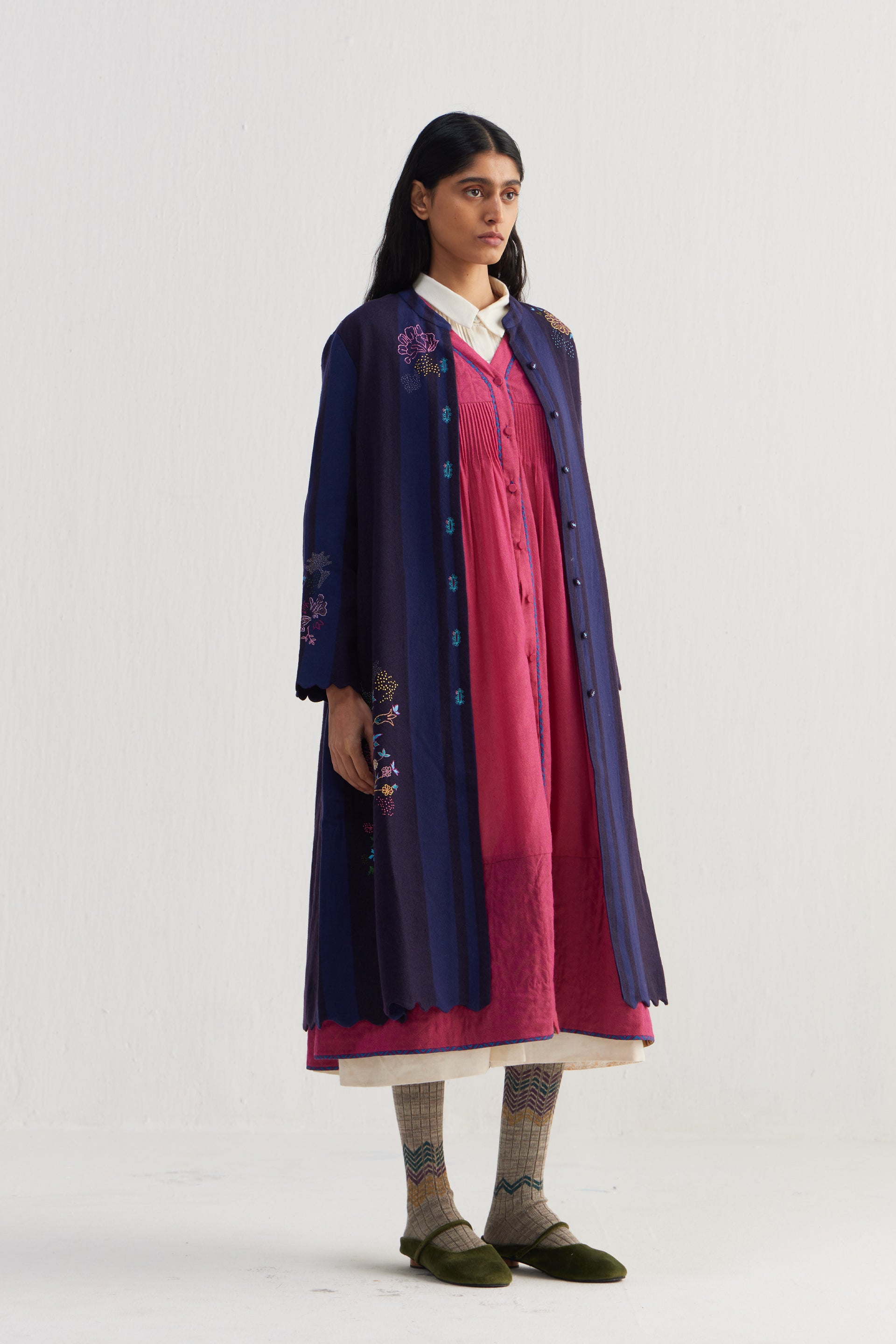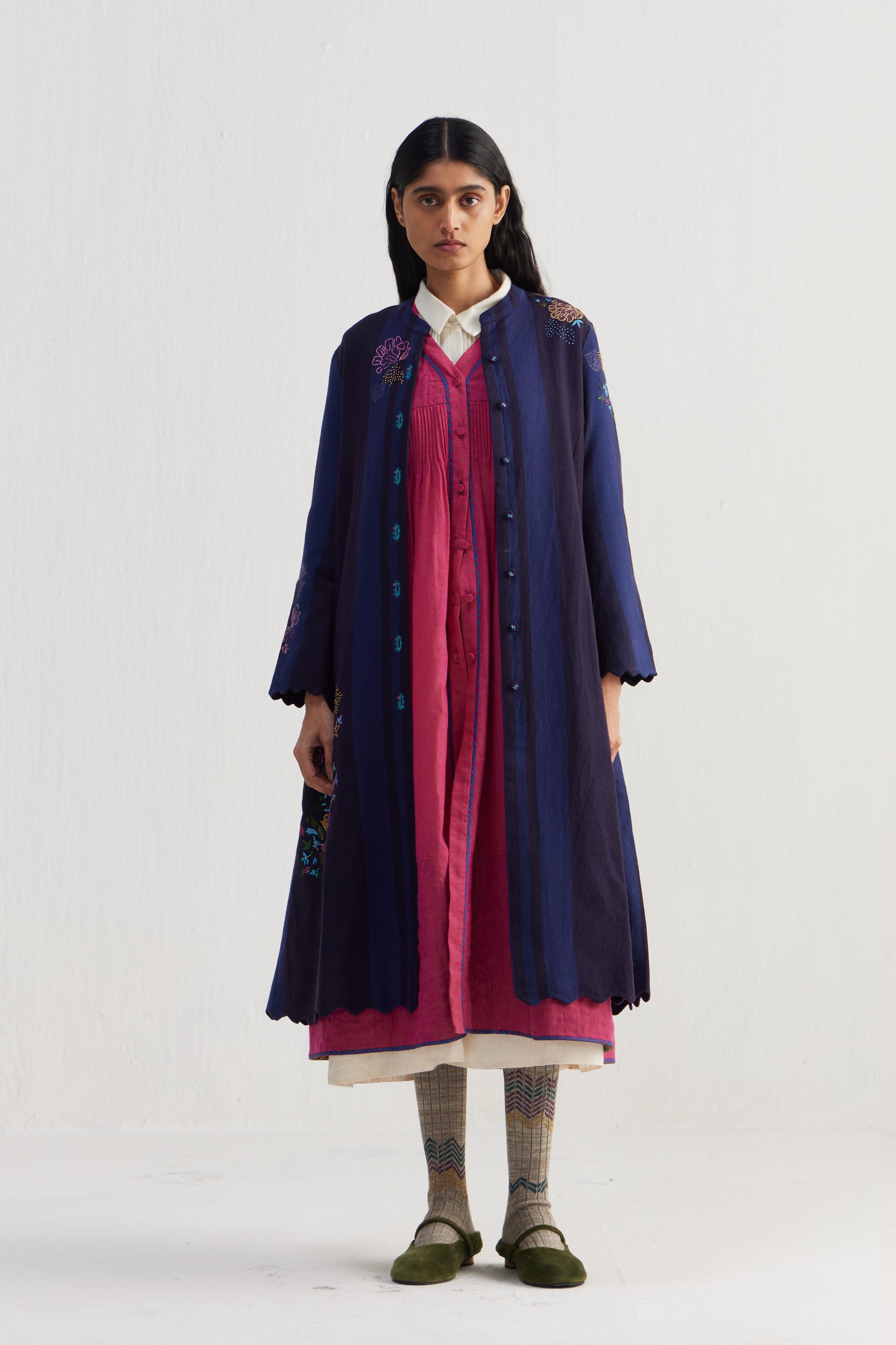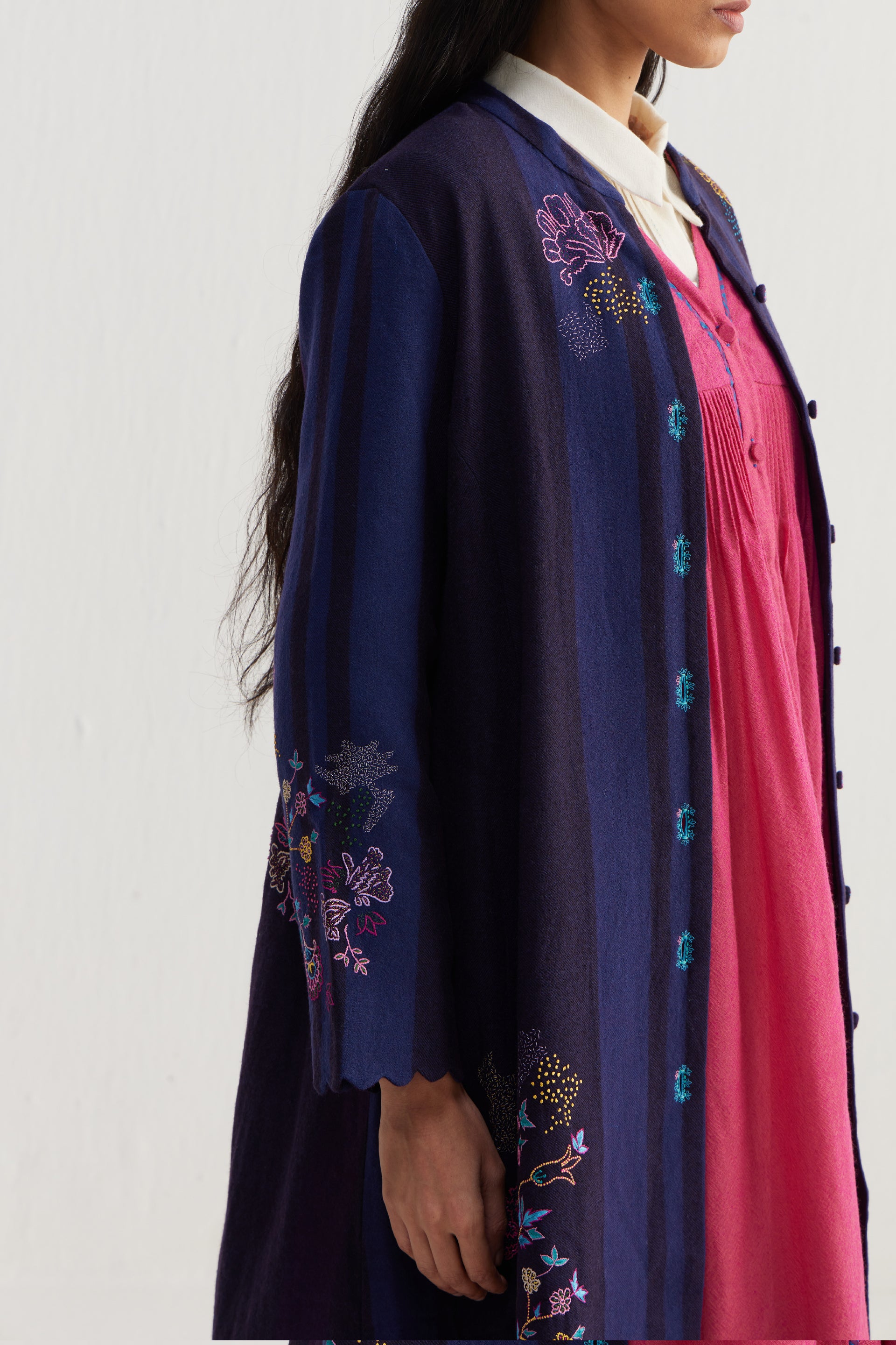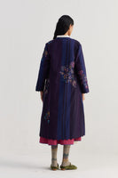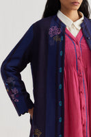 Straight fit mandarin collar full sleeves midi jacket with scallop detail on hem. Constructed in placement intricate Sozni motifs hand embroidery on 100% merino wool fabric. Finished with contrast collage hand block print 100% silk lining.