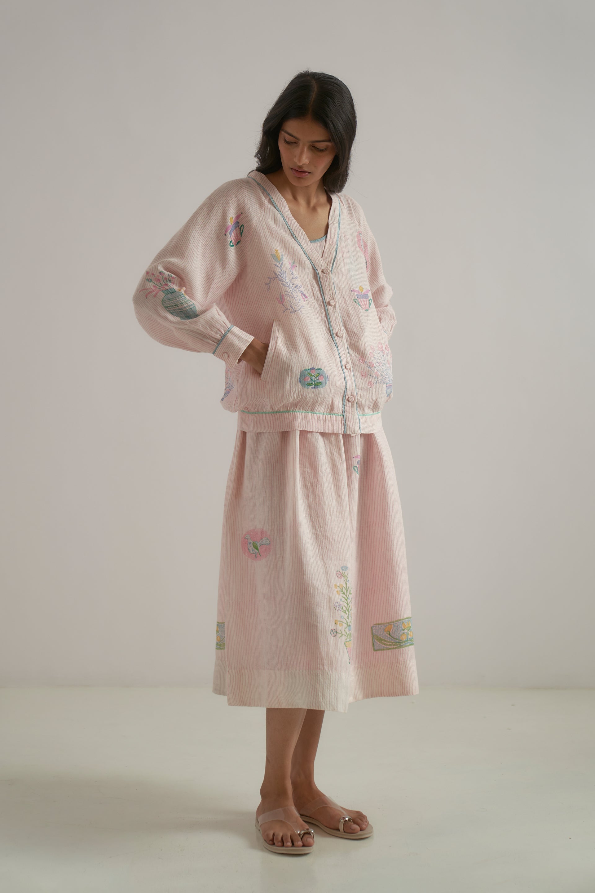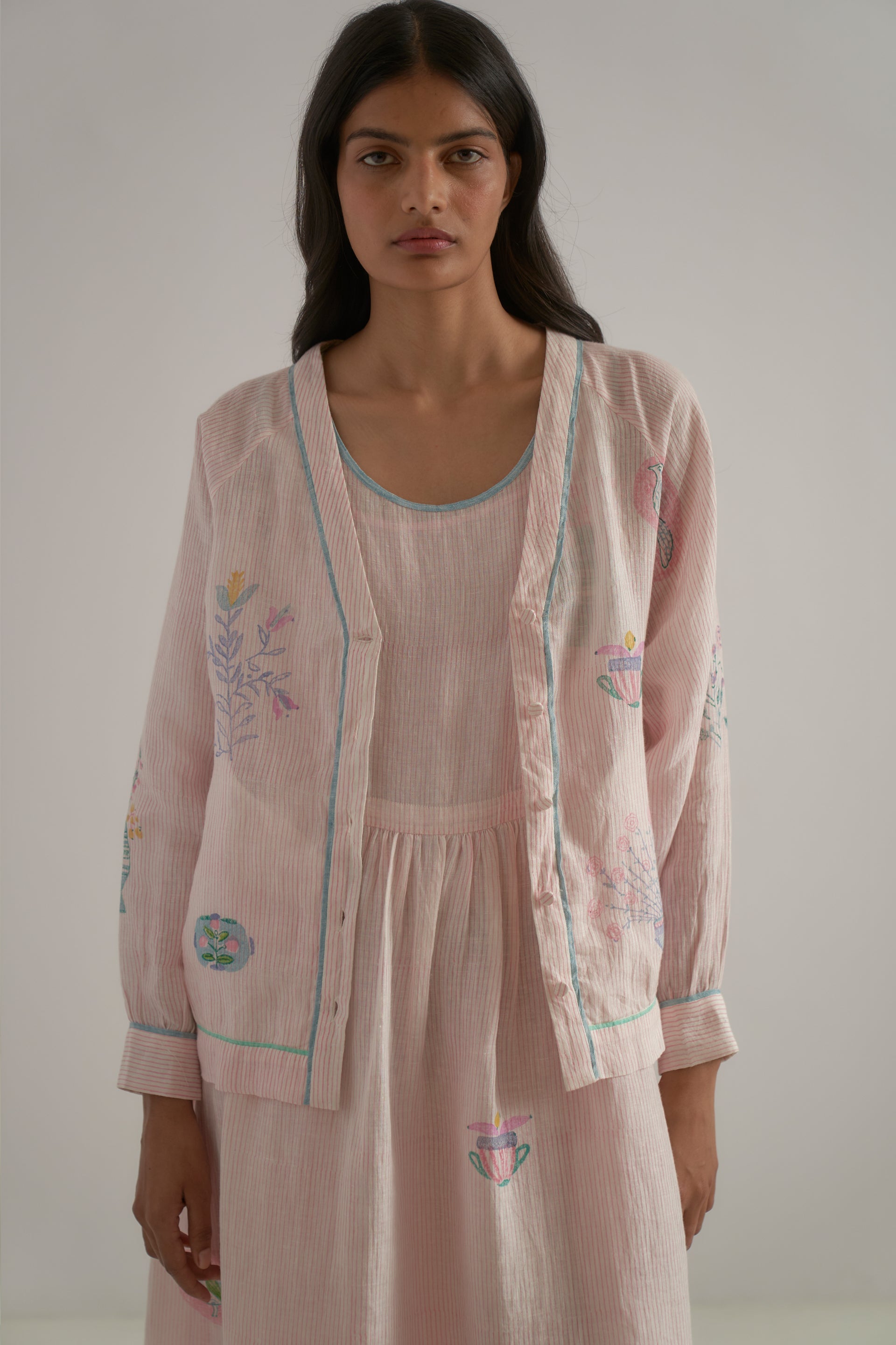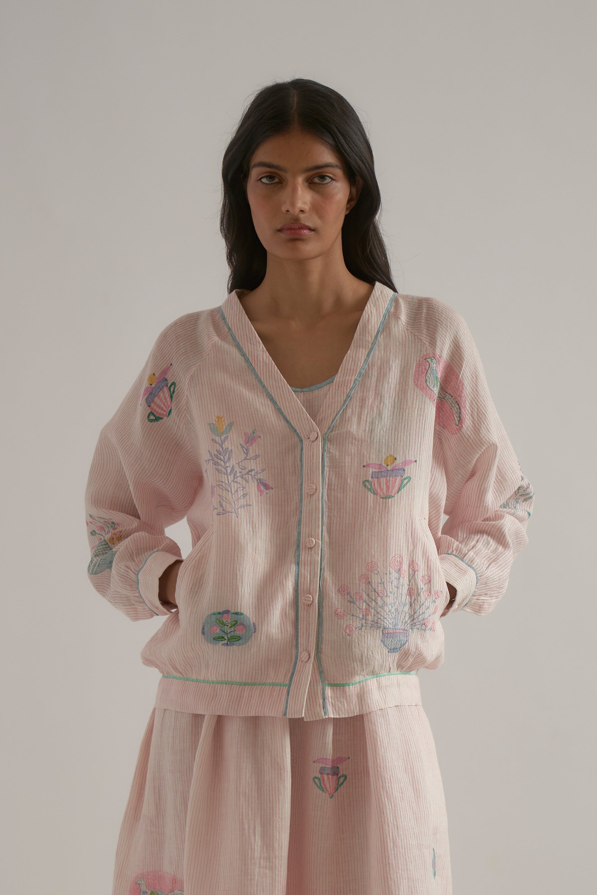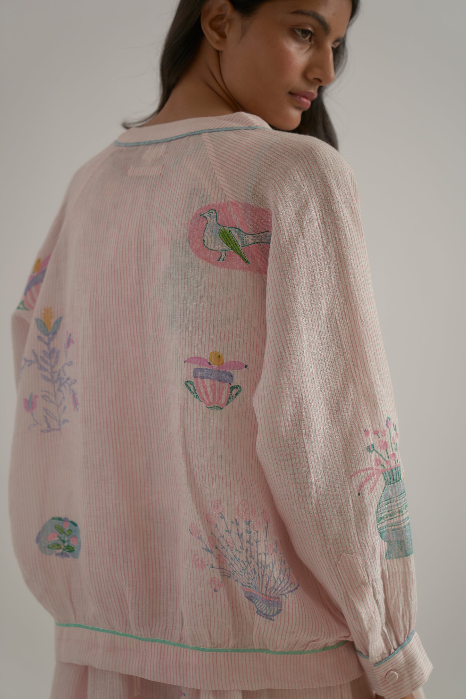 Short bomber front-open button-down jacket with a v-neckline and contrast selvedge detail. crafted from fine checks and multicolor placement handblock print, made with 100% linen fabric