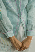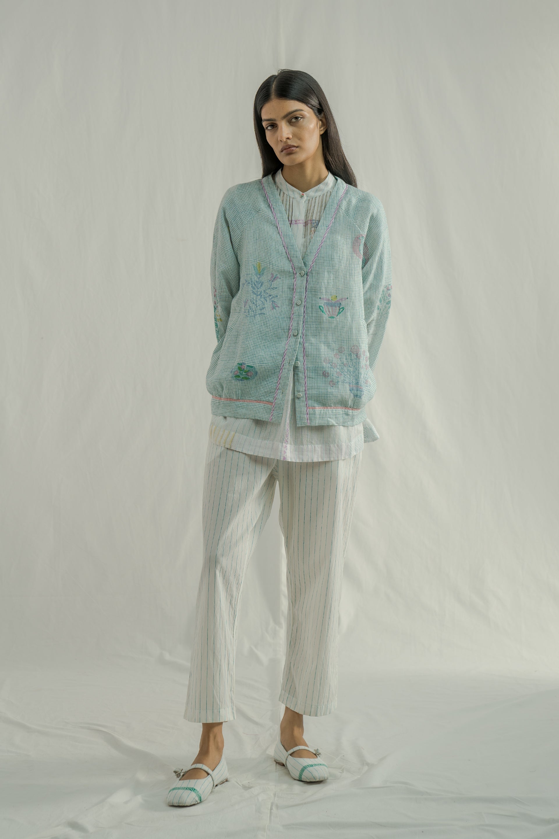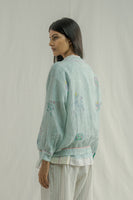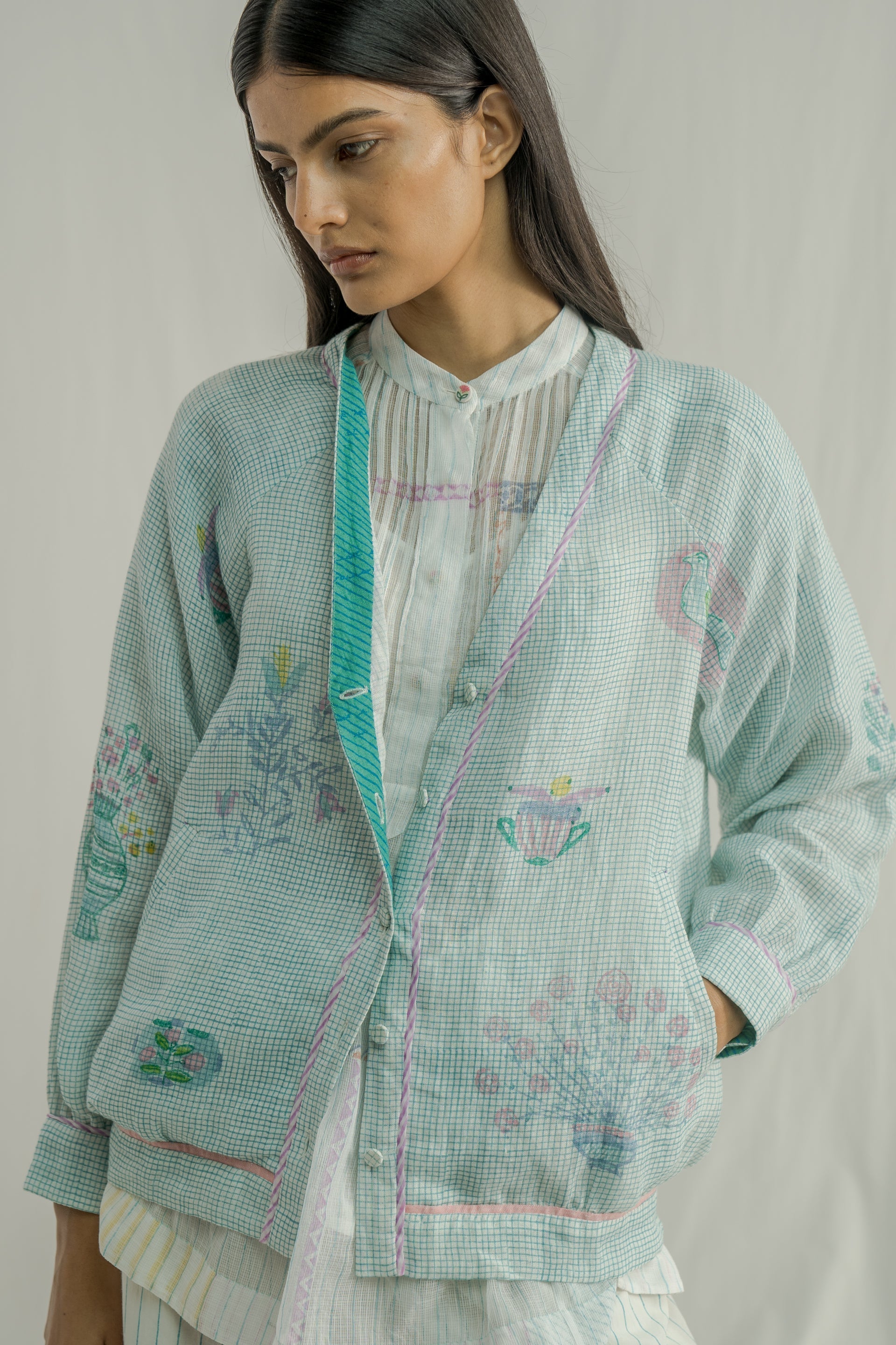 Short bomber front-open button-down jacket with a v-neckline and contrast selvedge detail. crafted from fine checks and multicolor placement handblock print, made with 100% linen fabric