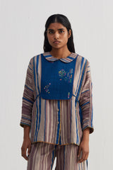 Reversible round neckline front open button down full sleeves jacket with all over quilting, with front welt pocket and drawstring detail on hem. Constructed in multicolor checkered 100% merino wool and solid 100% silk fabric.