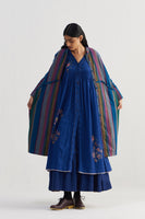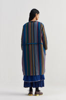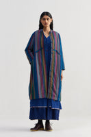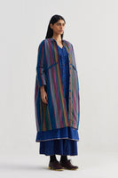 Baggy fit stand collar front open button down full sleeves jacket with high-low waist line cut detail. Constructed in hand quilted multicolor striper 100% merino wool and 100% silk fabric. Finished with solid 100% silk lining and piping insert detail on the seam.