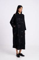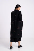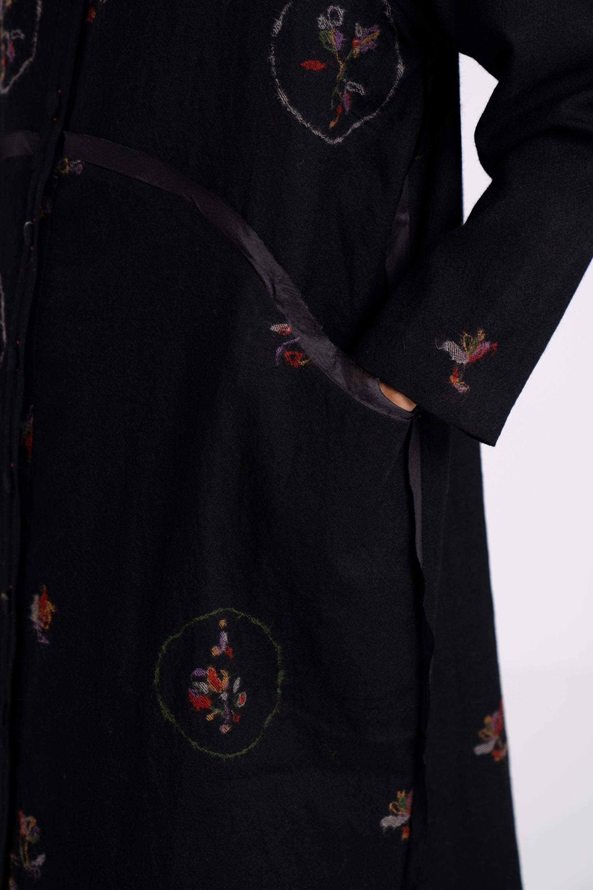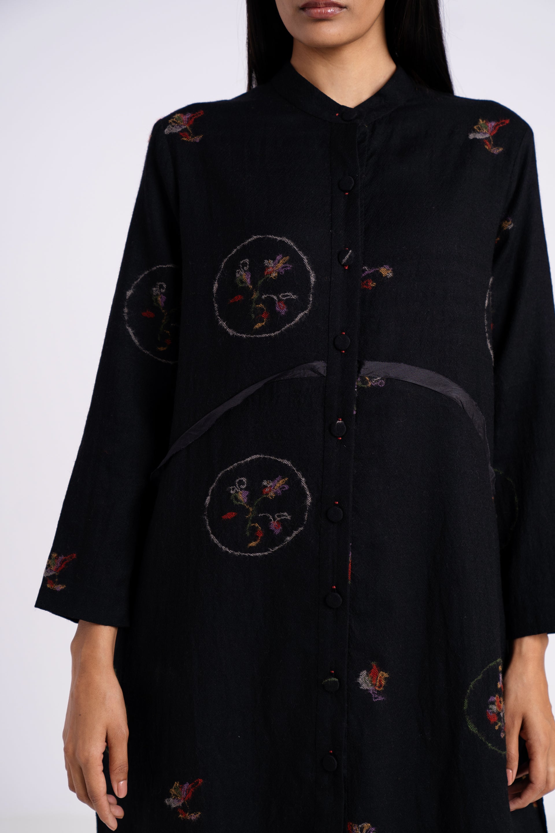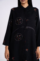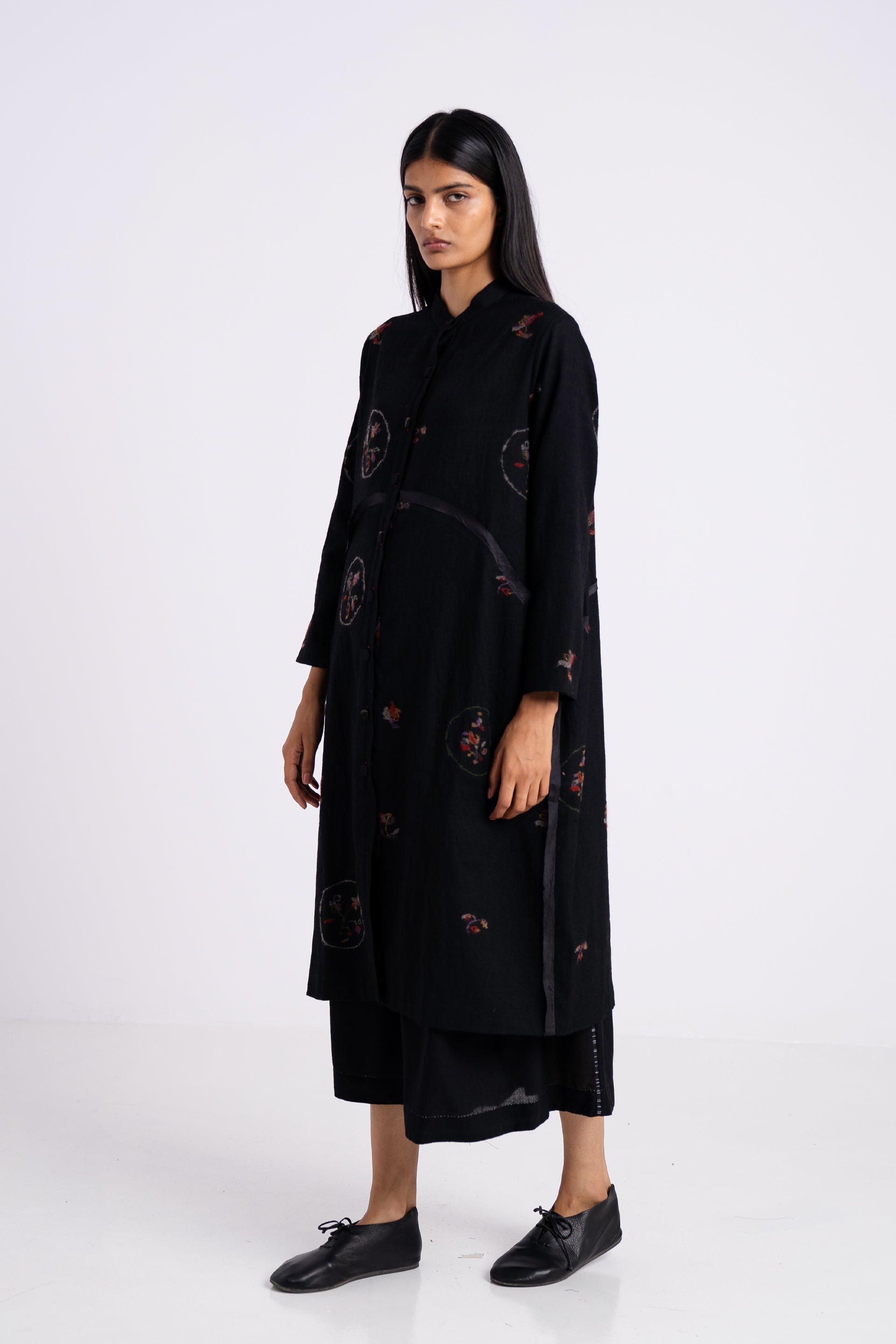 Baggy fit stand collar front open button down full sleeves jacket with high-low waist line cut detail. Constructed in 100% wool Finished with solid 100% silk lining and piping insert detail on the seam.