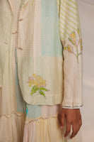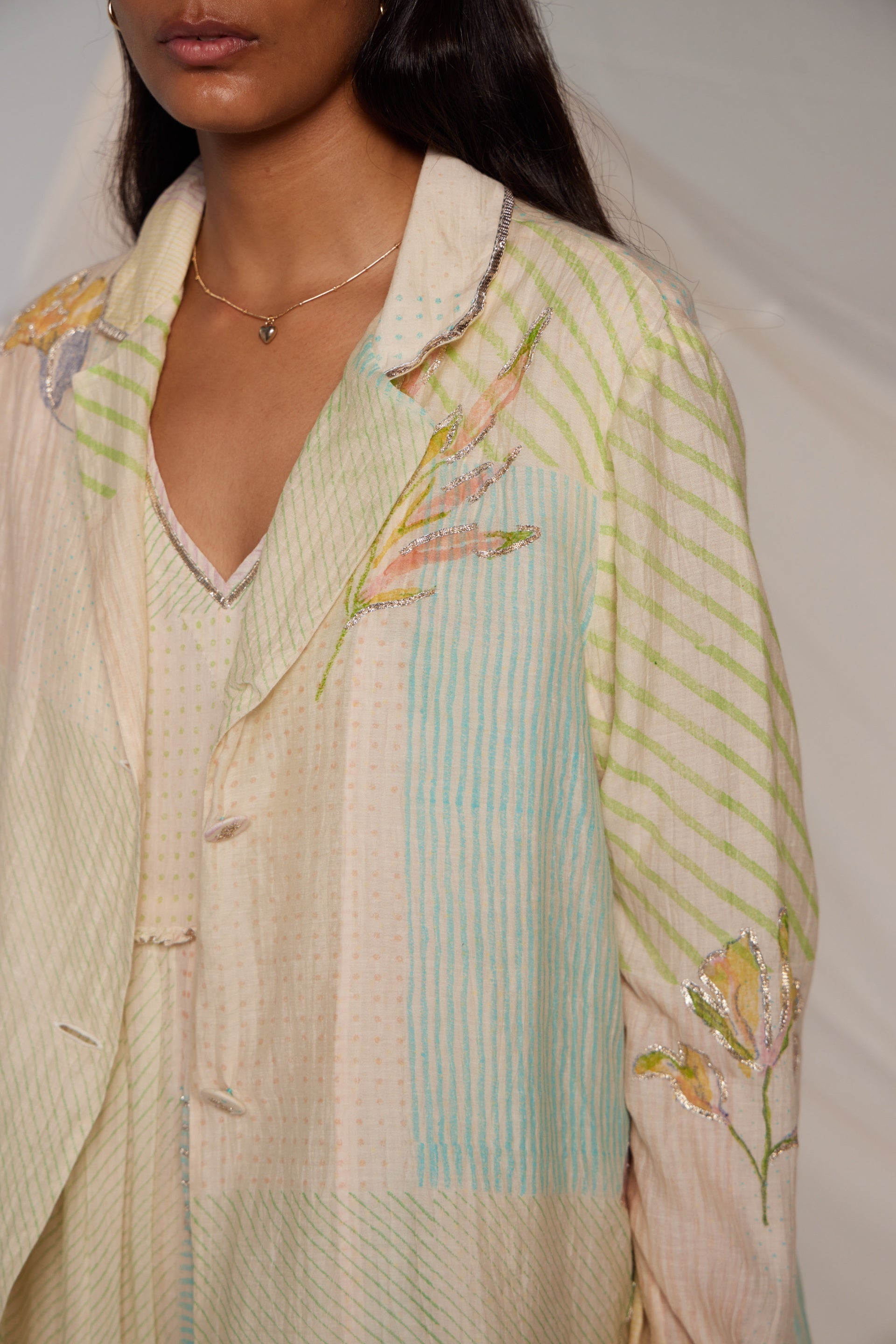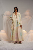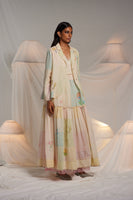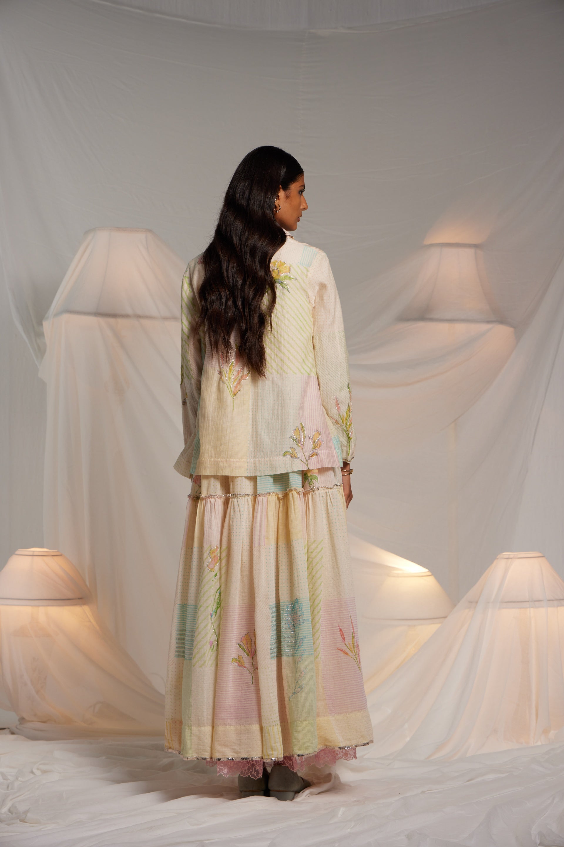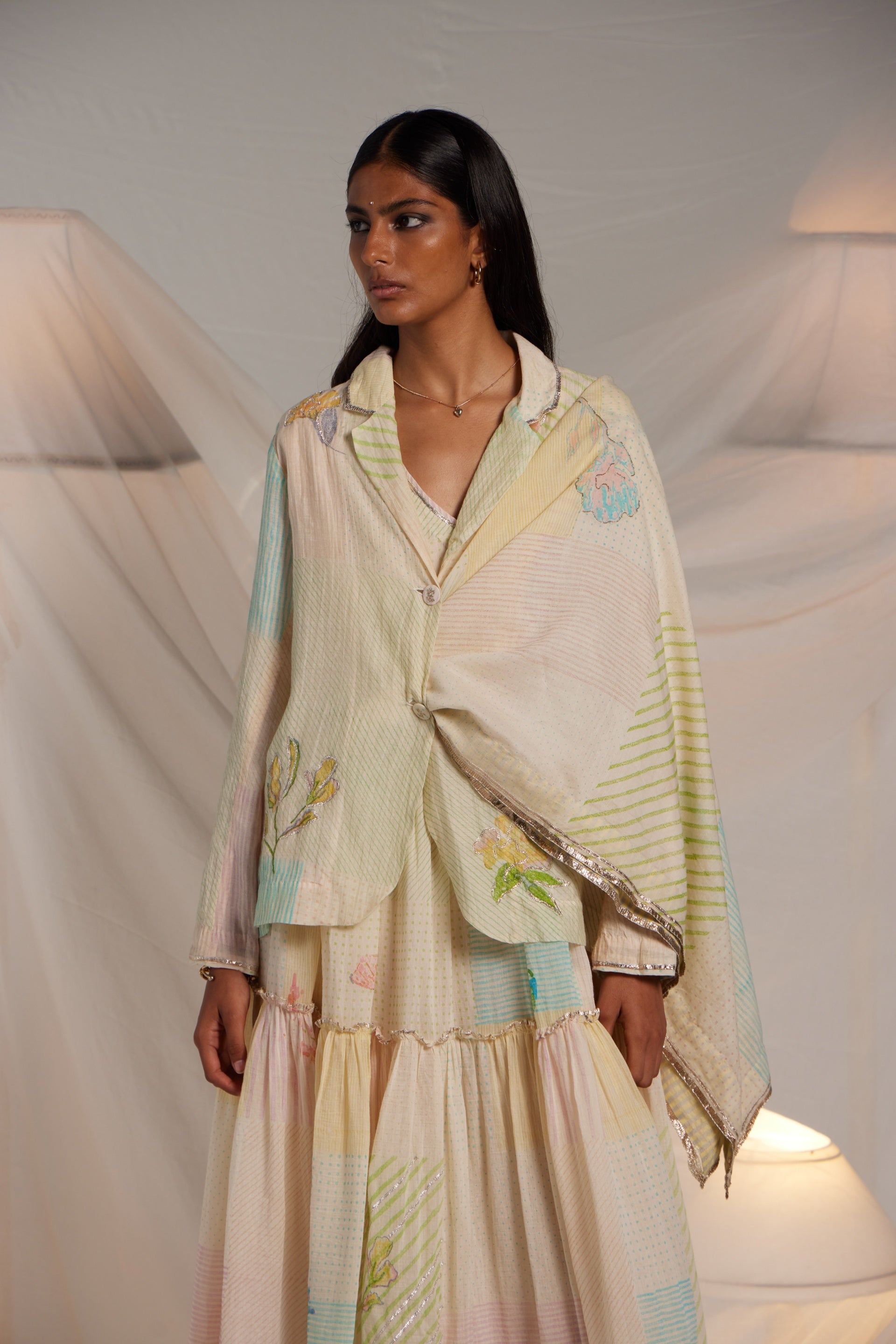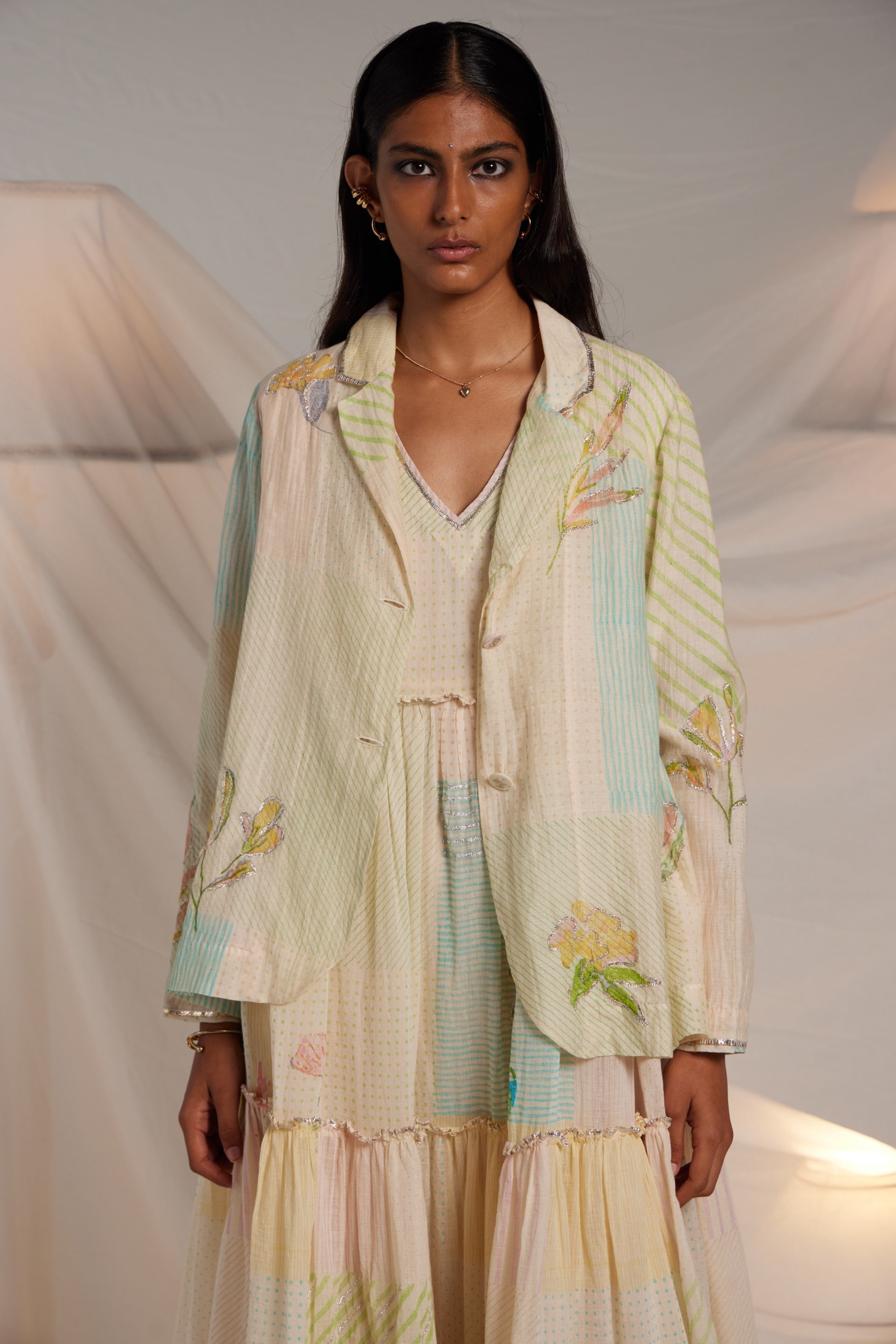 Short semi fitted jacket and a tiered dress in all over hand block collage print and multicolor placement floral hand block print pattern finished with gota embroidery highlights accompanied by an attached printed lining in cotton silk fabric. the dress has an attached printed lining with organza trim.