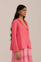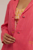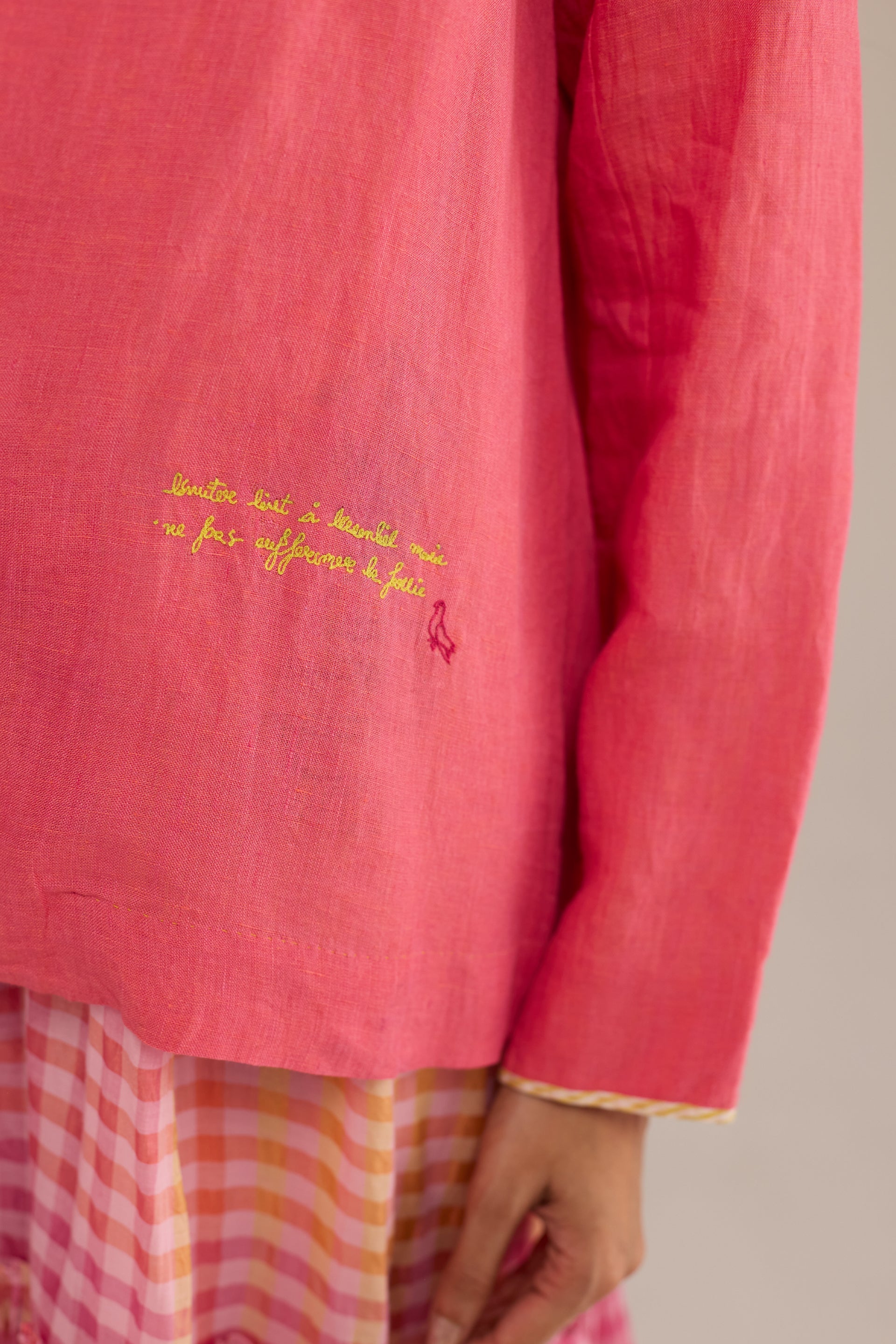 A short jacket with a notch collar and a curved-edge placket detail, crafted from 100% linen fabric. Beautifully accented with delicate hand-embroidered buttons and a text print hand embroidery on the side.