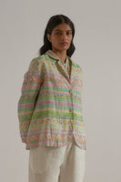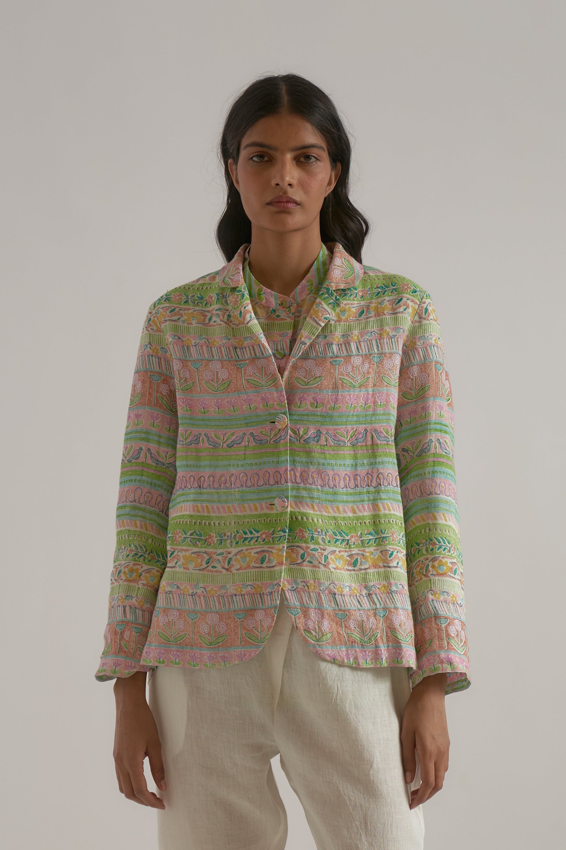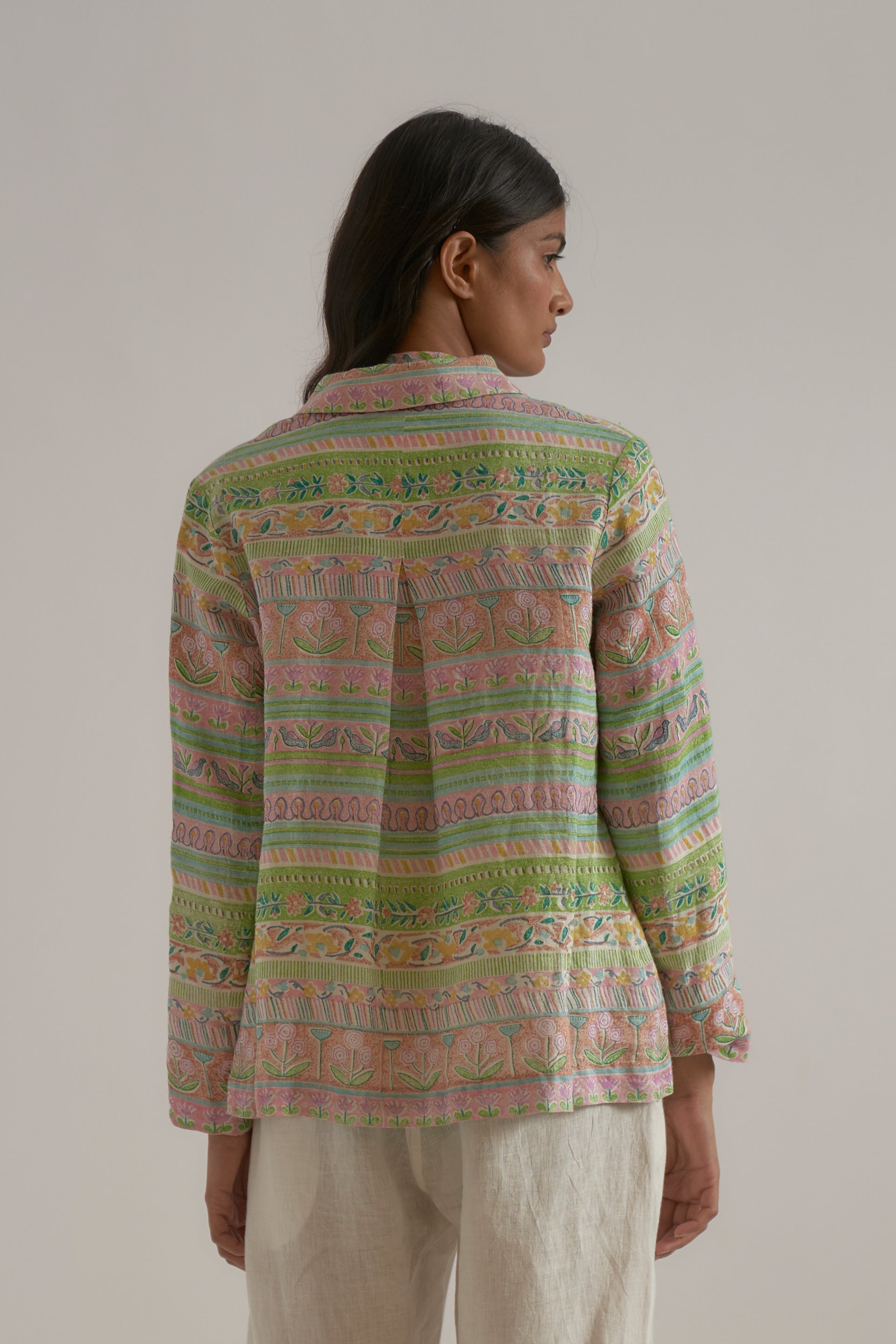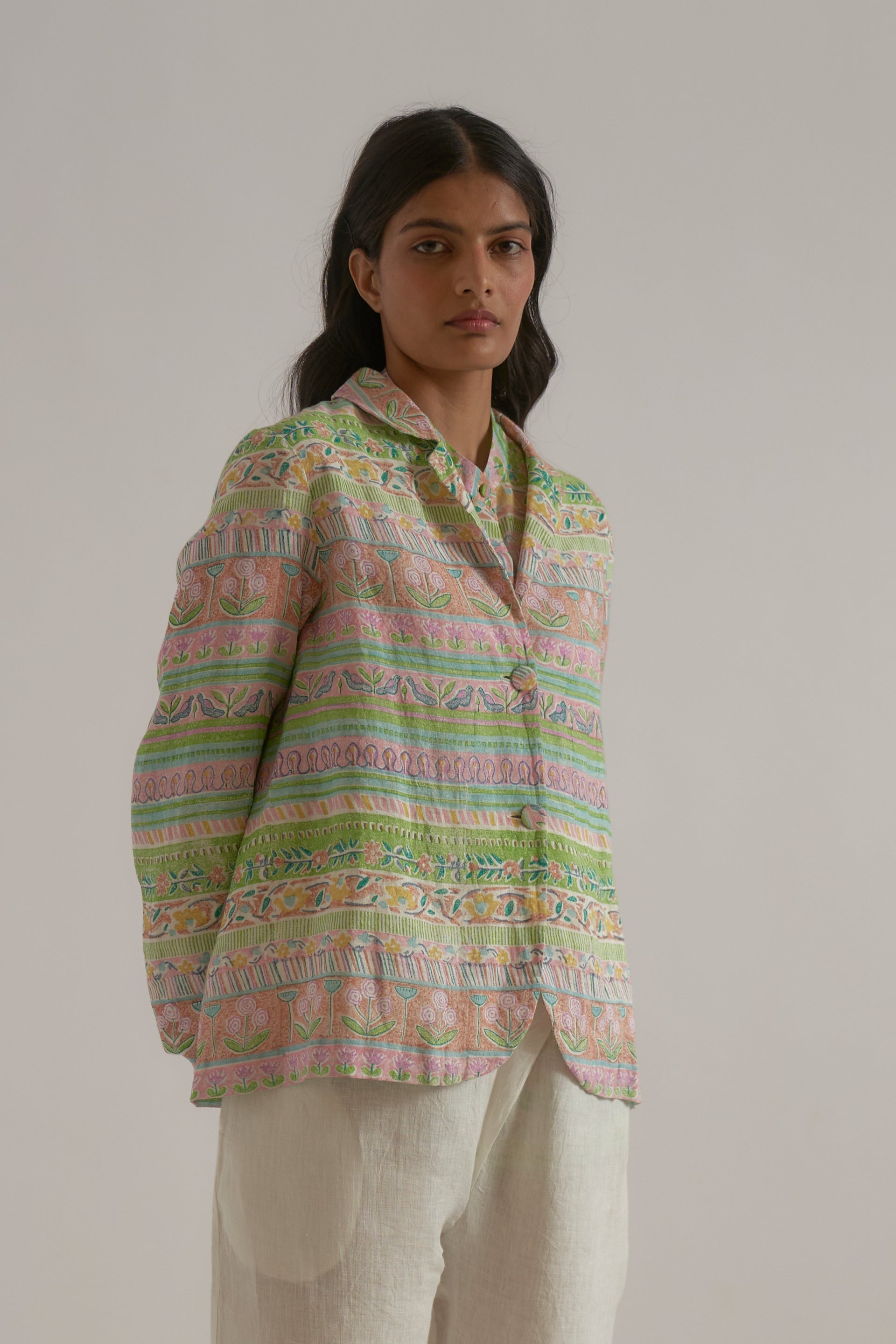 A short jacket with a notch collar and a curved-edge placket detail, made from 100% linen fabric. The piece features a vibrant multicolor handblock print, where 17 distinct handblocks are carefully combined to form a unique, panelled design.