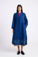 Patchwork relaxed fit shawl collar long jacket. Constructed in solid 100% wool and solid quilted 100% silk fabric. Finished with contrast collage handblock print 100% silk lining and contrast chevron 100% silk piping insert on the seams.