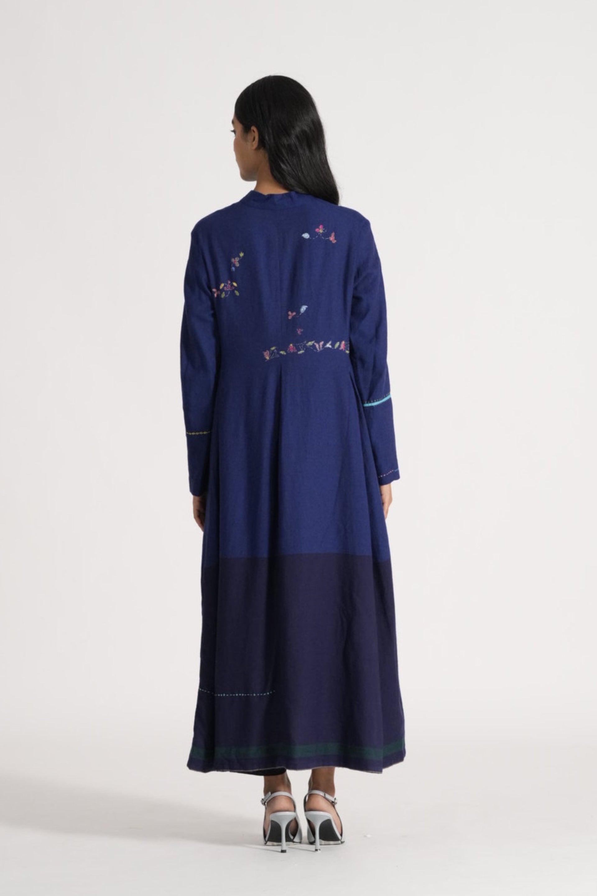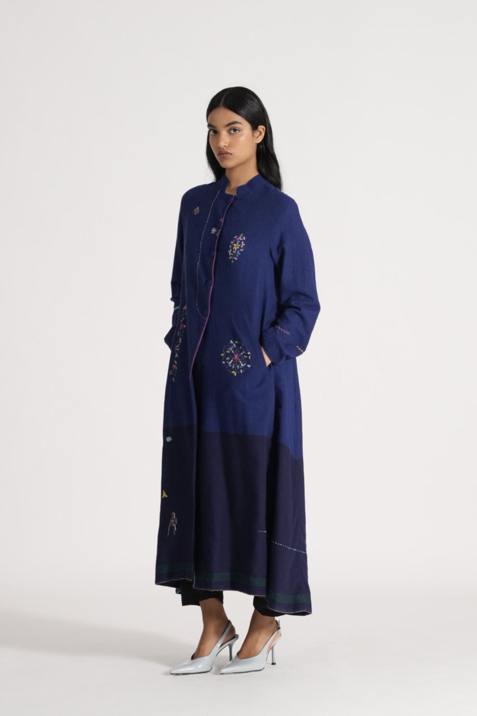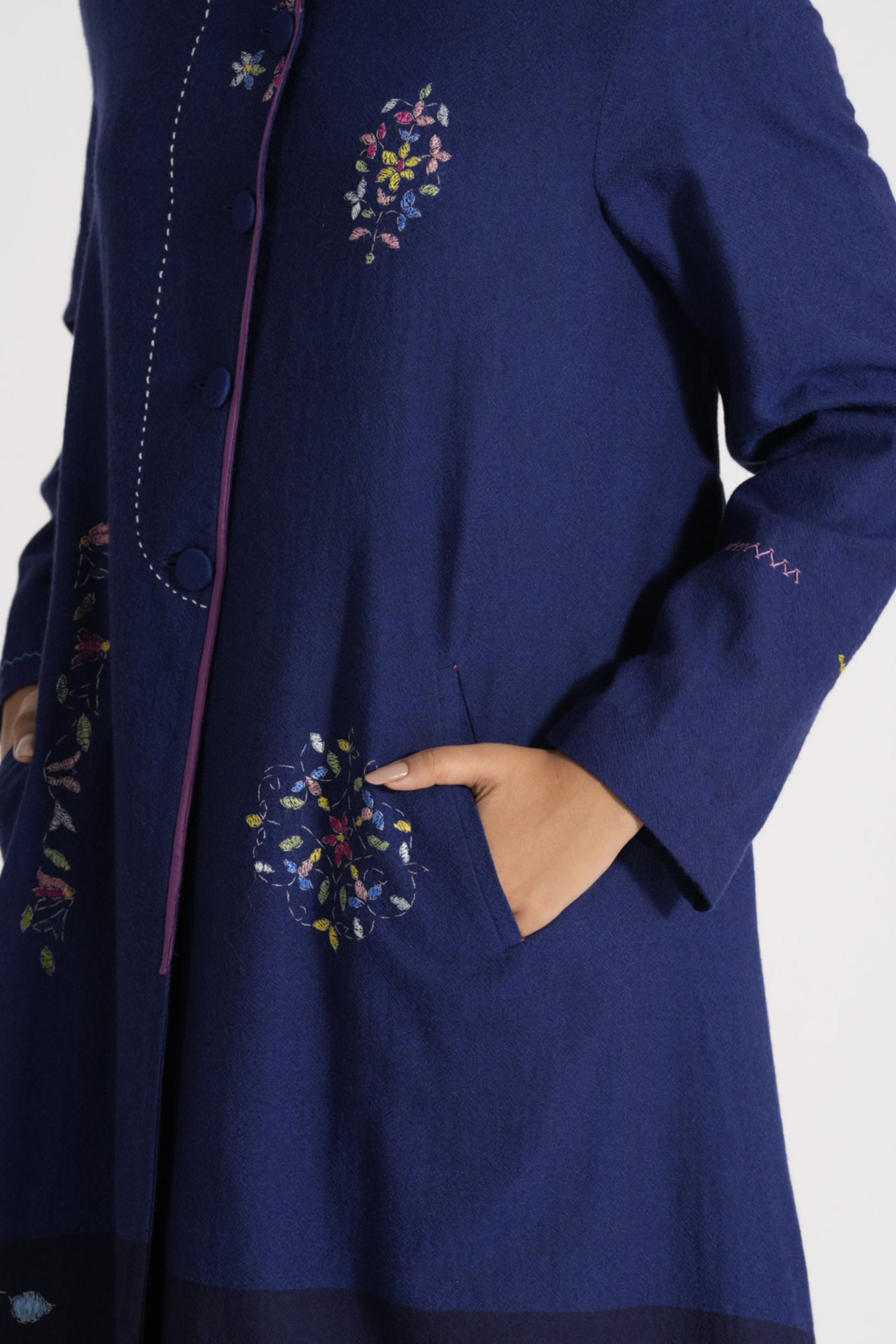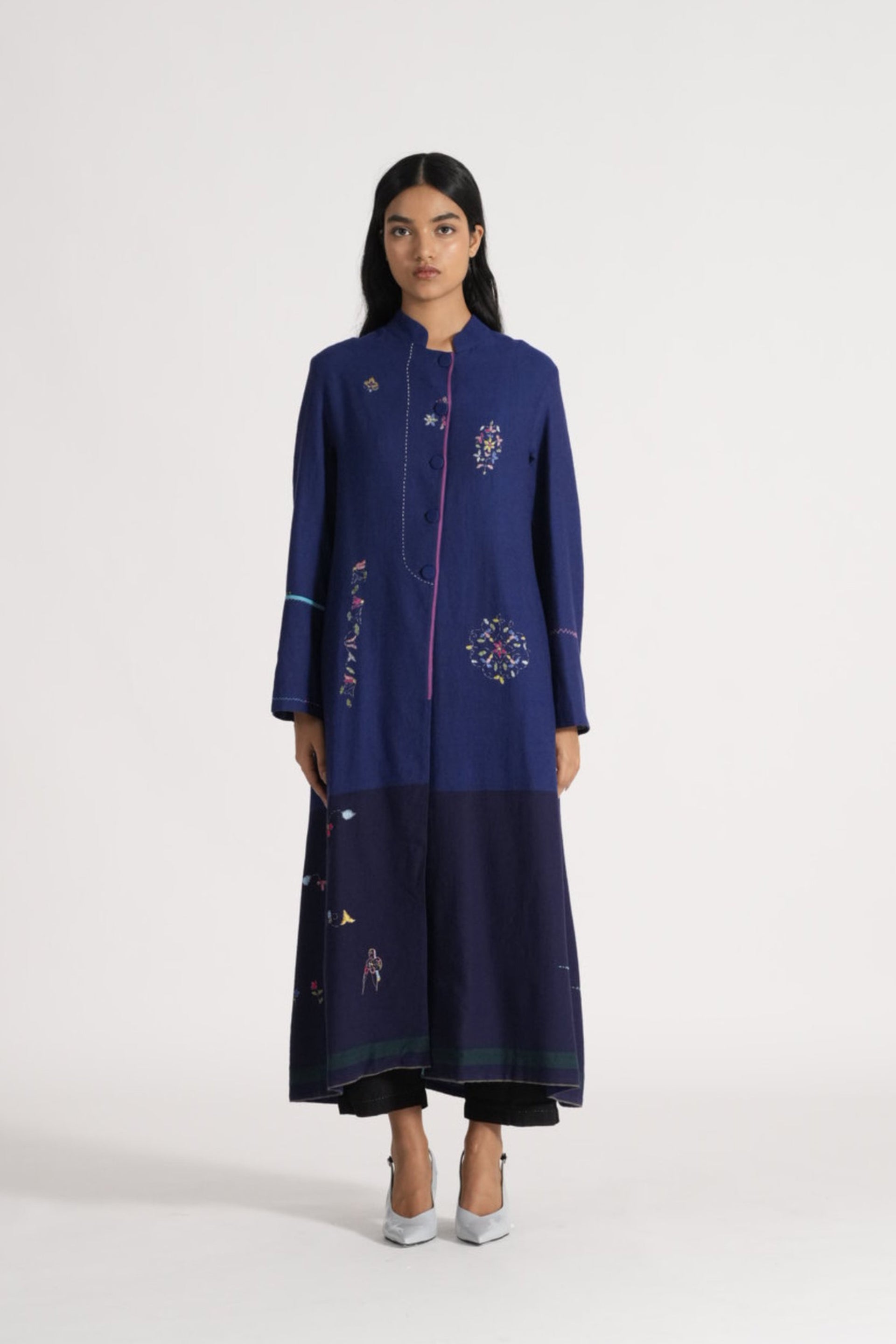 Button Down Straight Fit Long Jacket With Multicolor Delicate Hand Stitch Details And Floral Placement Hand Embroidery On 100% Merino Wool. Lined With Handblock Printed 100% Silk