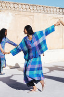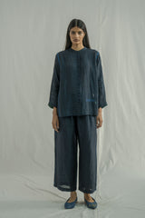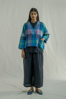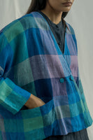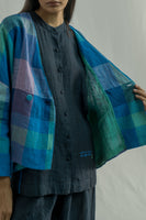 A relaxed-fit, double-breasted V-neck short jacket with a drop shoulder design. It features front pockets, decorative piping along the placket and sleeves, and embroidered buttons for a refined touch. Crafted in 100% linen, having placement handblock printed cotton silk lining.