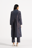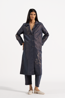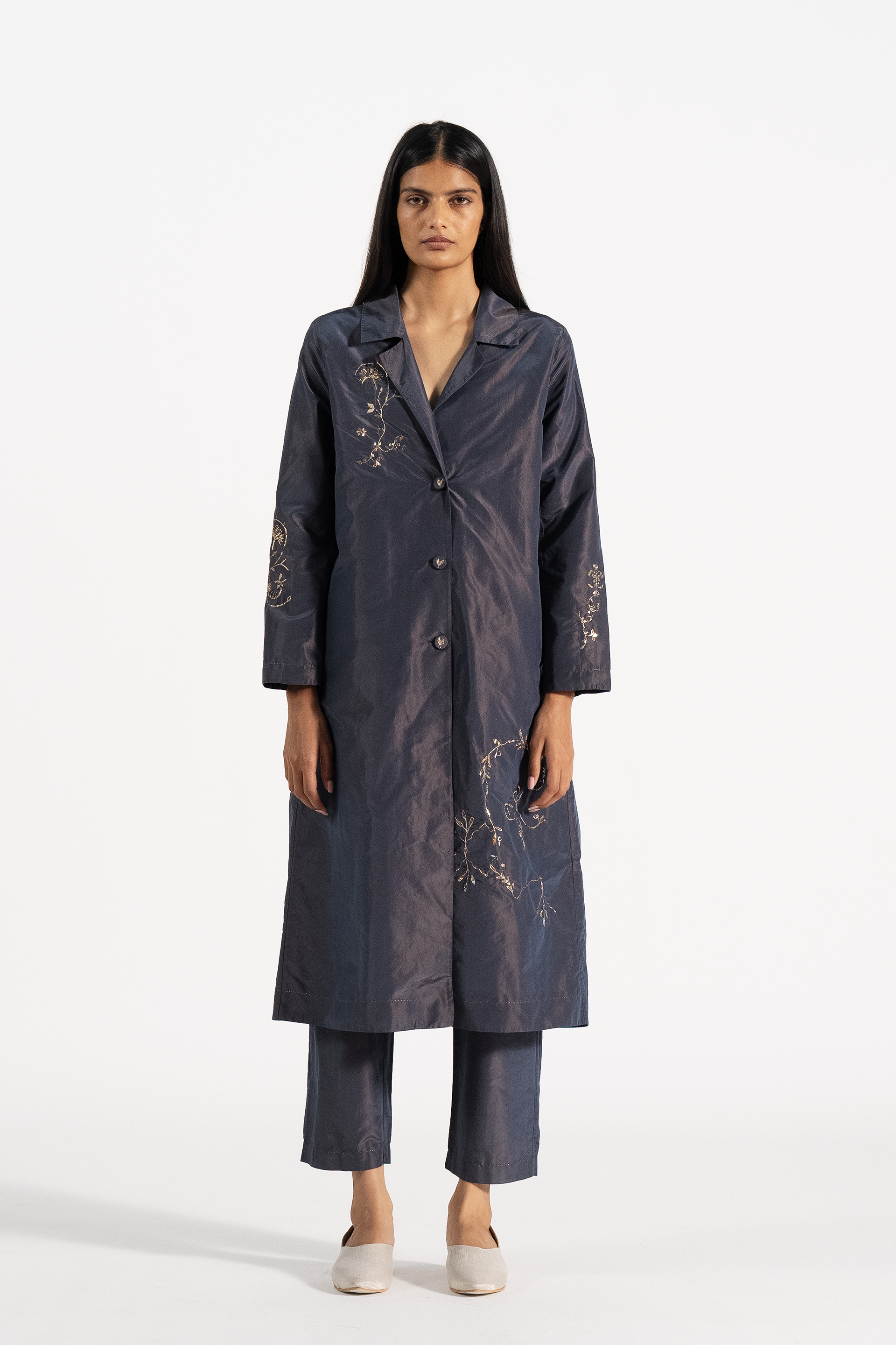 Notch Collar Long Straight Jacket With Placement Hand Embroidery On It In 100% Silk Taffeta Lined With Silk Lining
