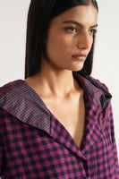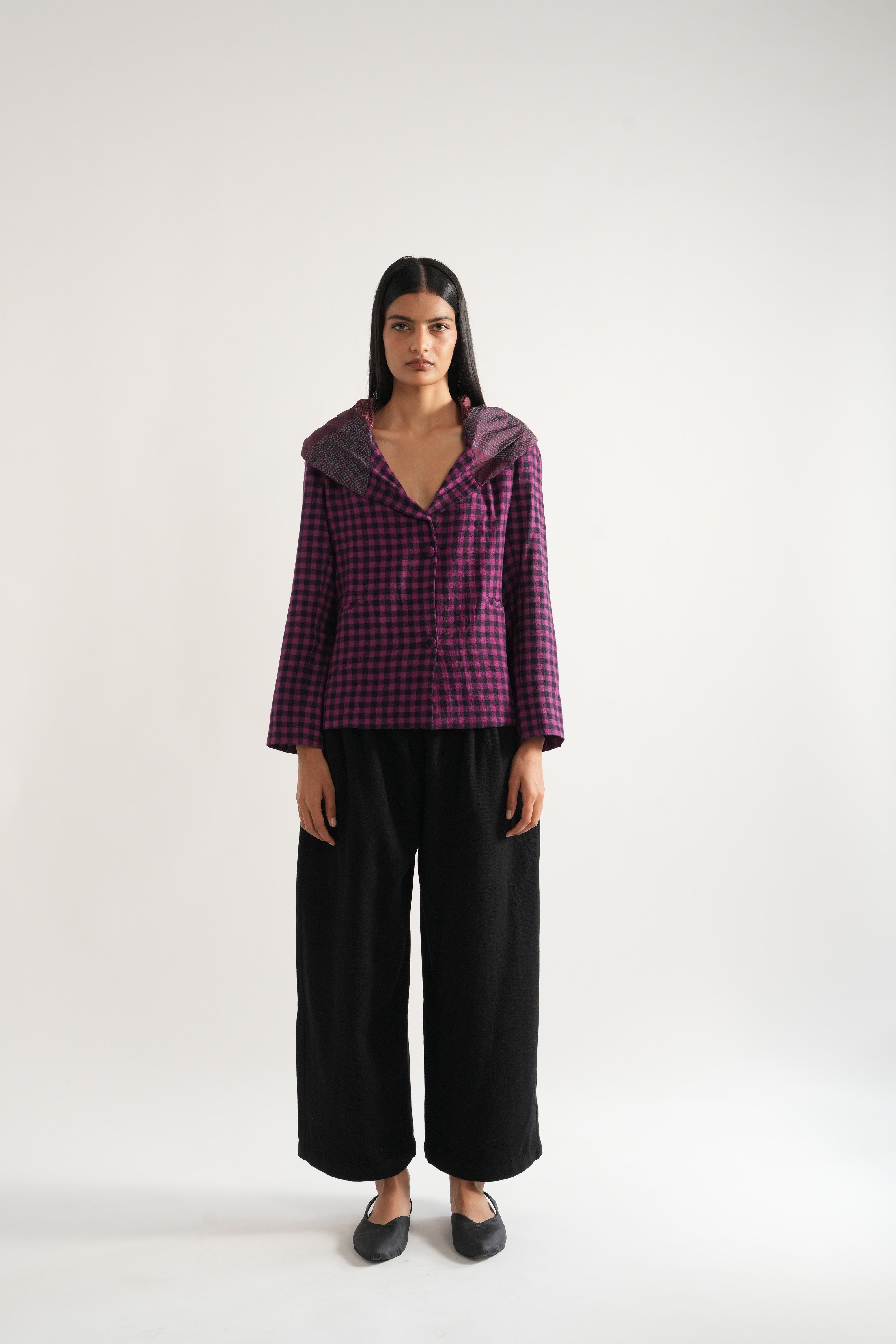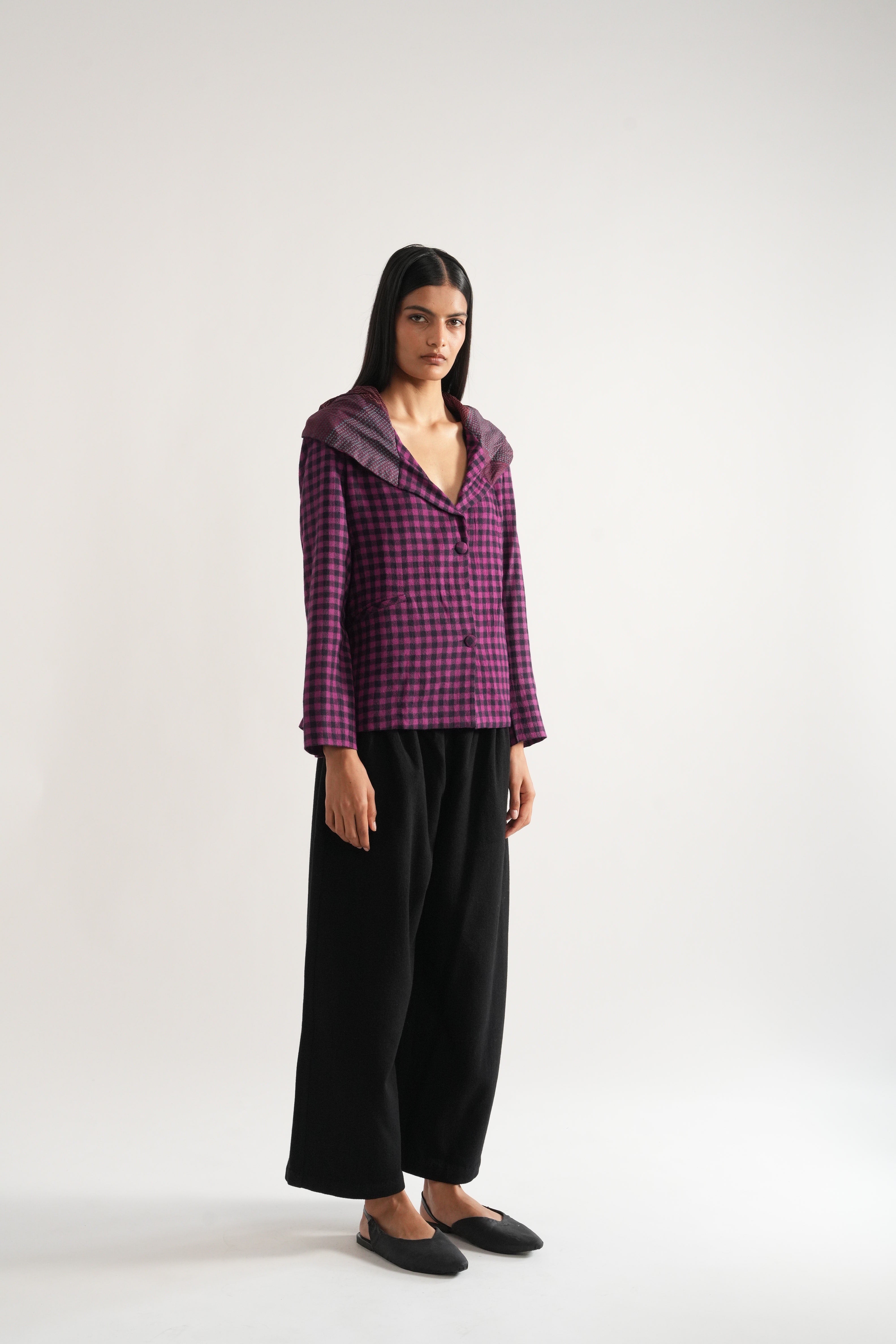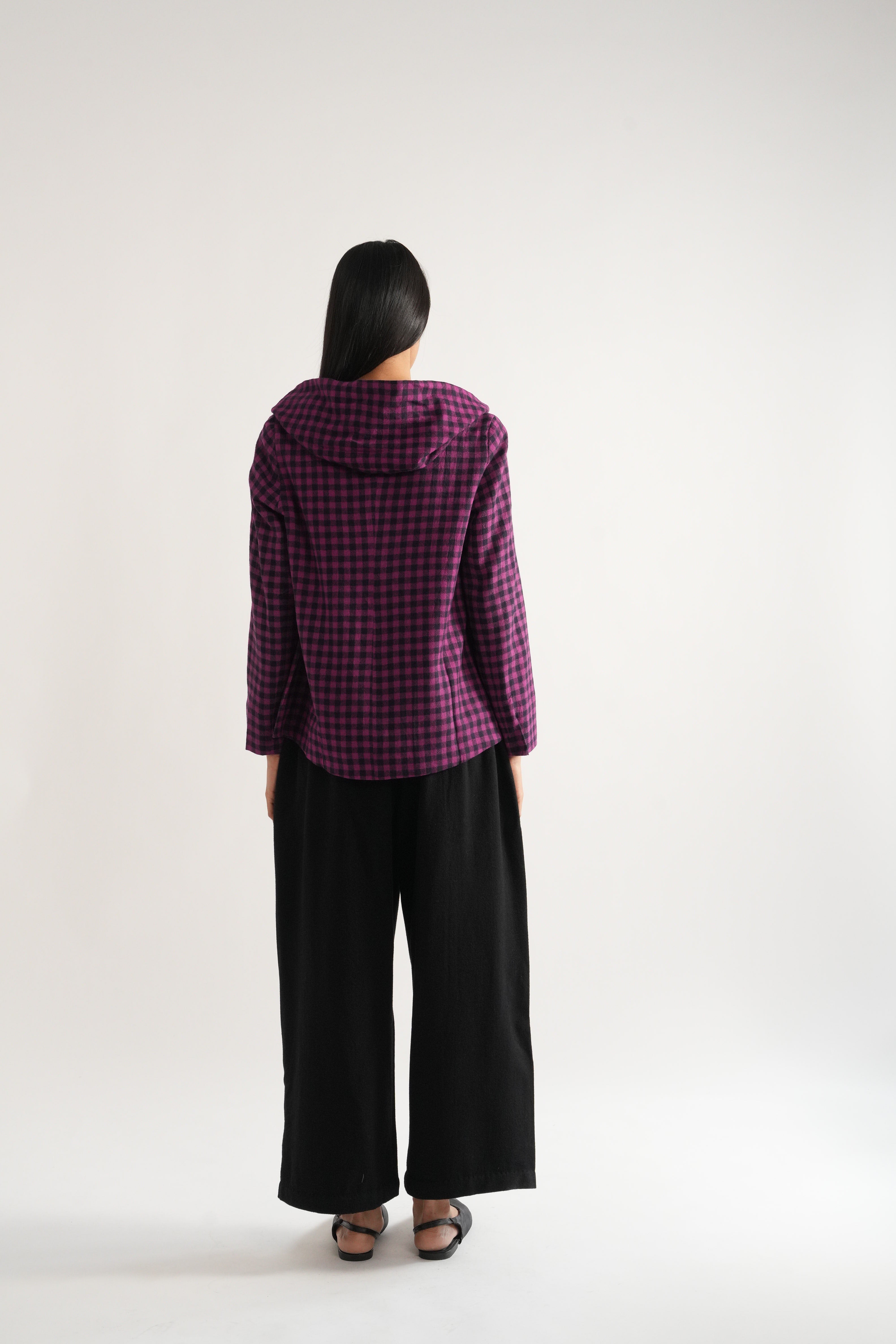 Easy fit, hoodie short jacket in handwoven wool yarn dyed checks
