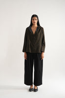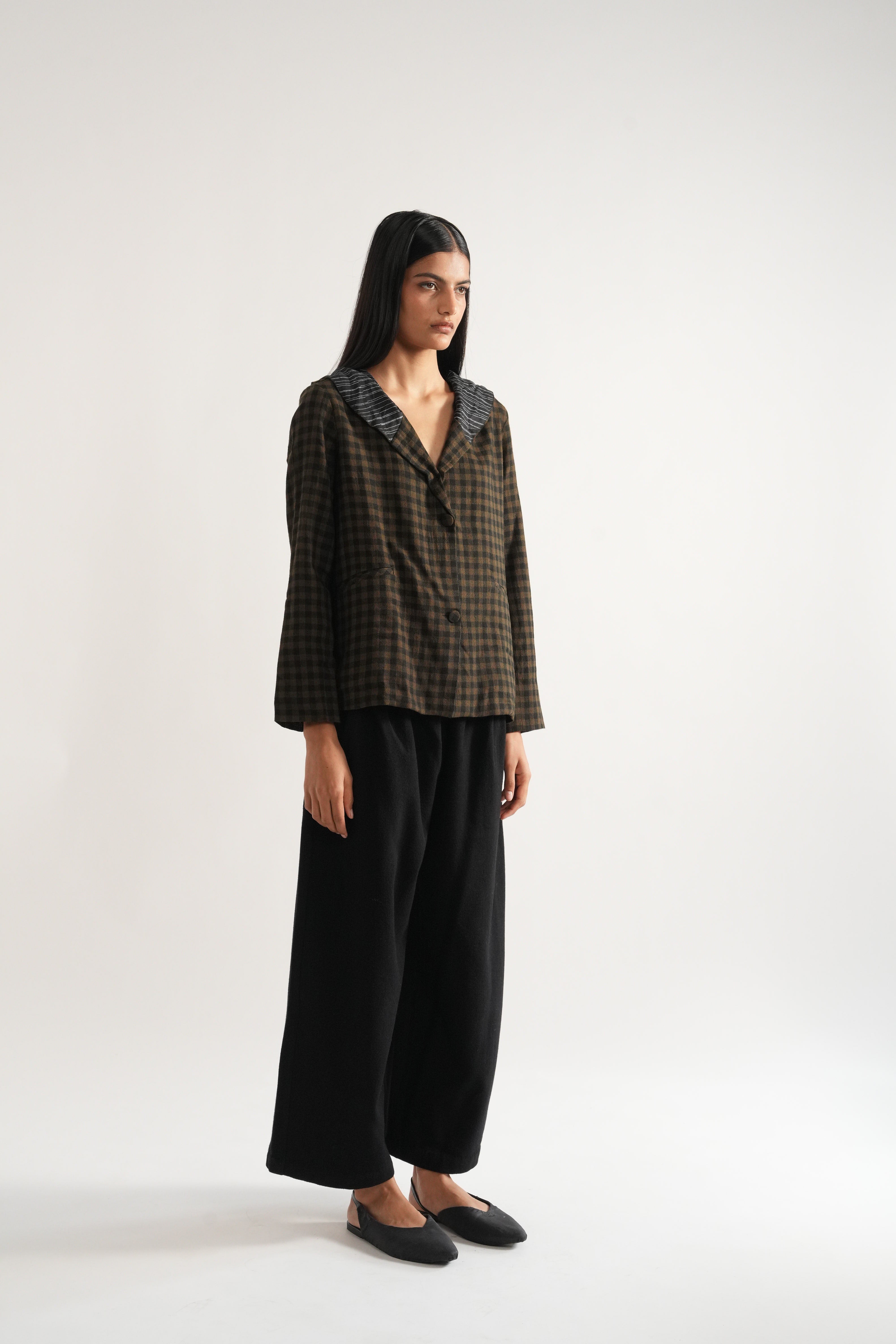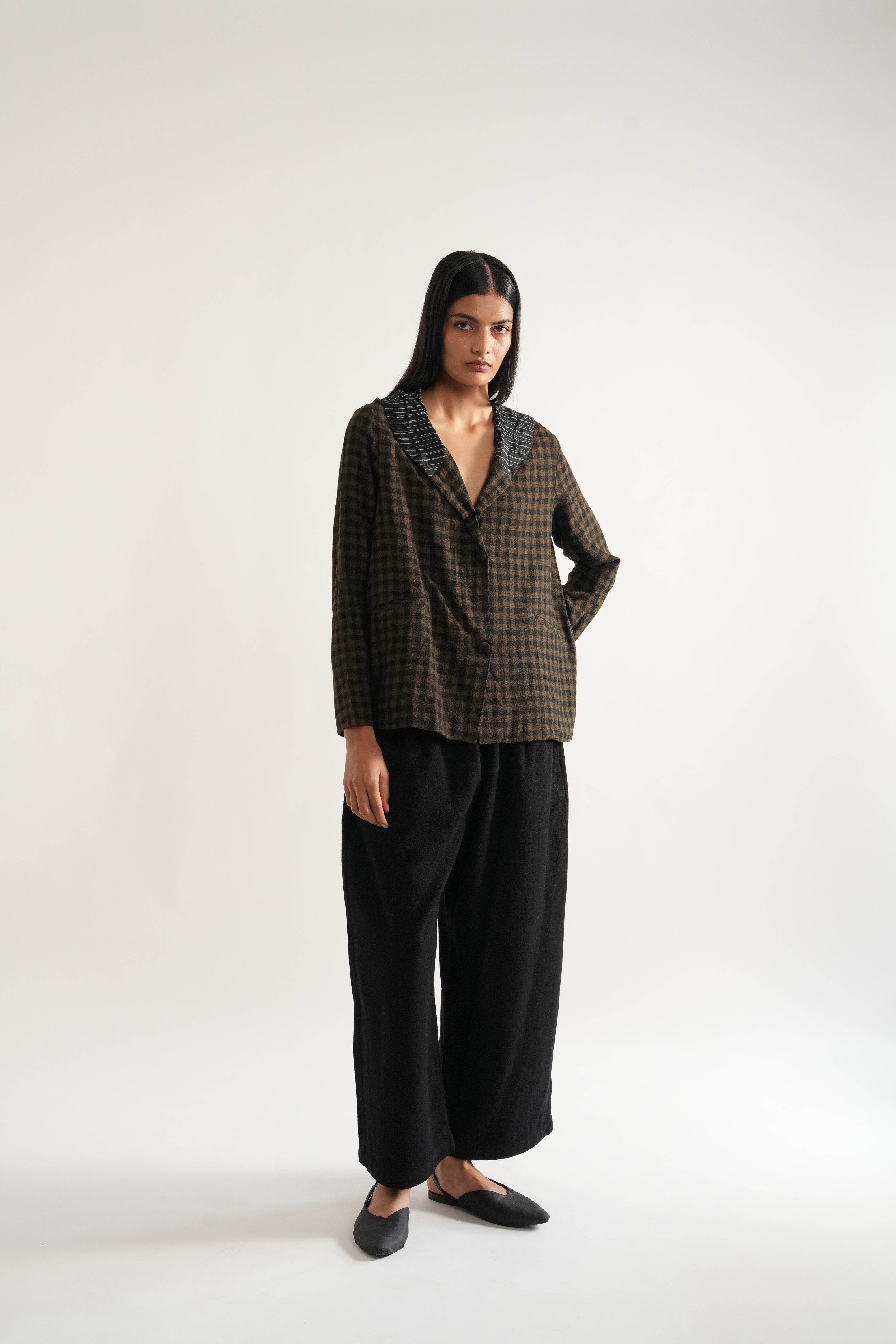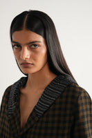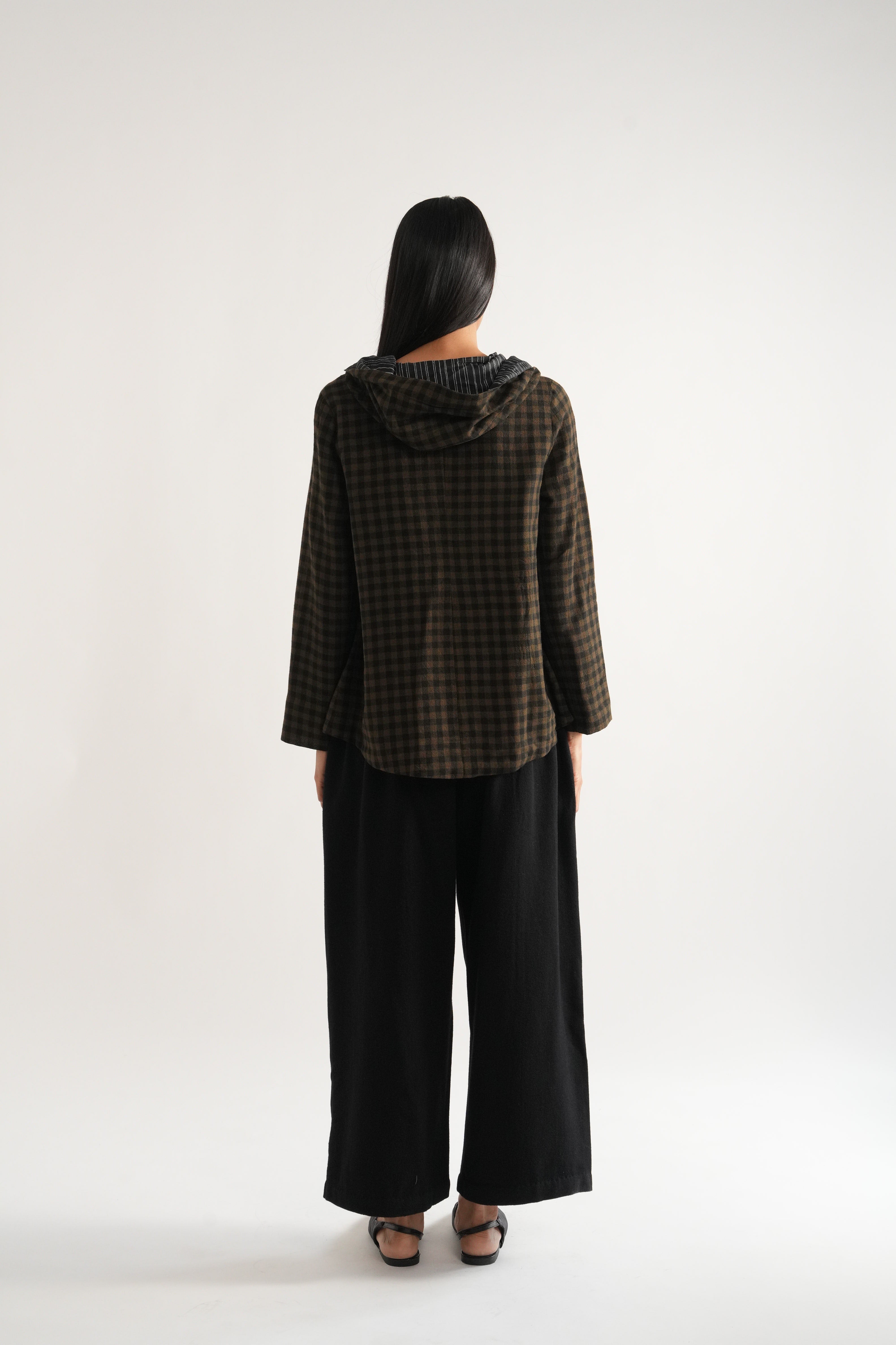 Easy fit, hoodie short jacket in handwoven wool yarn dyed checks