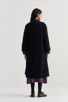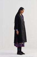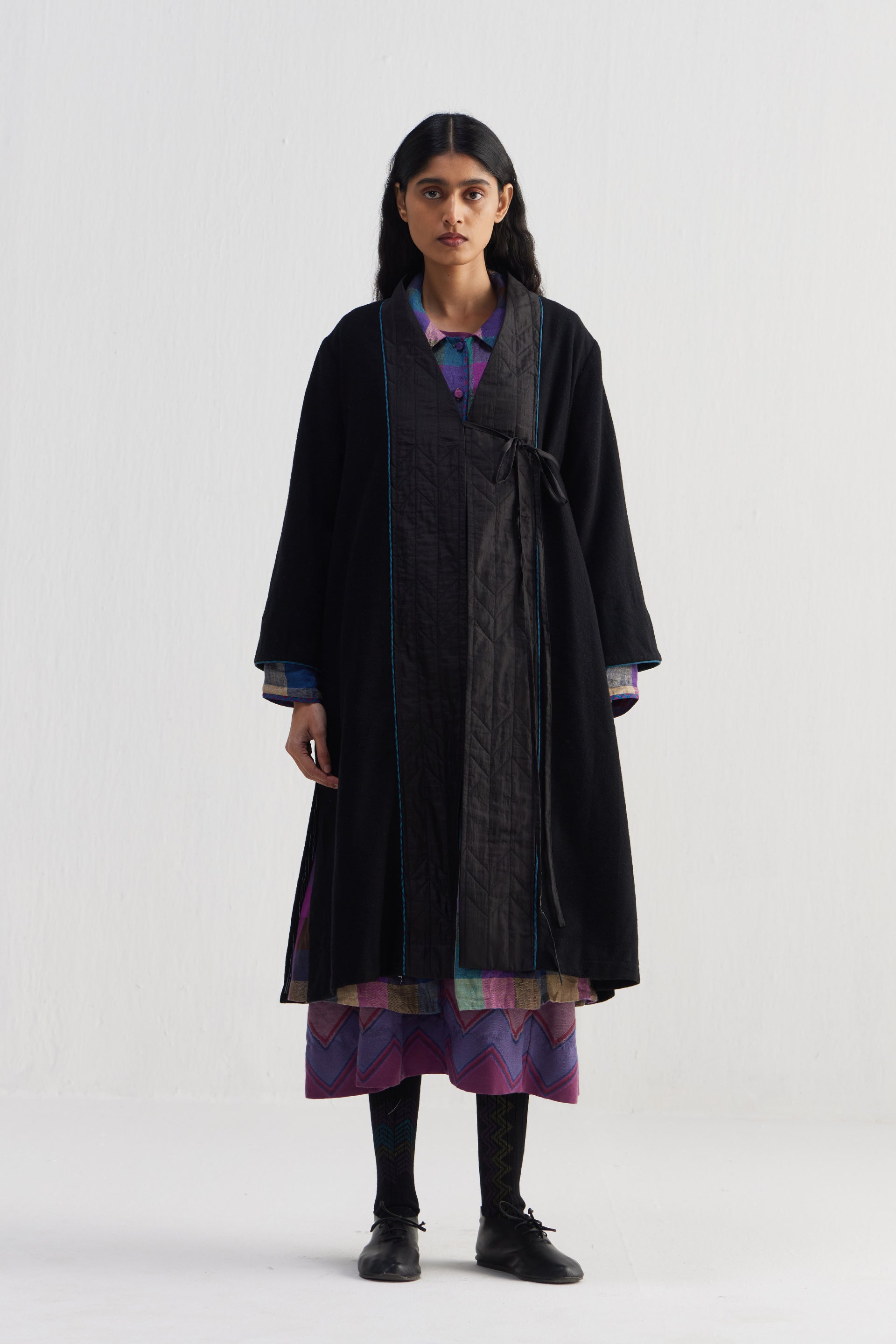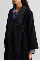 Wrap around tye up detail midi length full sleeves jacket with side seam slits. Constructed in patchwork of 100% merino wool and quilted 100% silk fabric. Finished with handblock print 100% silk lining and contrast chevron handblock print 100% silk fabric piping detail.