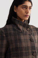 Straight fit stand collar knee length jacket with full sleeves and flap pocket detail in the front. Constructed in tone-on-tone thick and thin checkered 100% wool fabric. Finished with contrast collage print 100% silk facing.