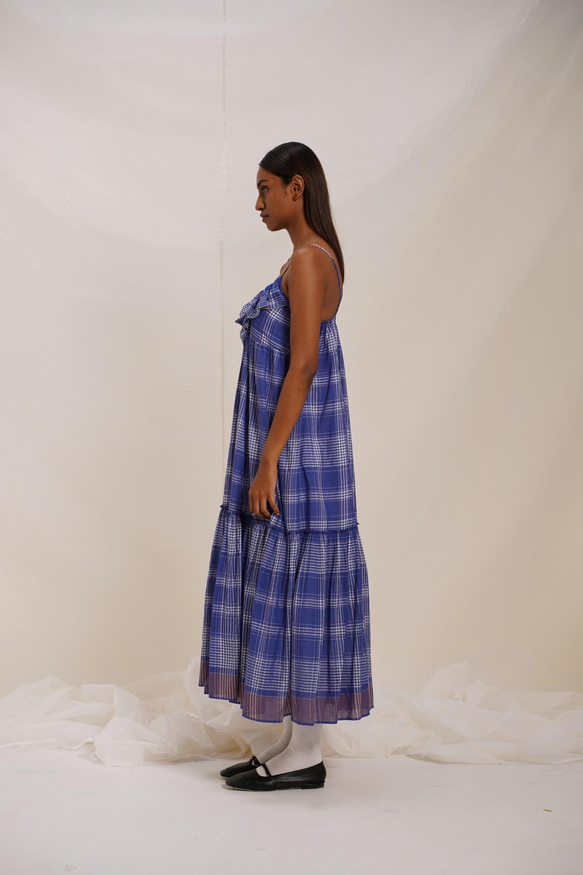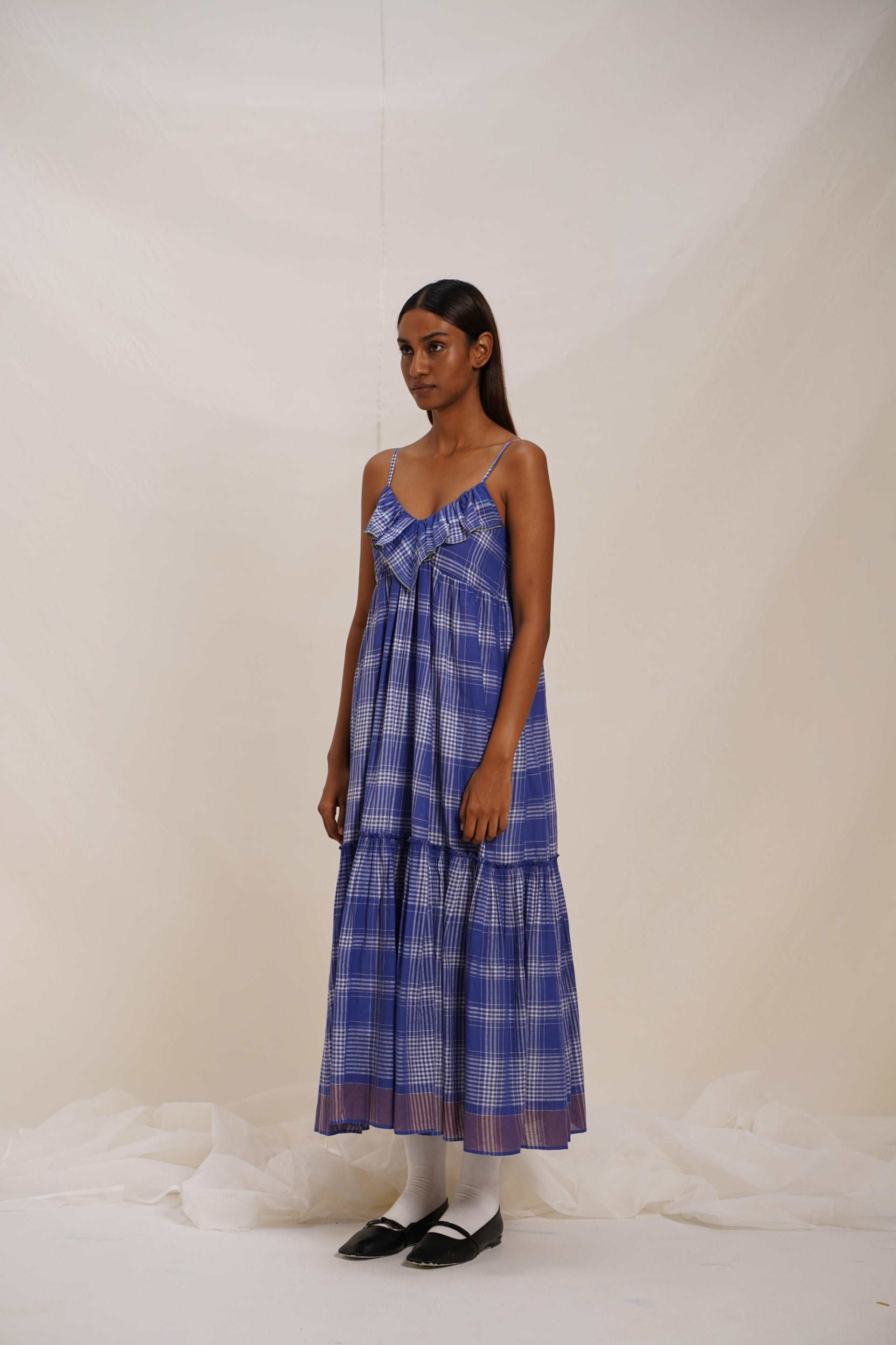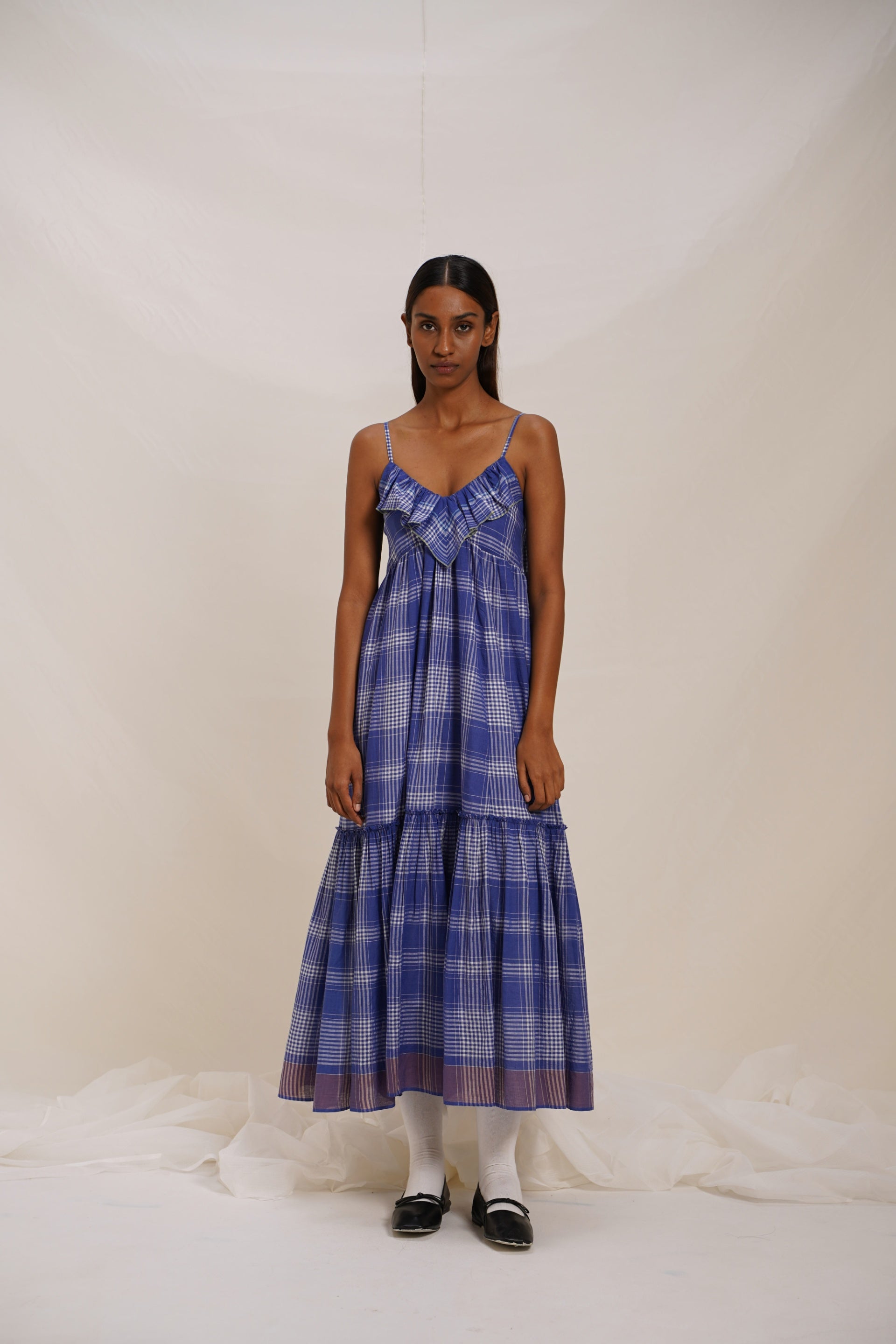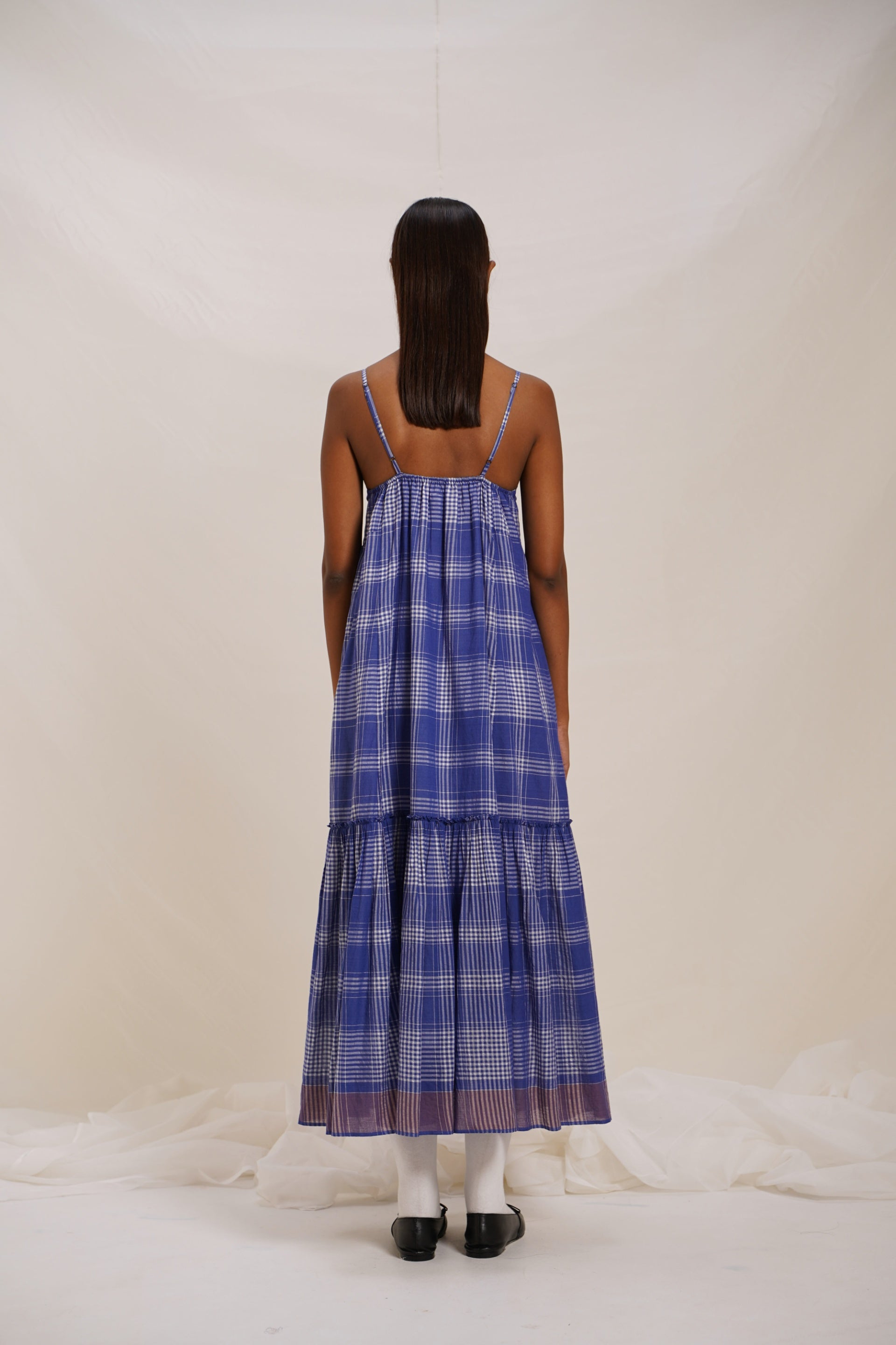 Sleeveless spagetti strap checkered dress with contrasting border and text embroidery. Comes with an attached hand block text printed lining