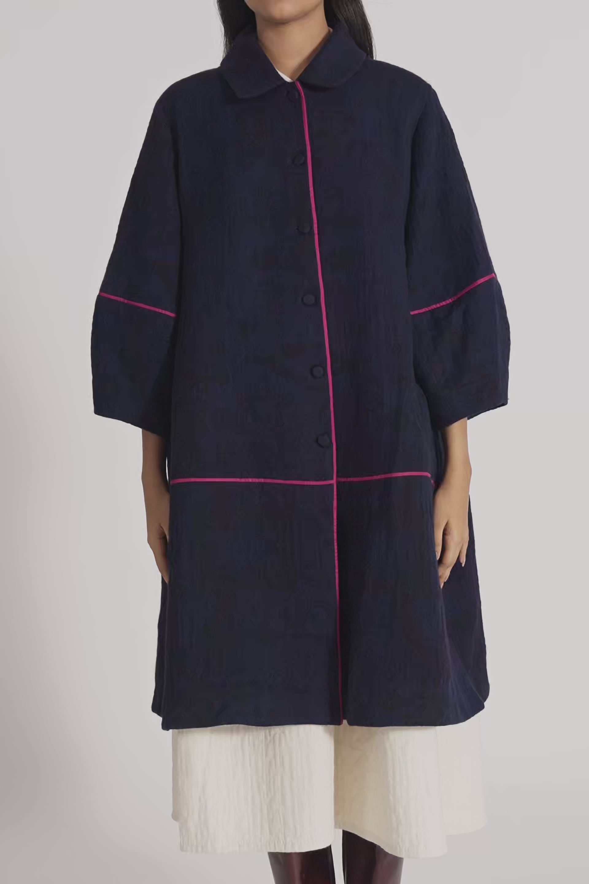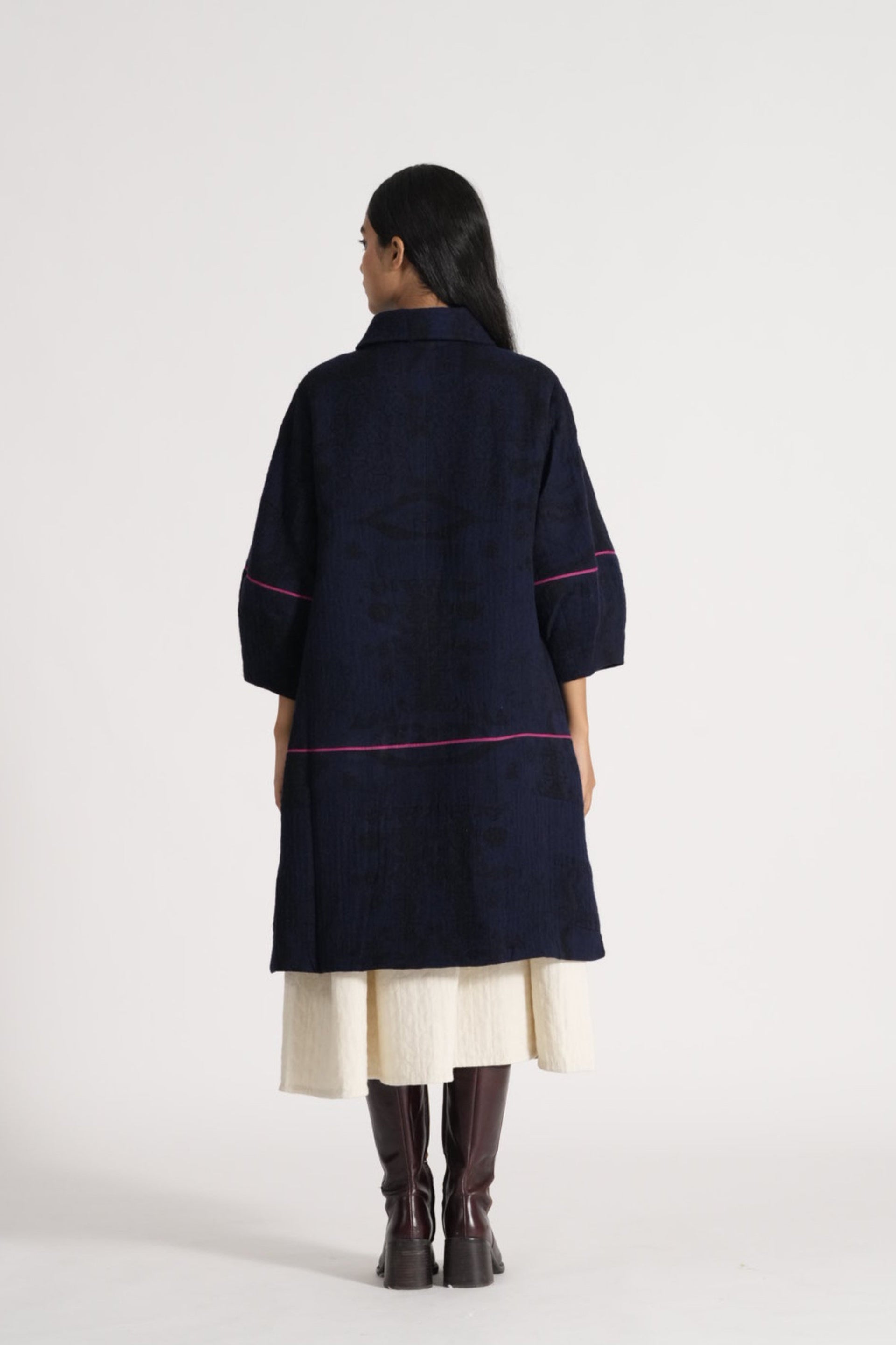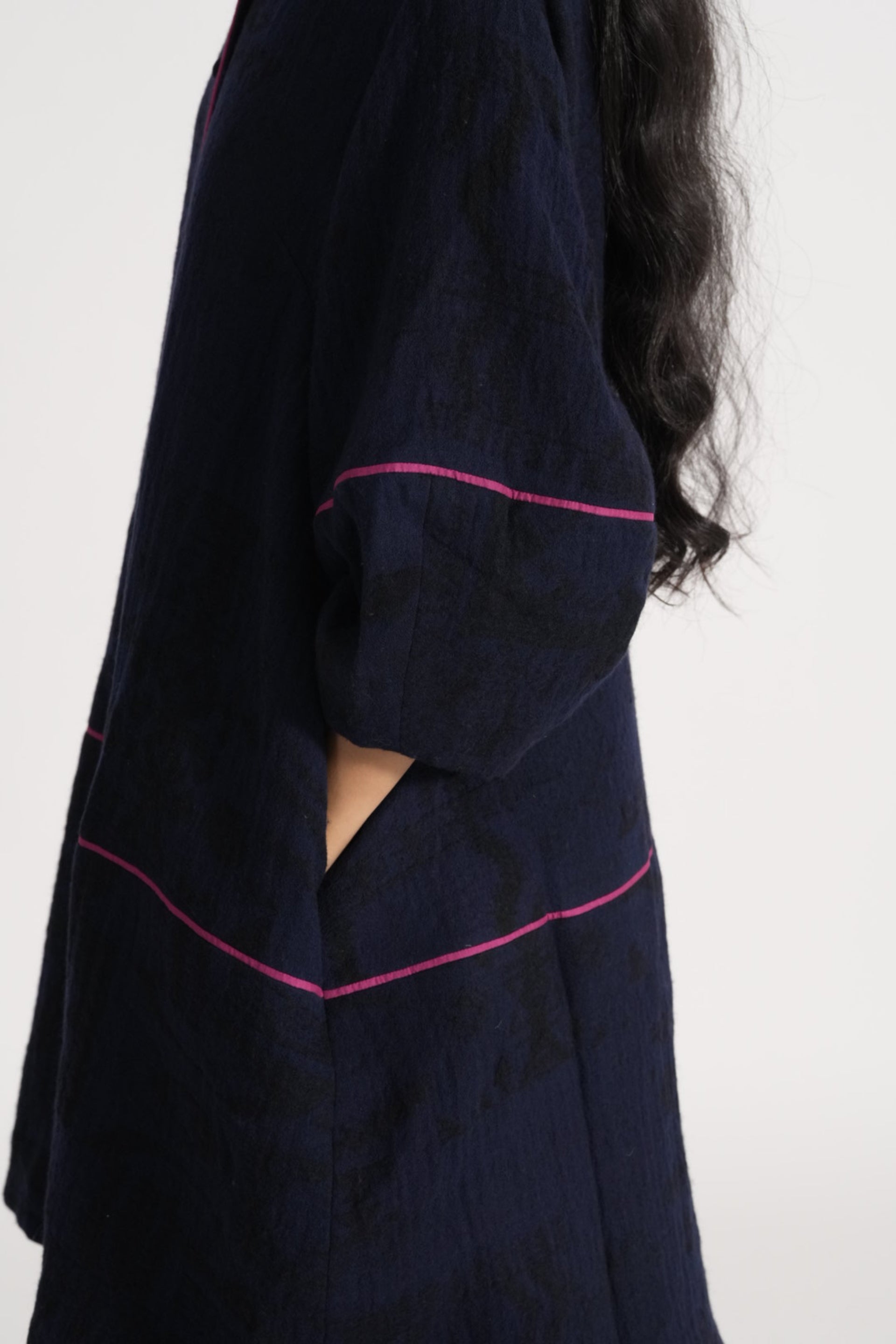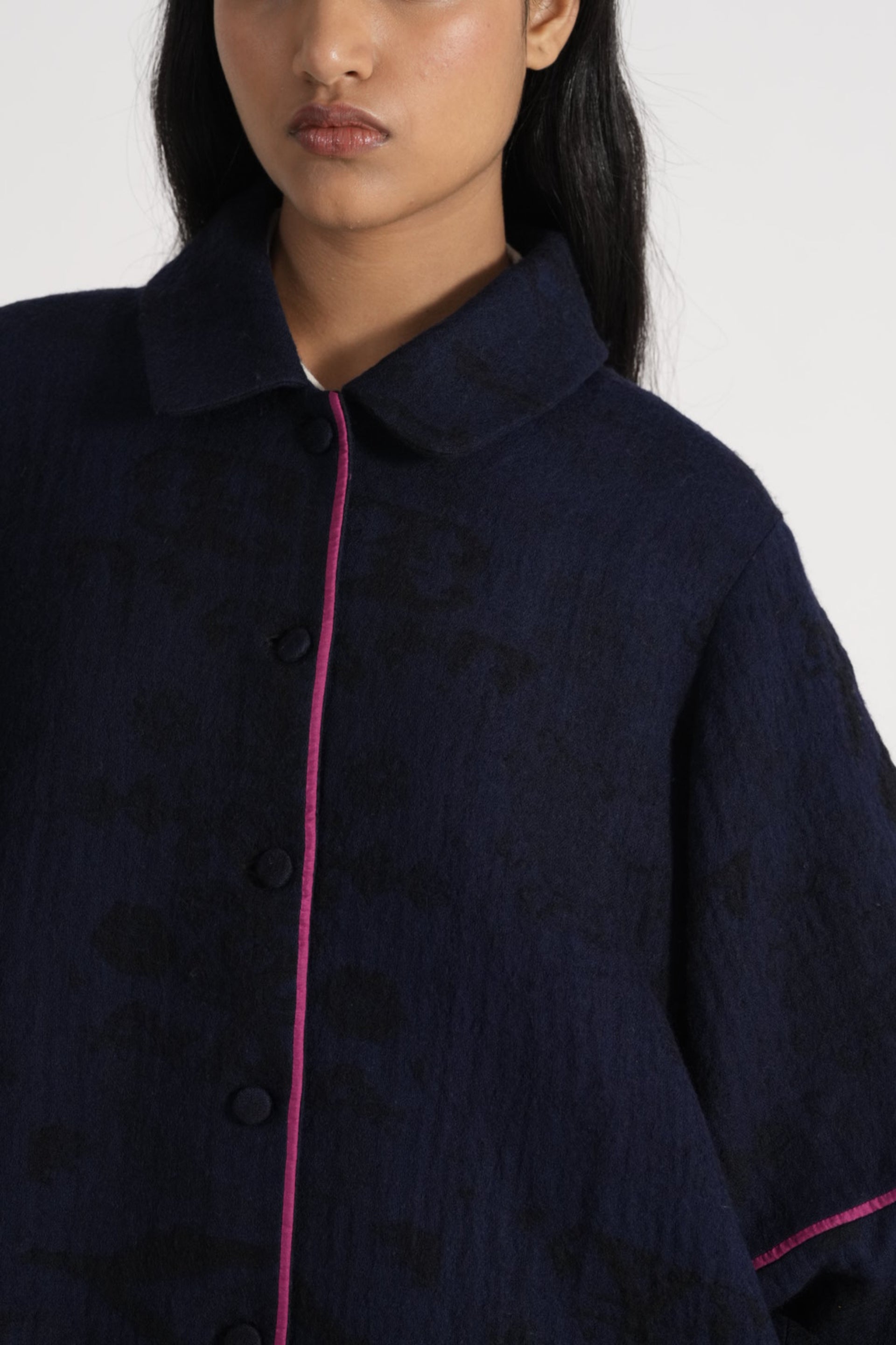 Relaxed Fit Button Down Jacket With Lantern Sleeves With Contrast Piping In All Over Jacquard 100% Merino Wool