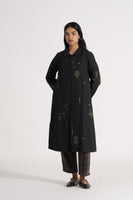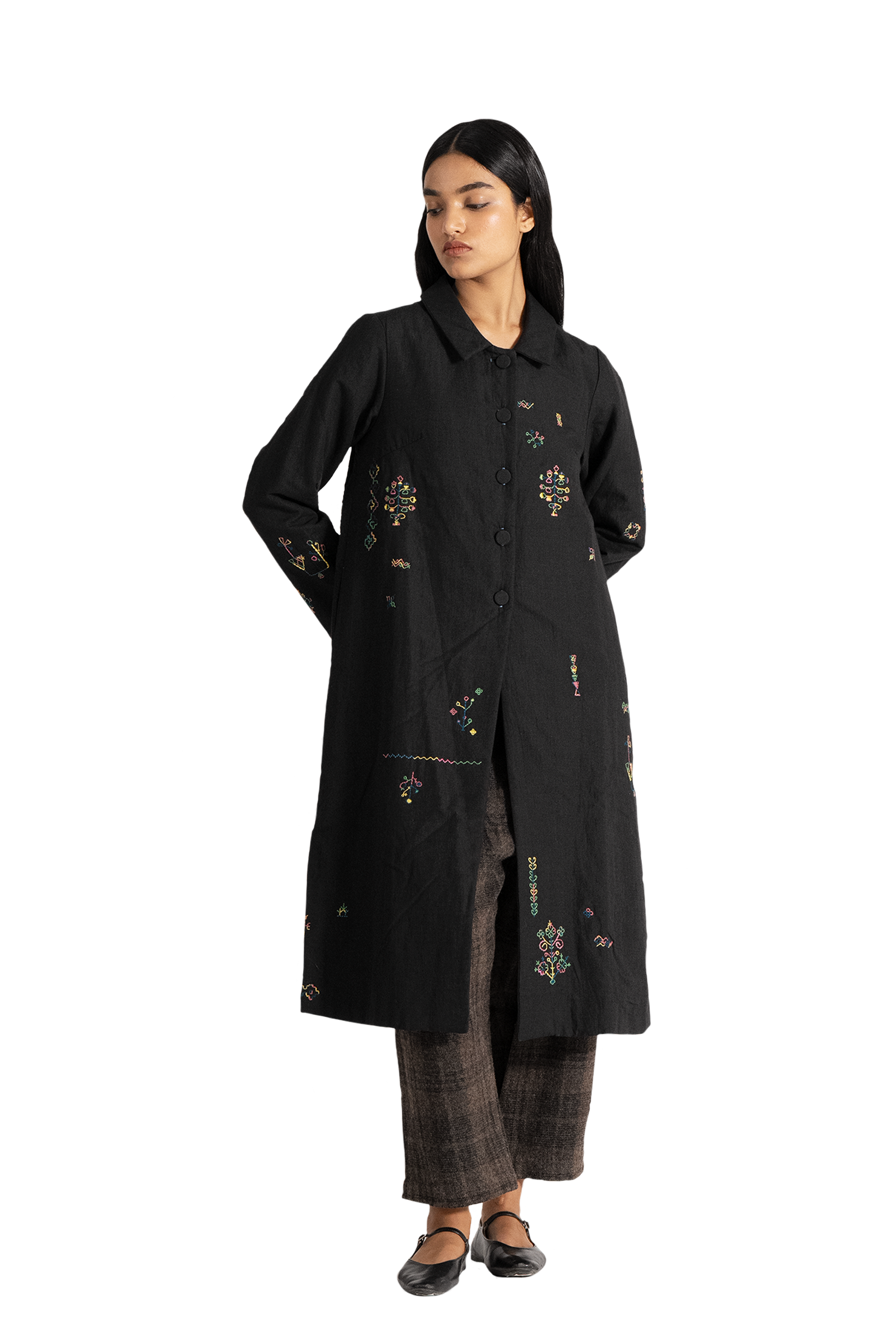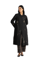 Straight fit button down jacket in placement delicate kasuti hand embroidery on quilted wool silk linen. Lind with handblock print silk lining.