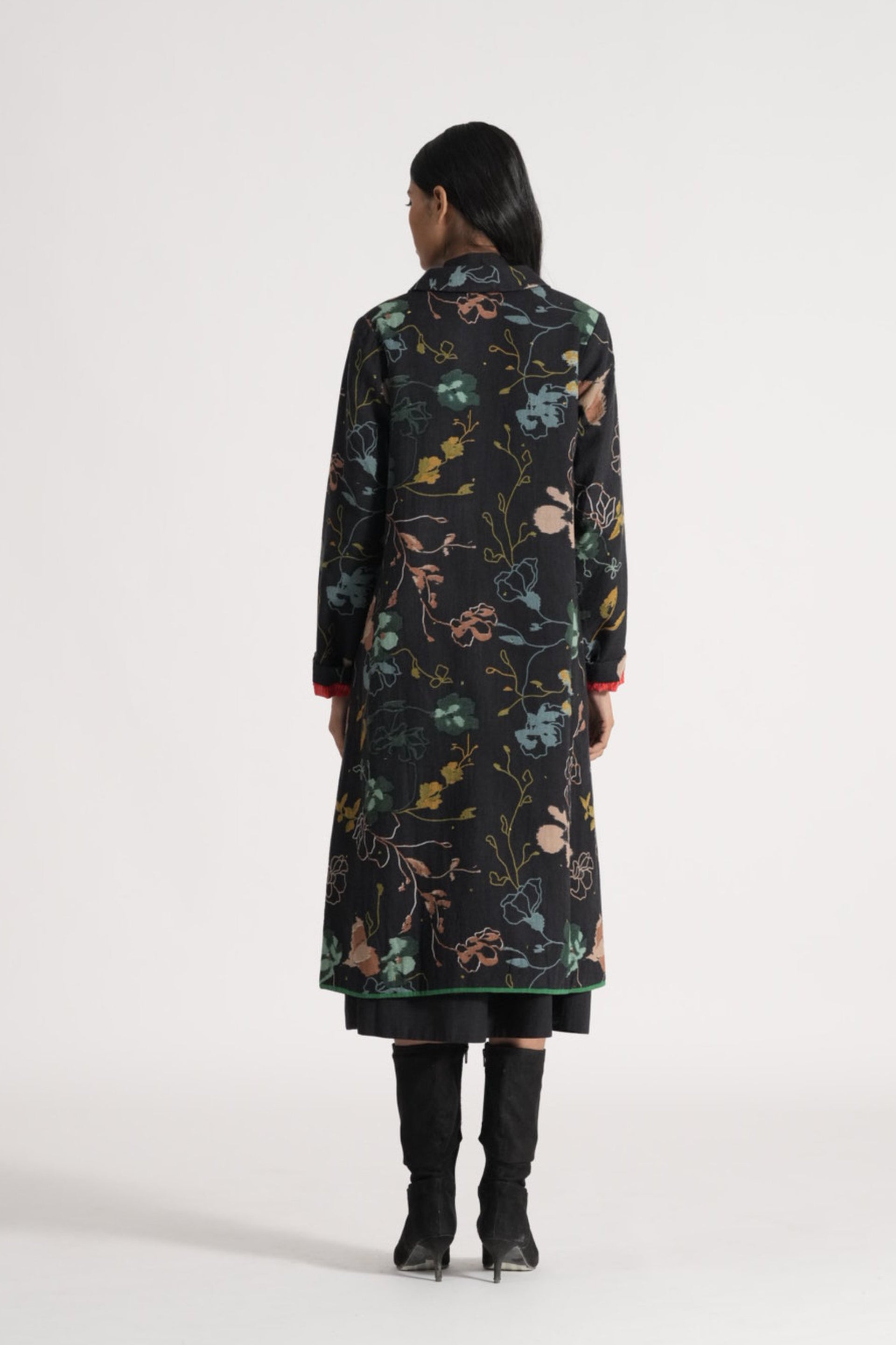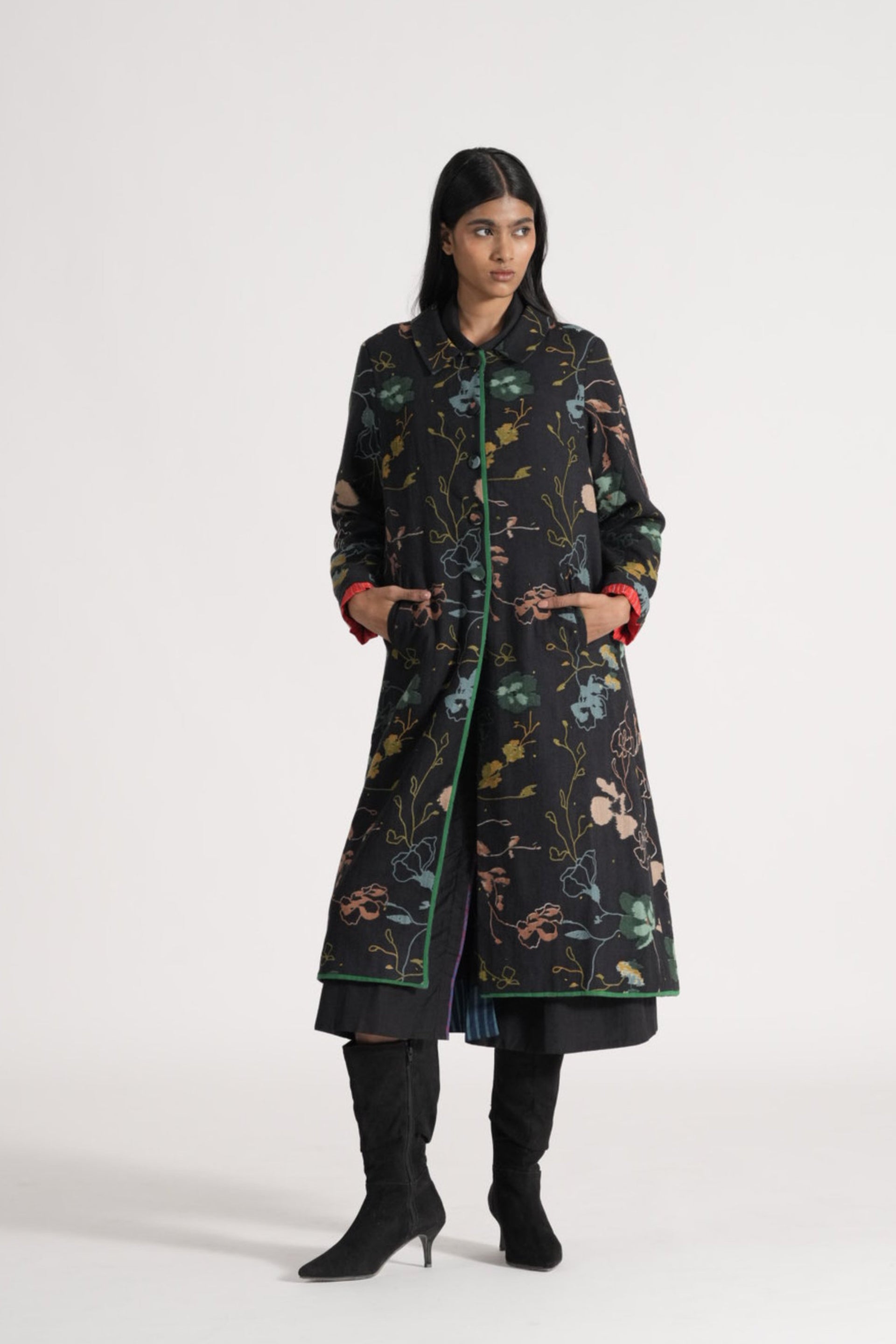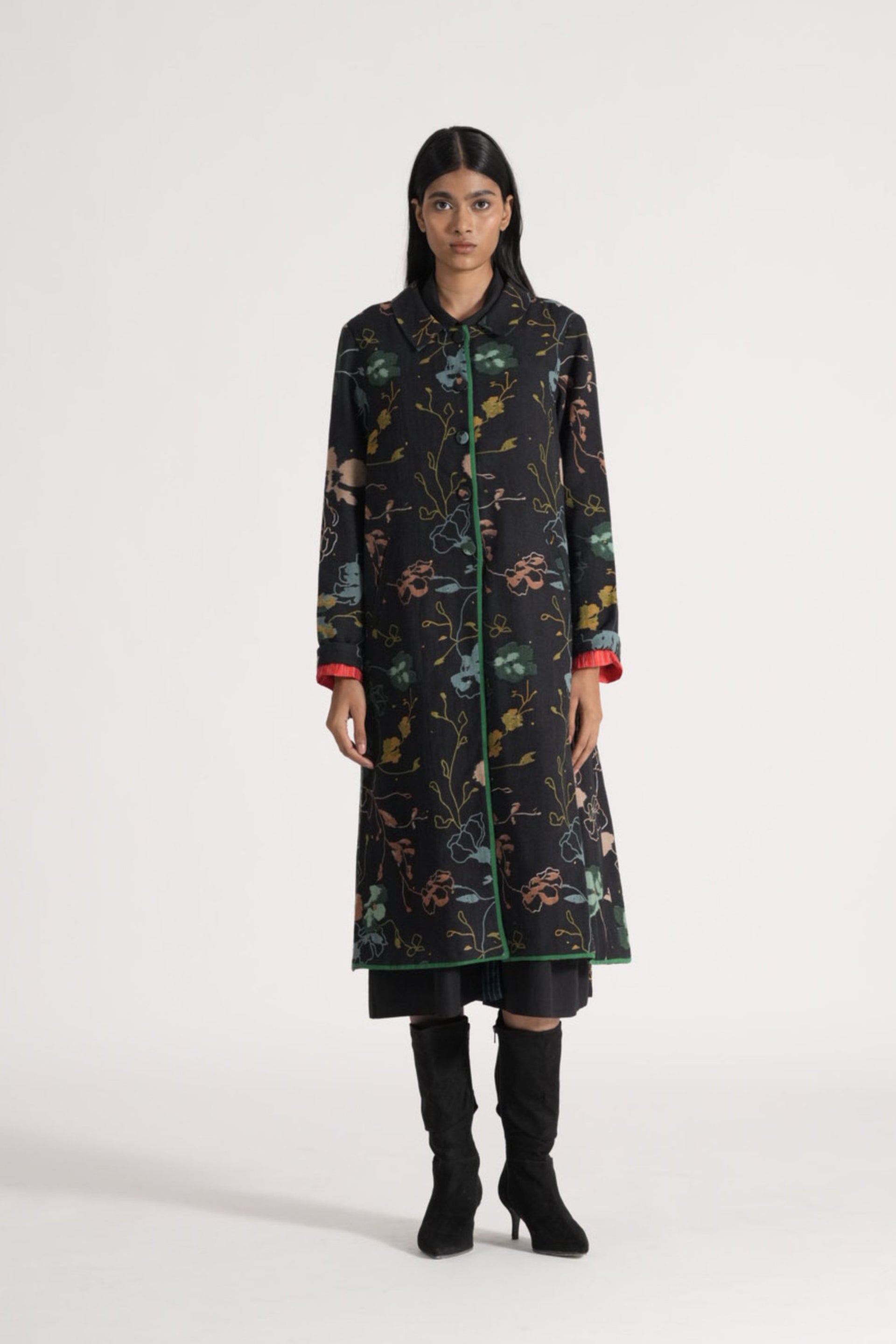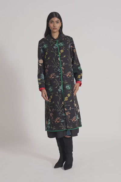 Button Down Straight Fit Jacket With Flat Collar With Contrast Piping and Double Gauze Padding In Multicolor All Over Print In 100% Merino Wool. Lined With Handblock Print 100% Silk.