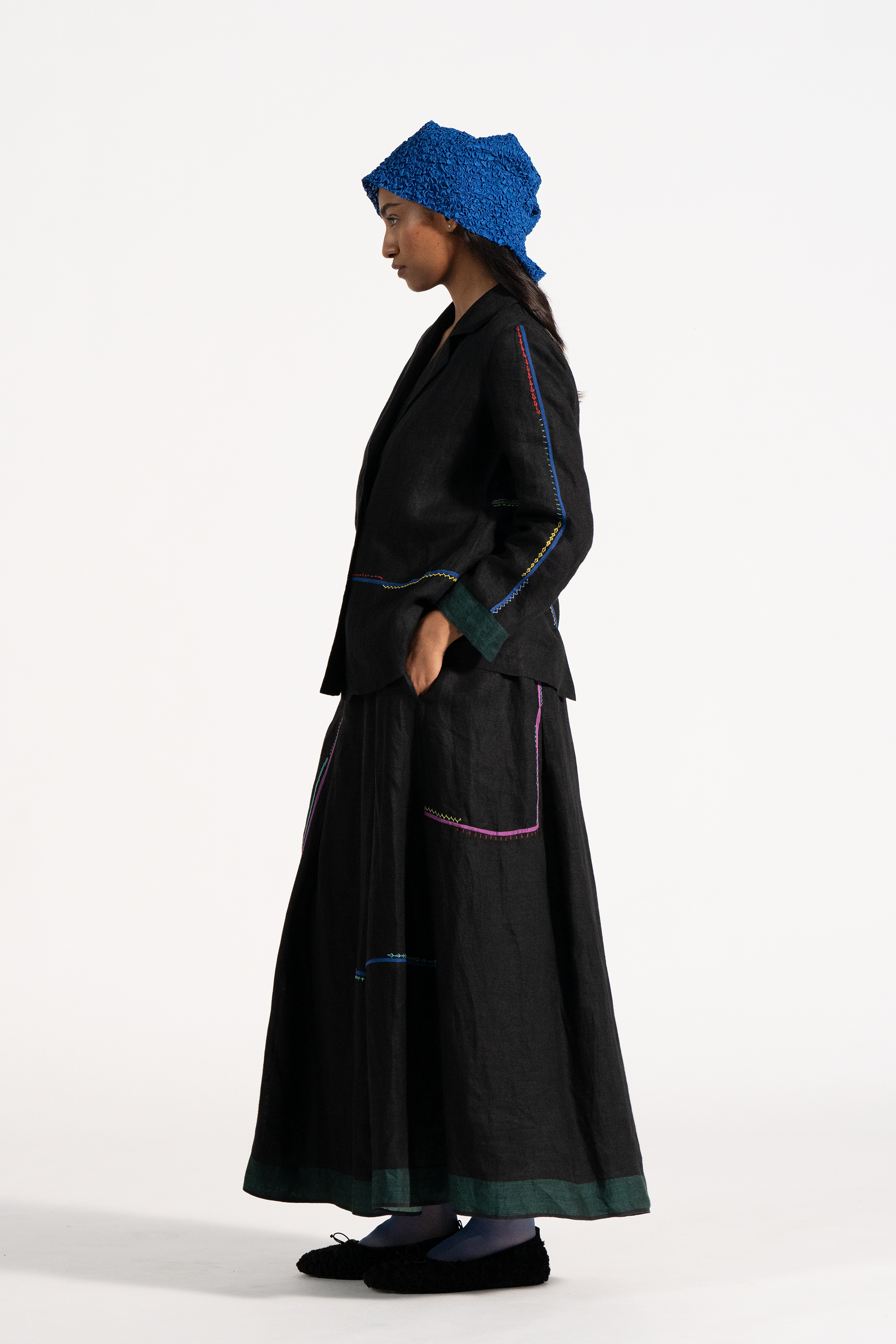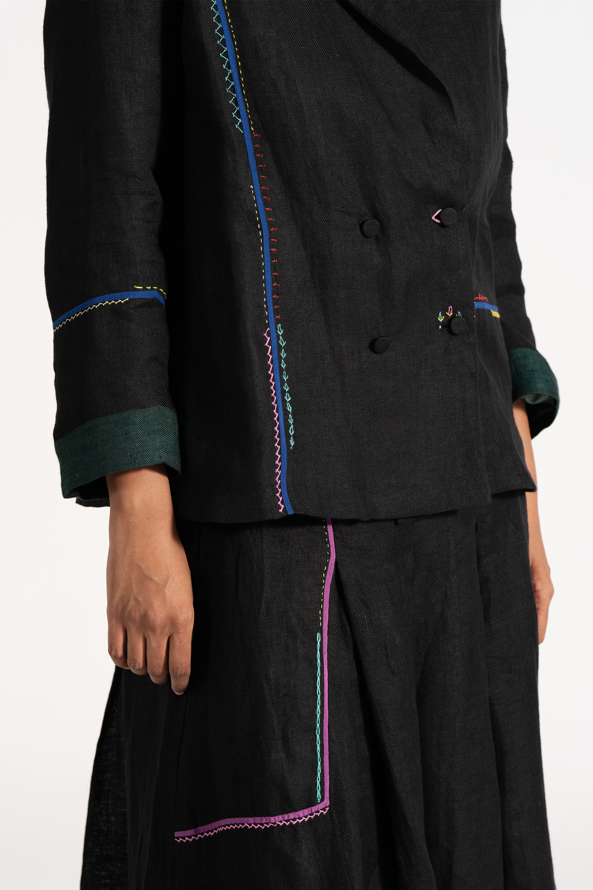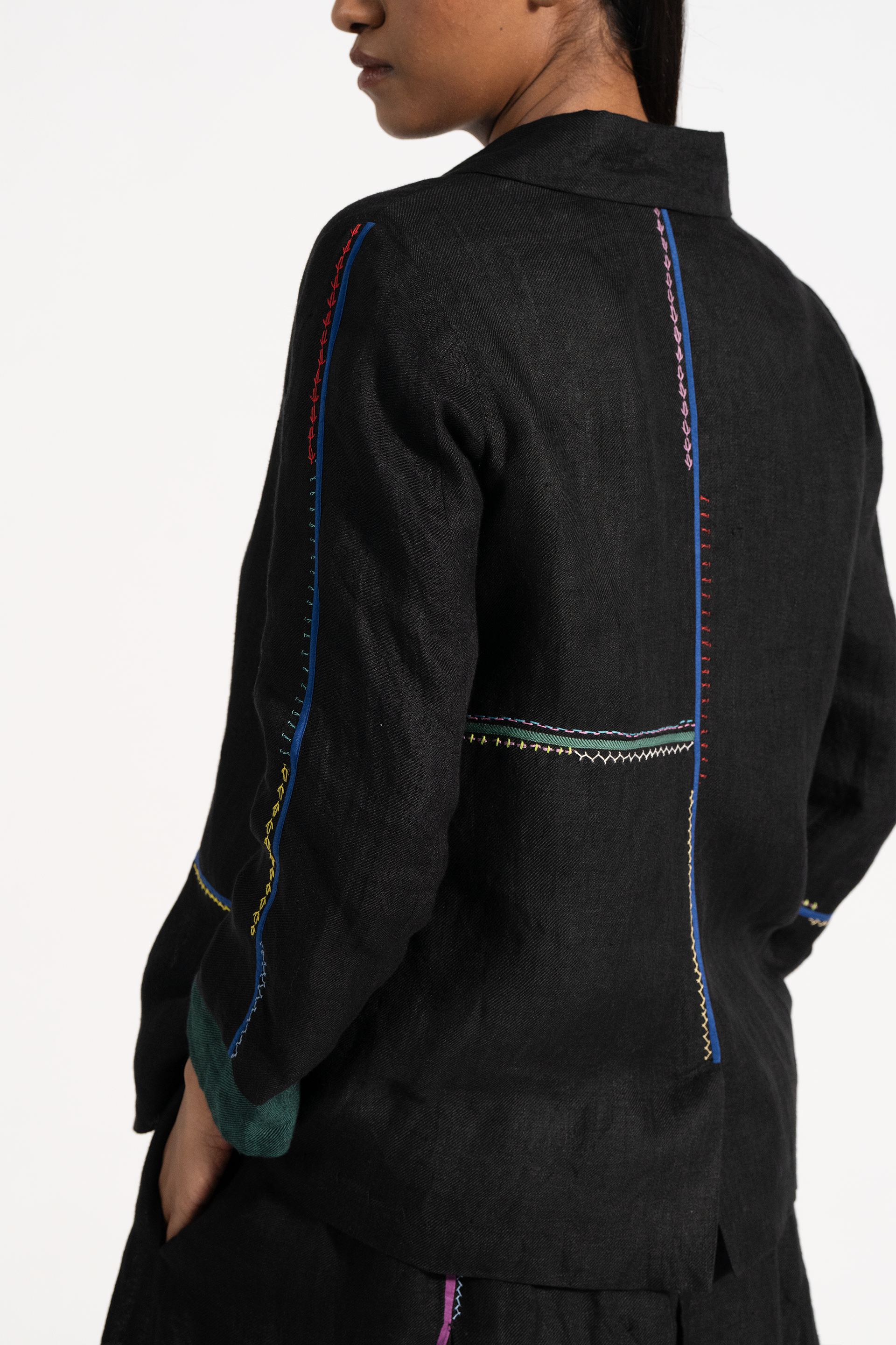 Relaxed Fit Short Jacket With Multicolor Delicate Hand Stitch Detail In 100% Linen Comes With Attcahed Lining.