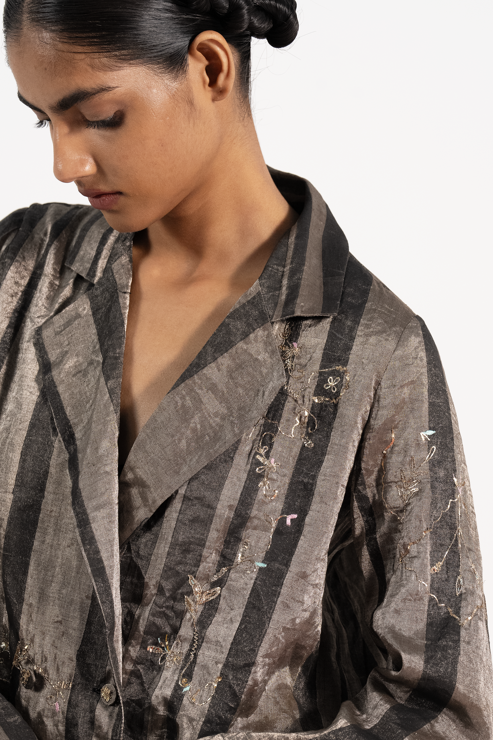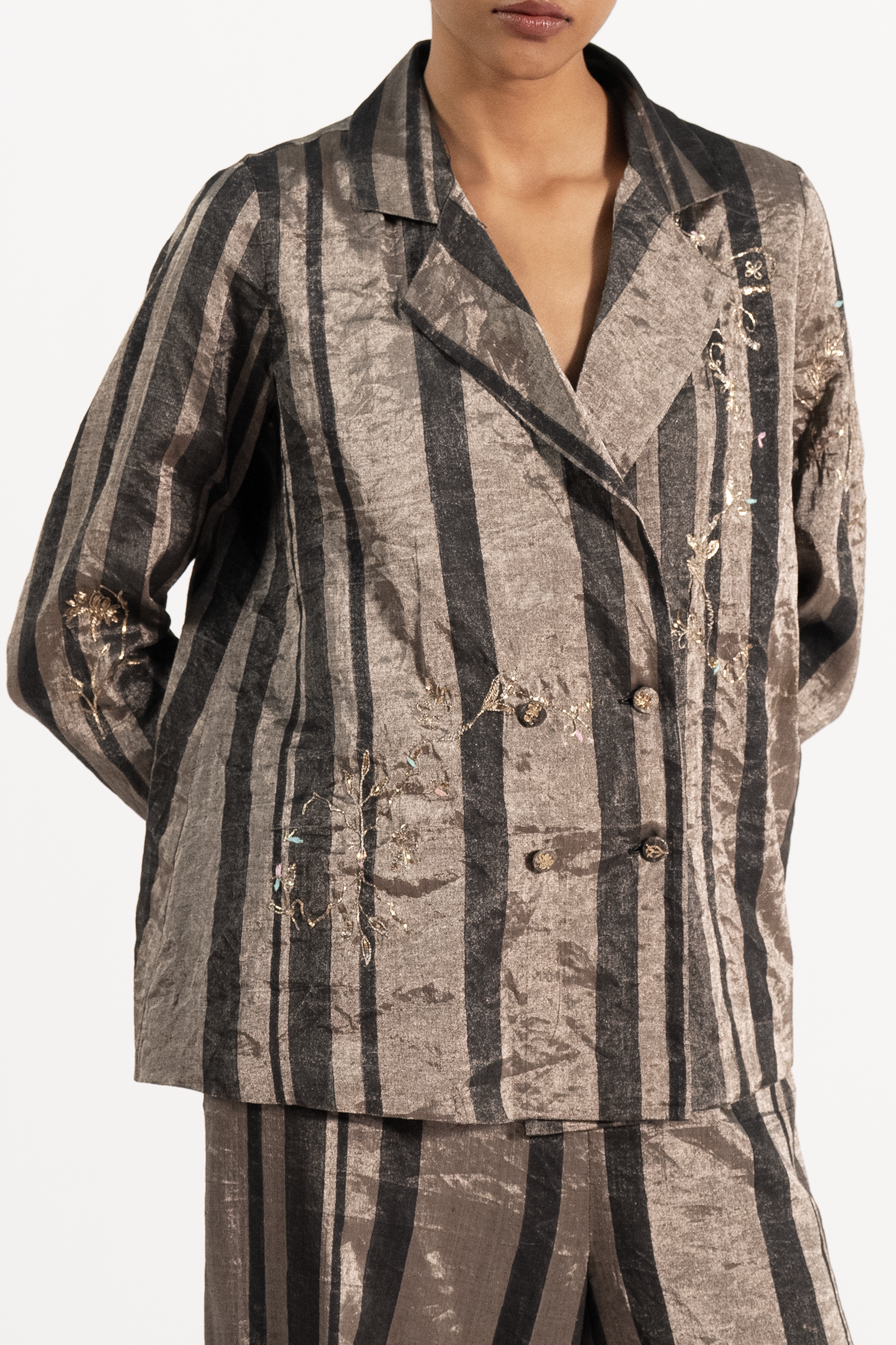 Short Striper Blazer With Hand Embroidery. Comes With An Attached 100% Attached Silk Lining. The Look Is Completed With A Straight Fit Trousers.