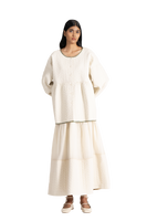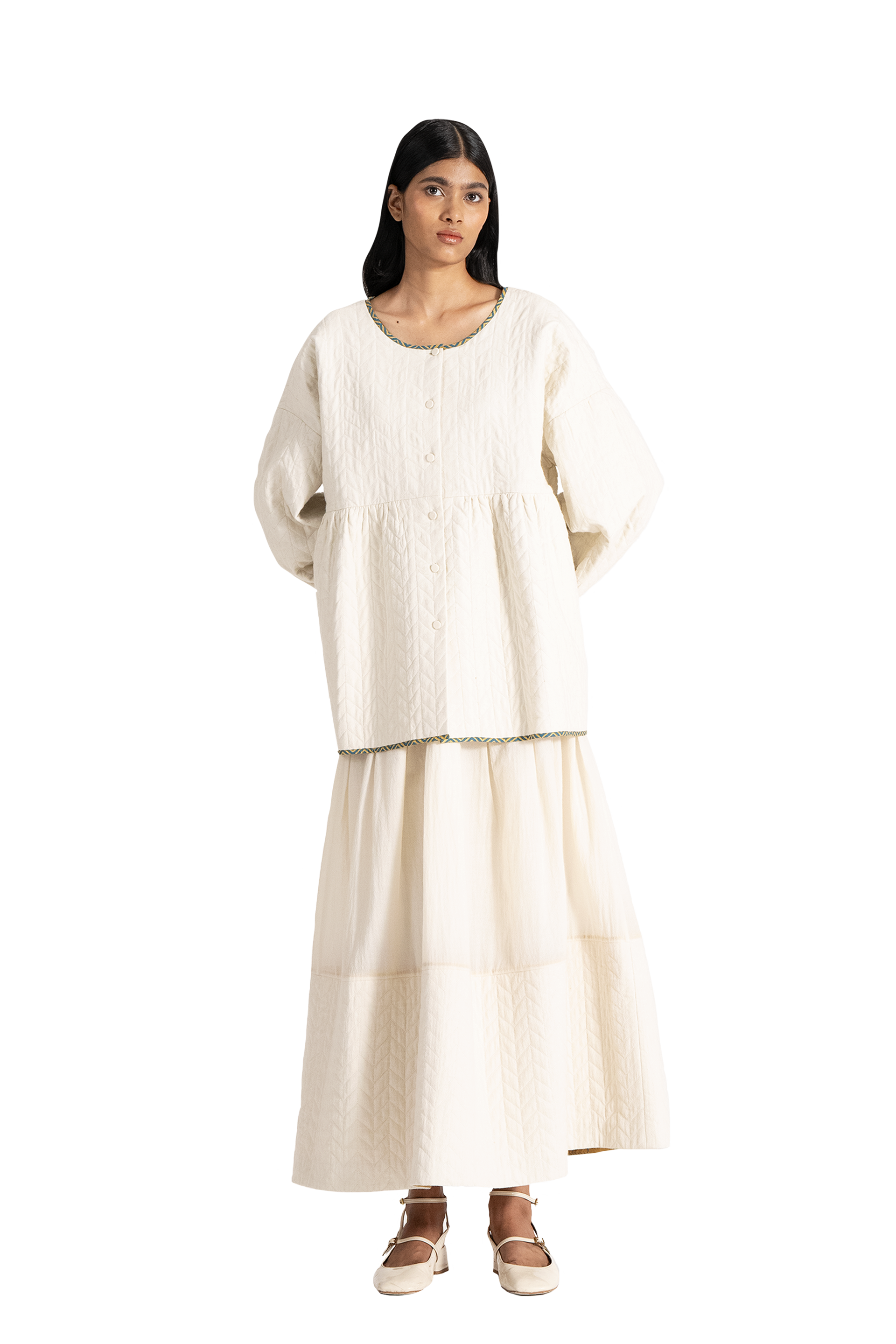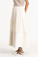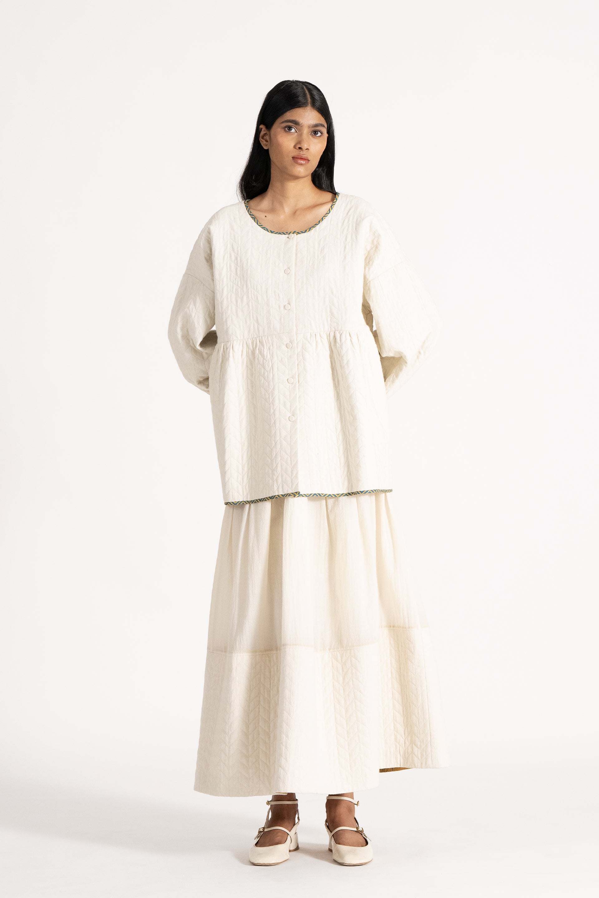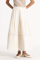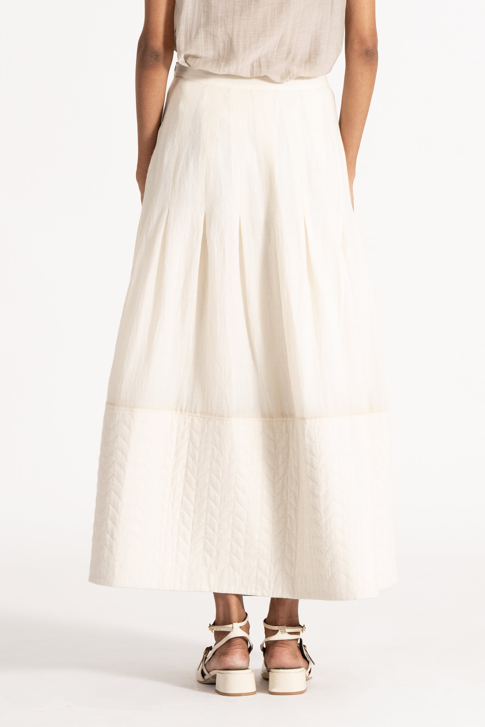 High waist maxi length skirt with inverted box pleat in wool silk linen and quilted 100% silk on hem. Lined with 100% silk lining.