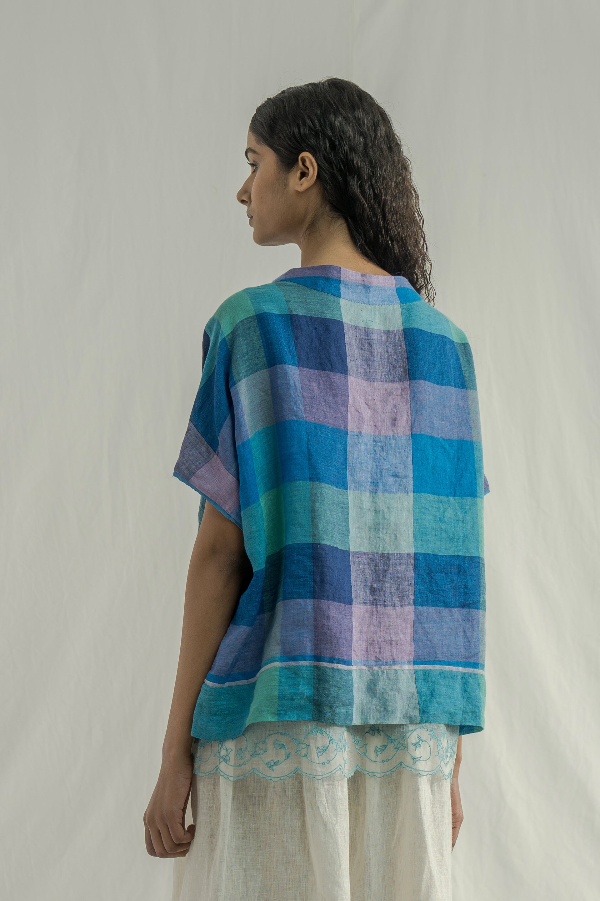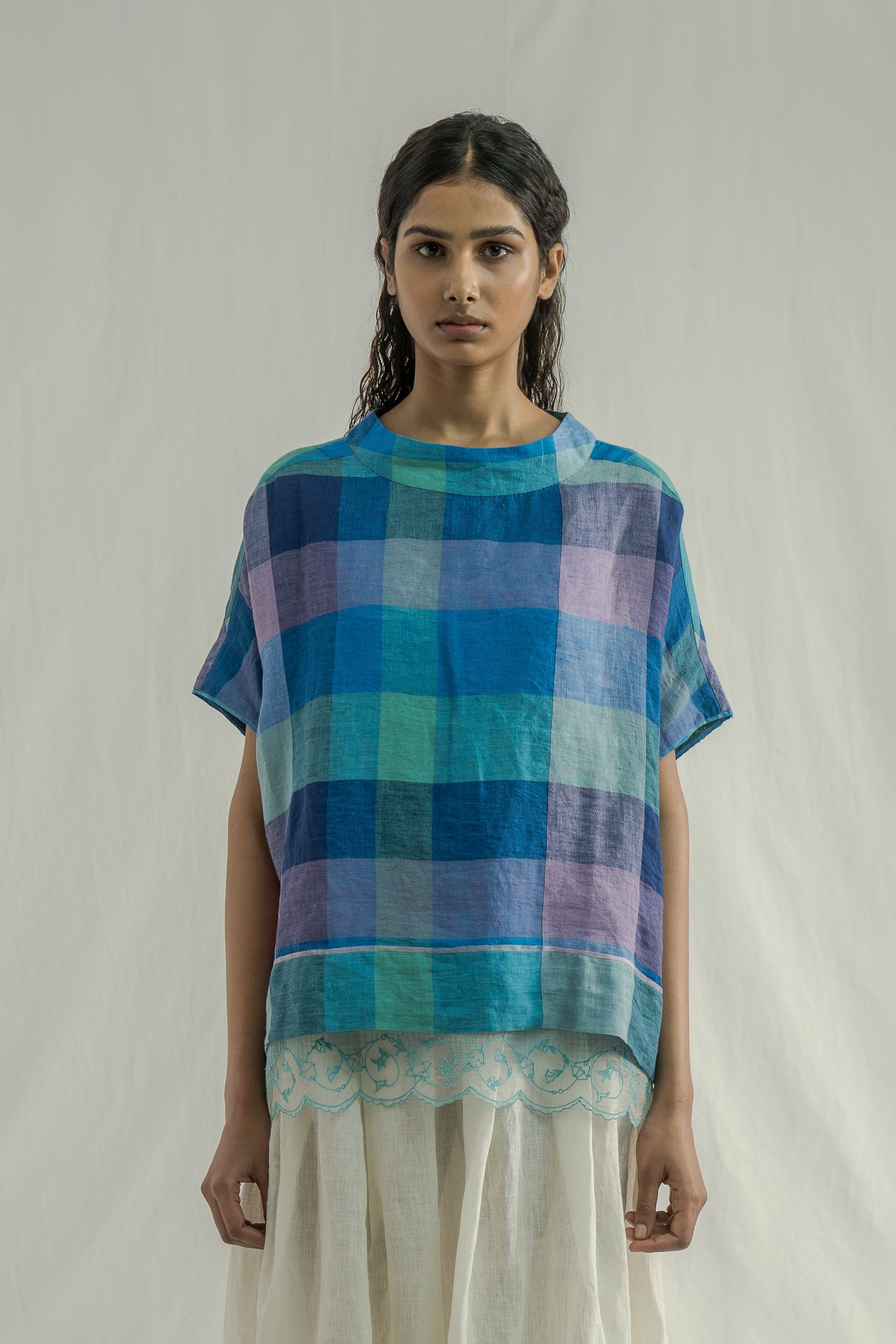 Crew neckline relaxed fit top with selvedge detail on the sleeves and hem. constructed in multicolor chunky checkered 100% linen fabric.