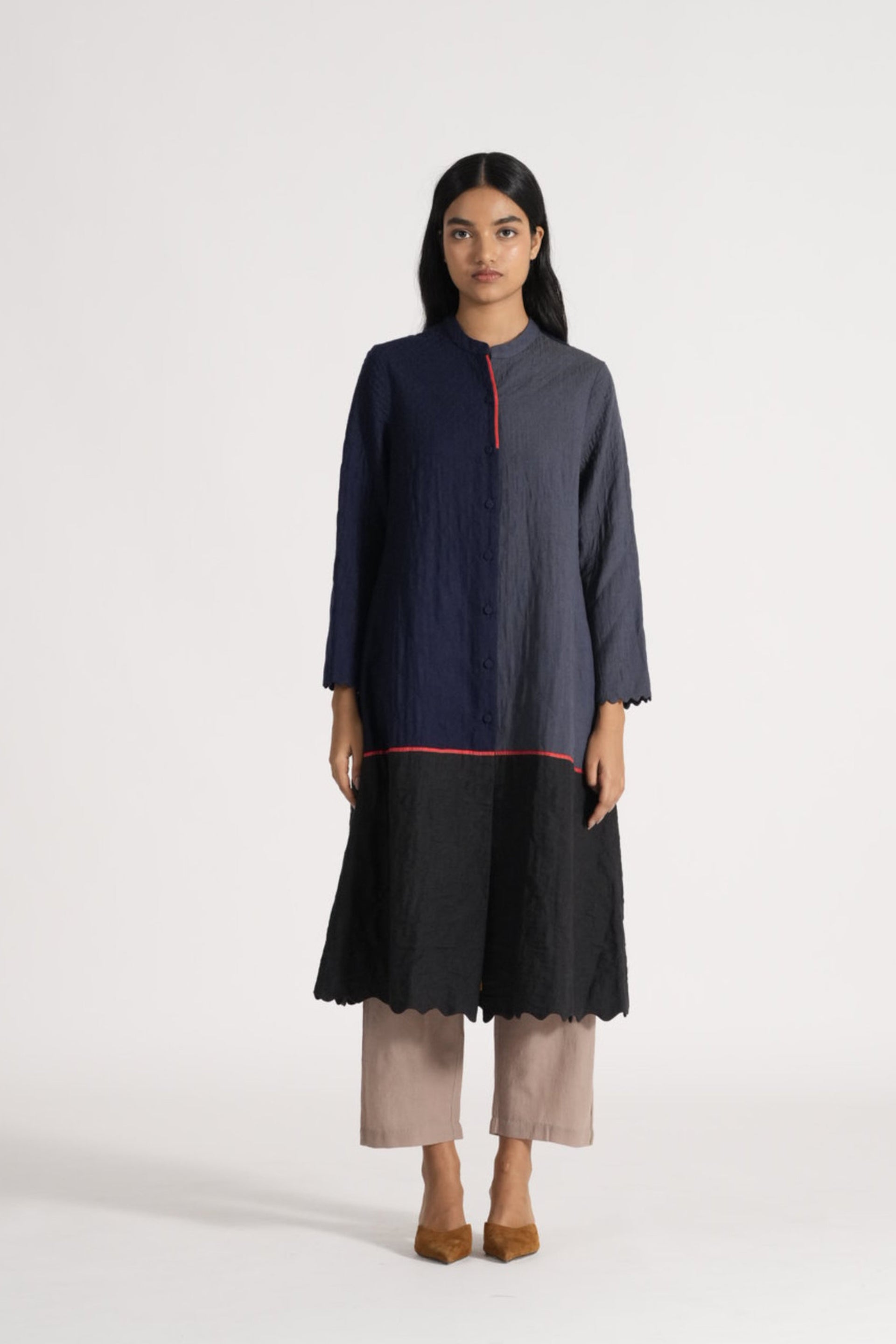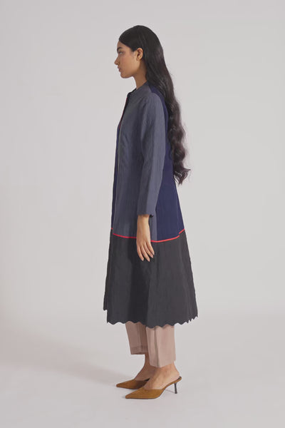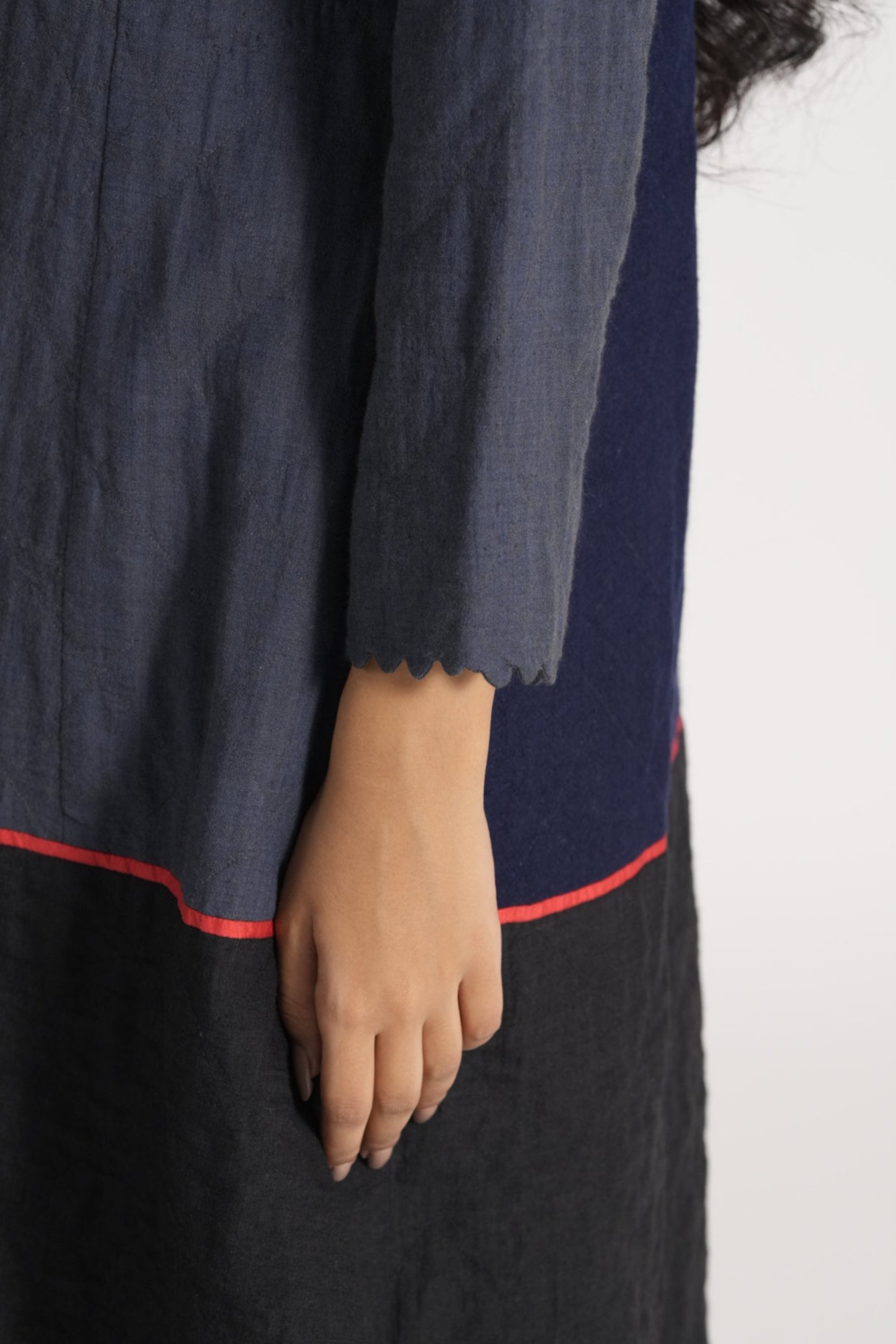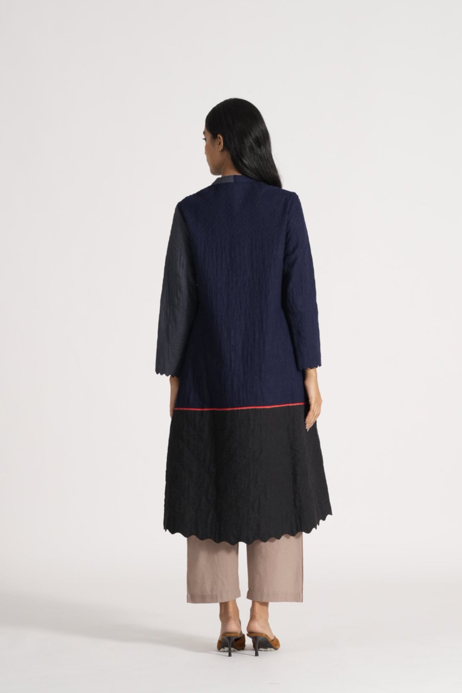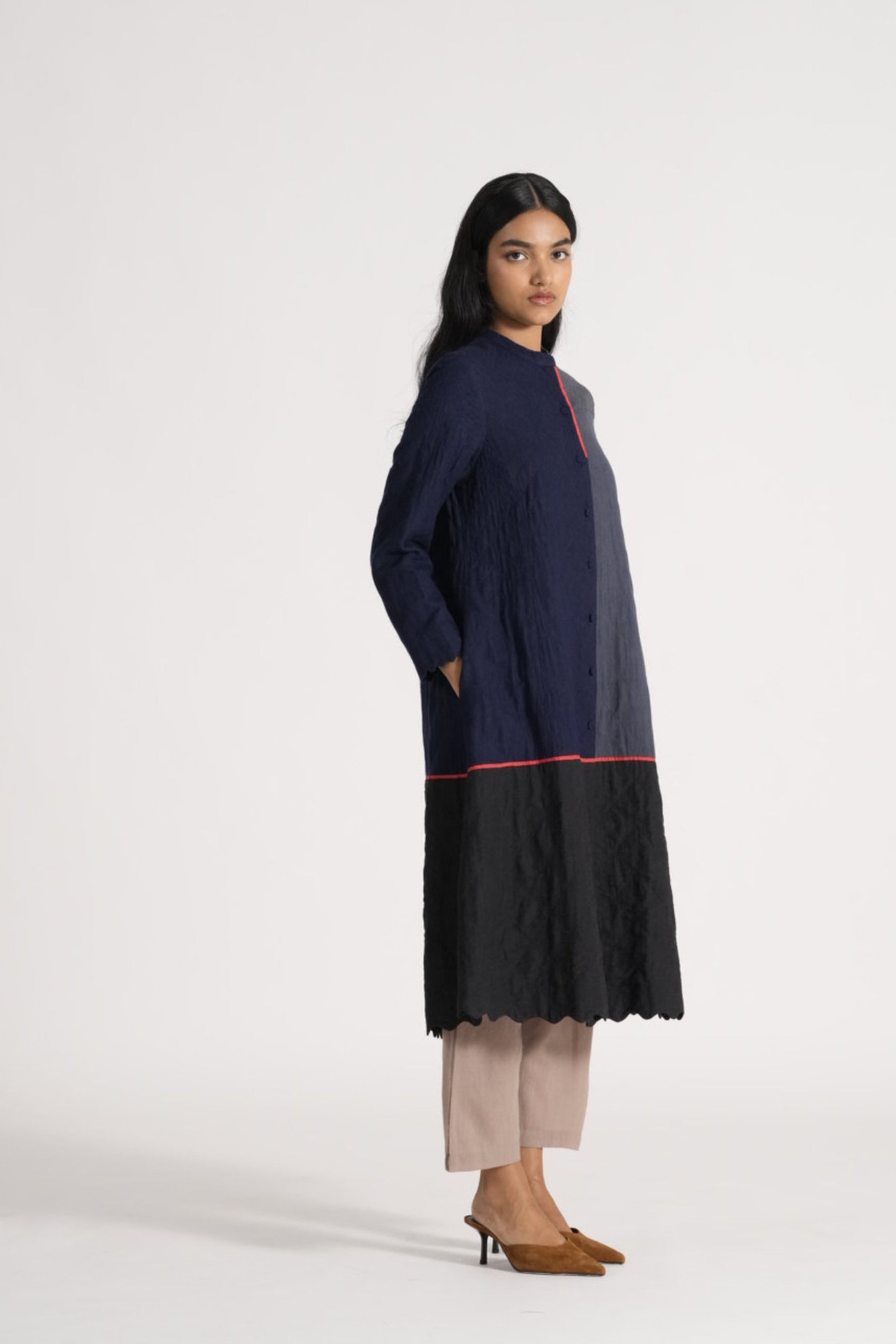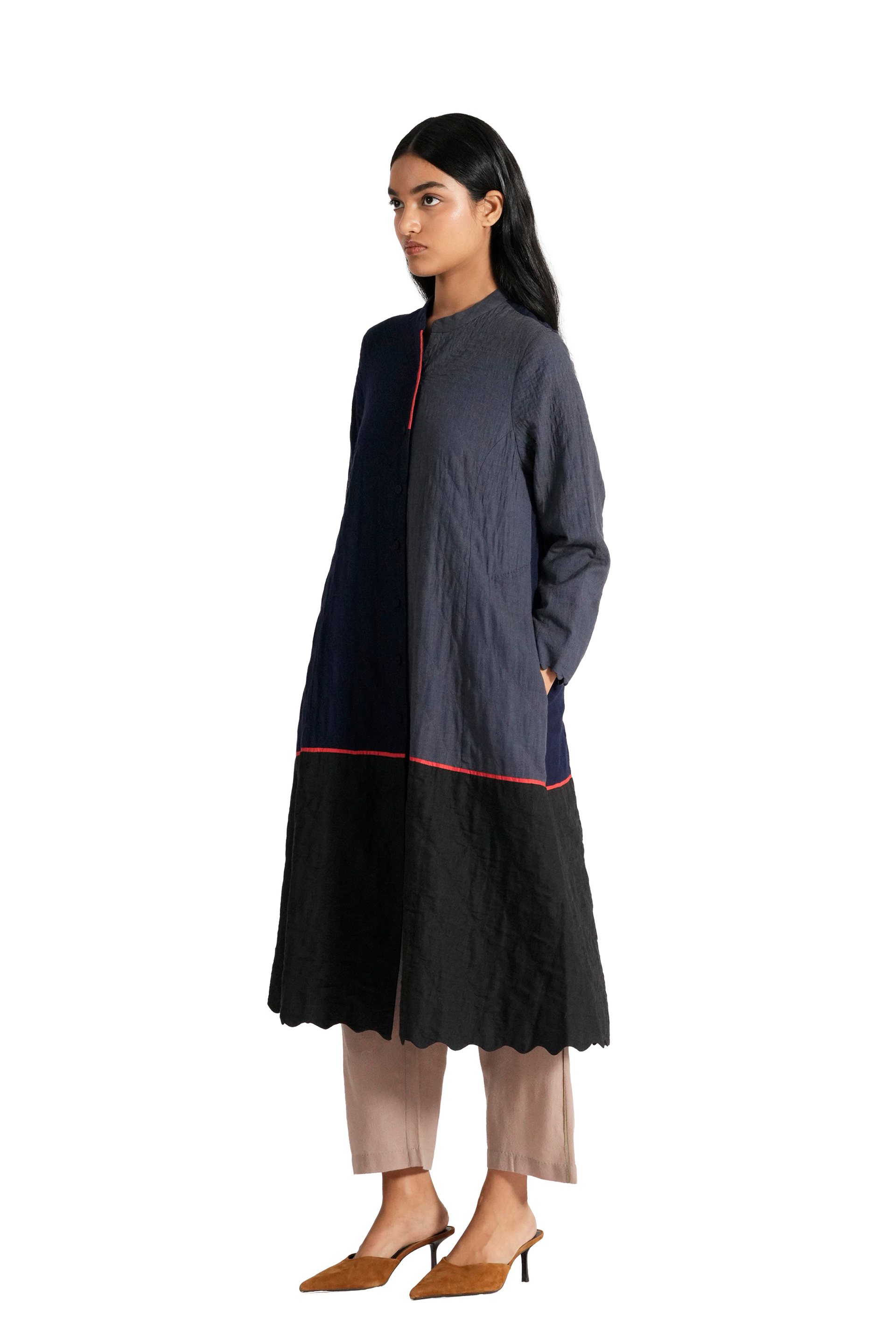 Button Down Midi Length A-line Jacket With Mandarin Collar And Scallop Deatil On Hem, In All Over Quilted Patchwork 100% Merino Wool And Wool Linen Silk Blend.