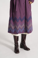 Relaxed fit double breasted long jacket with multicolor chevron on hem in 100% merino wool jacquard fabric. Lined with handblock print 100% silk.