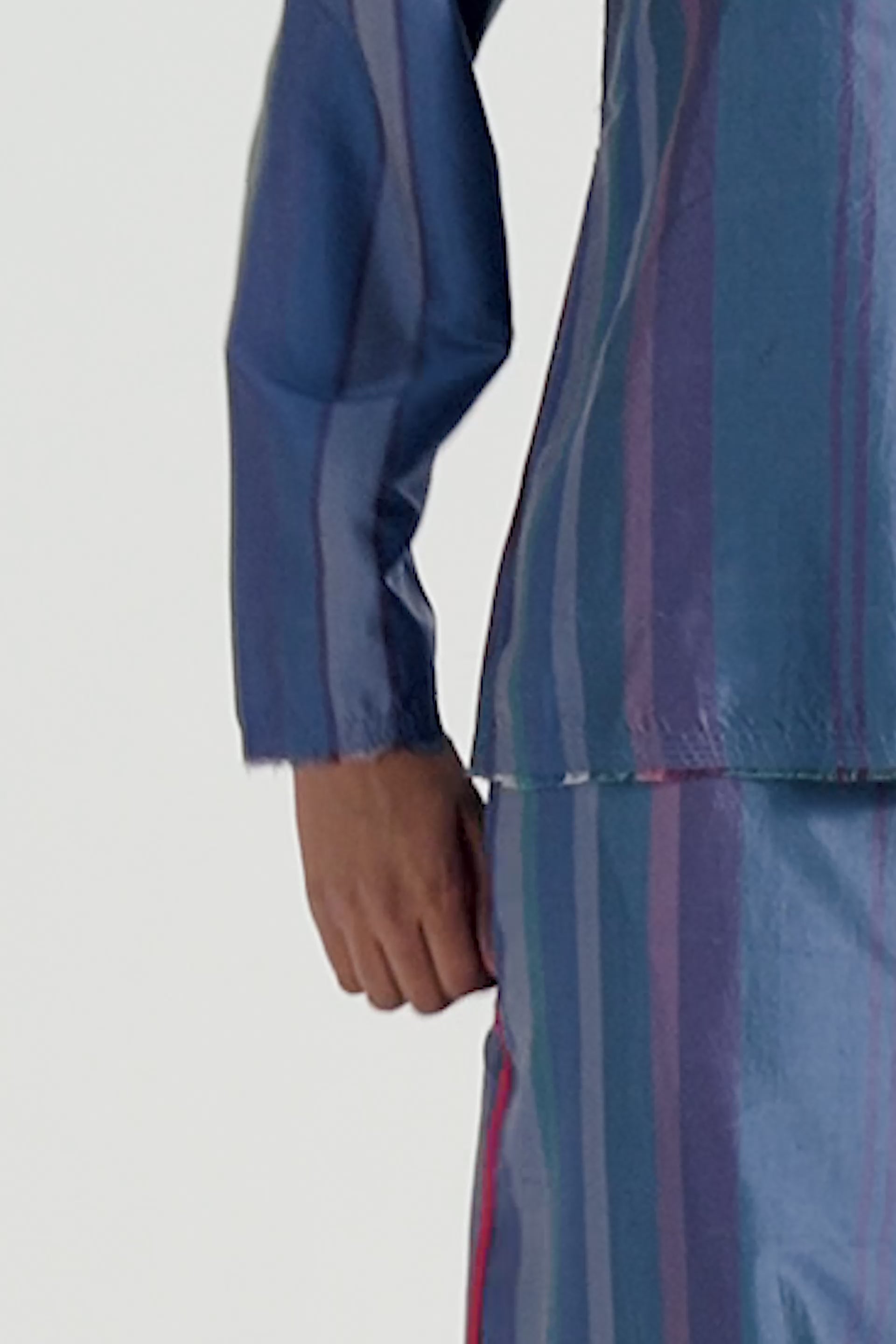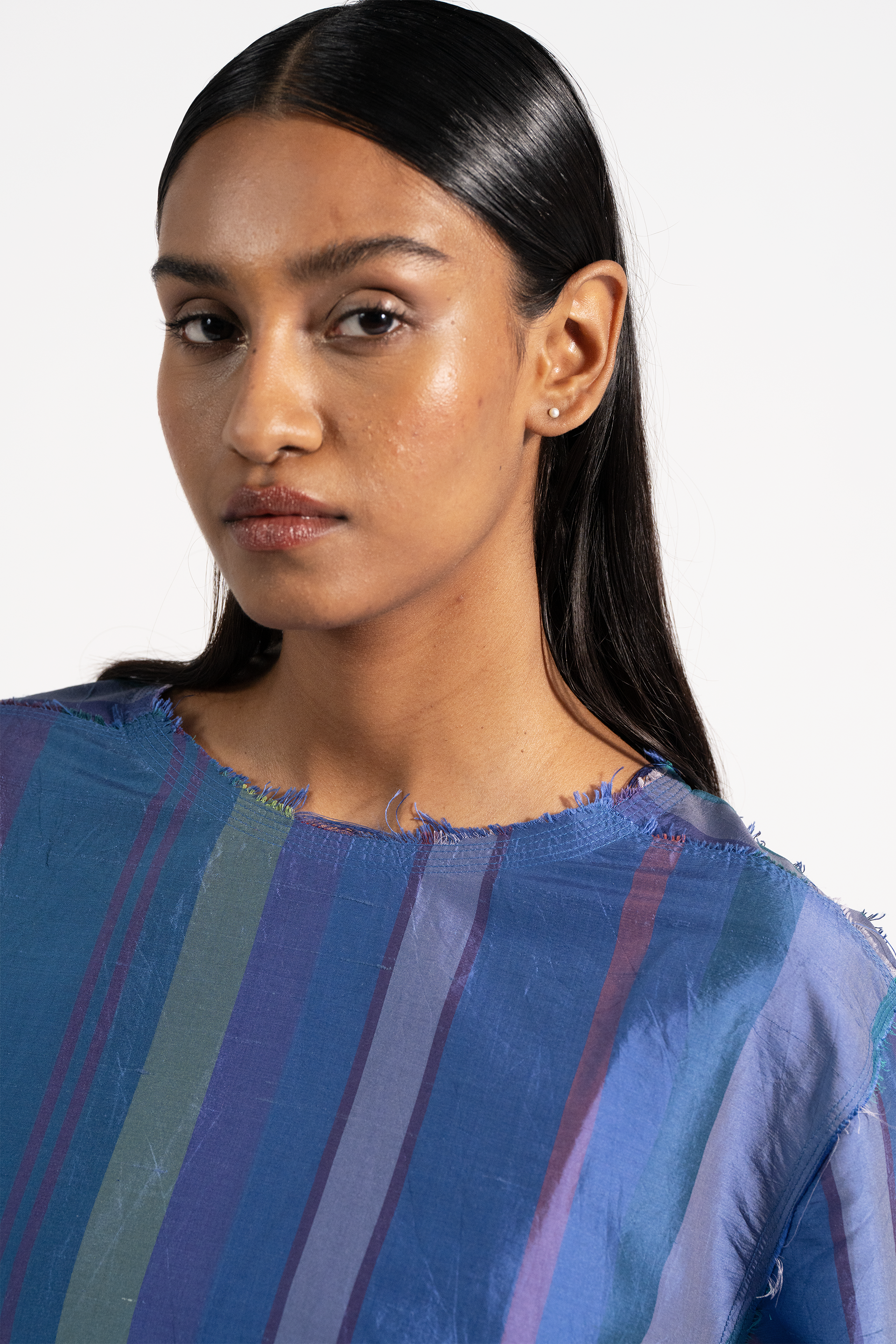 Relaxed Fit Round Neck Top With Raw Edges In Tonal Self Striper 100% Silk