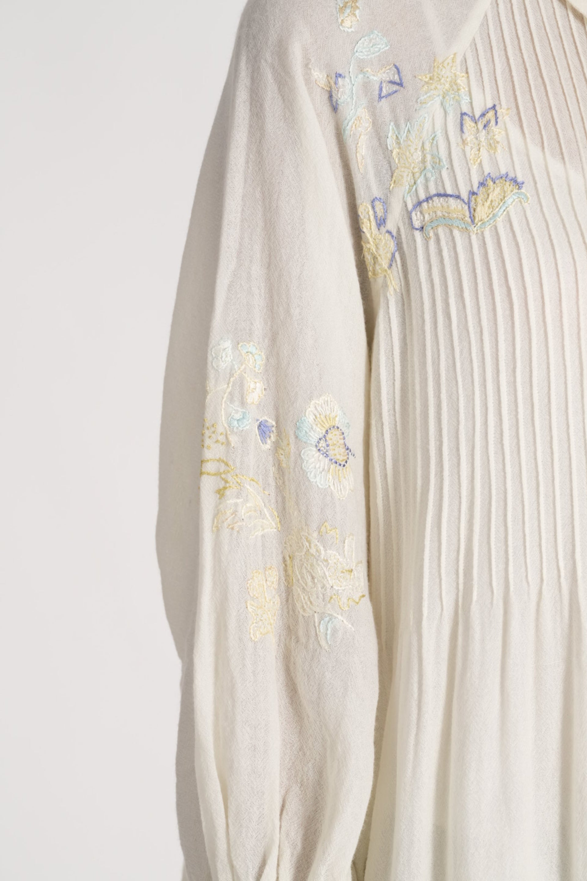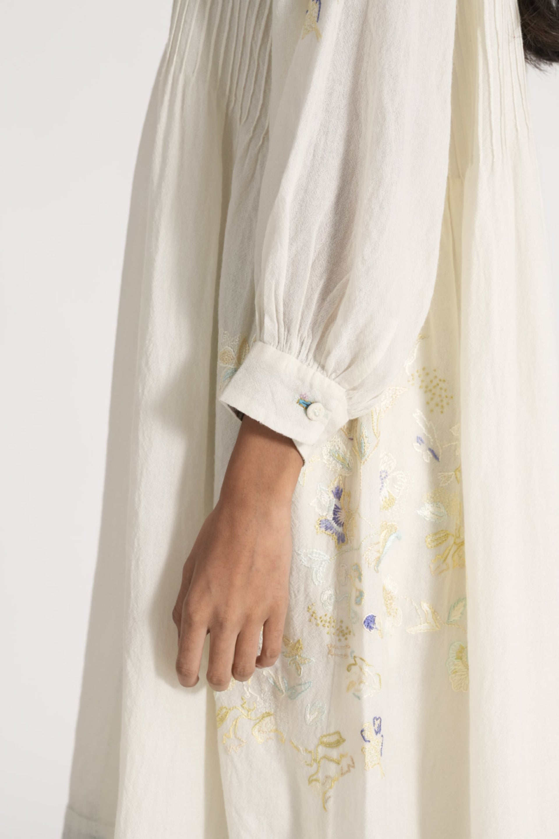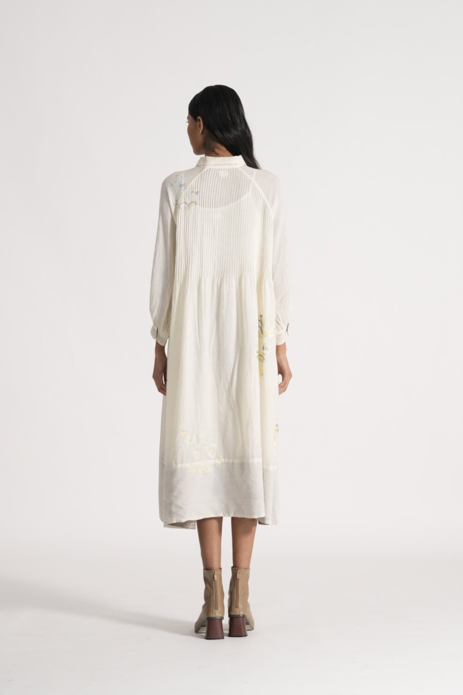 Relaxed Fit Button Down Midi Dress With Raglan Sleeves With Intricate Floral Placement Hand Embroidery In 100% Merino Wool With 100% Silk Quilted Hem.