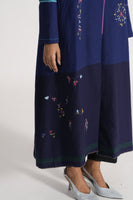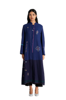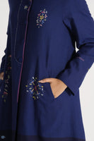 Button Down Straight Fit Long Jacket With Multicolor Delicate Hand Stitch Details And Floral Placement Hand Embroidery On 100% Merino Wool. Lined With Handblock Printed 100% Silk