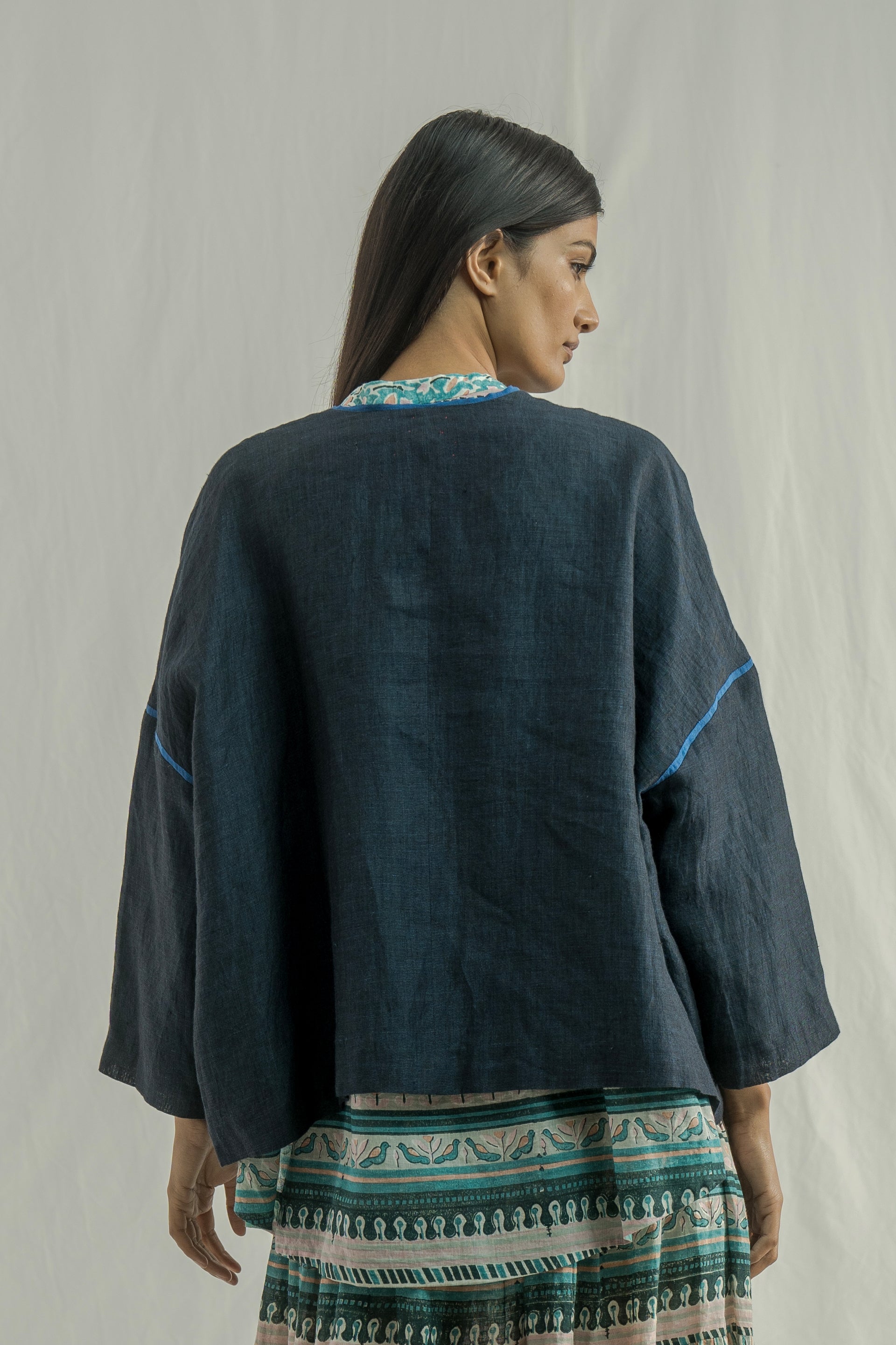 A relaxed-fit, double-breasted V-neck short jacket with a drop shoulder design. It features front pockets, contrast piping along the placket and sleeves. Crafted in 100% linen, having placement handblock printed cotton silk lining.