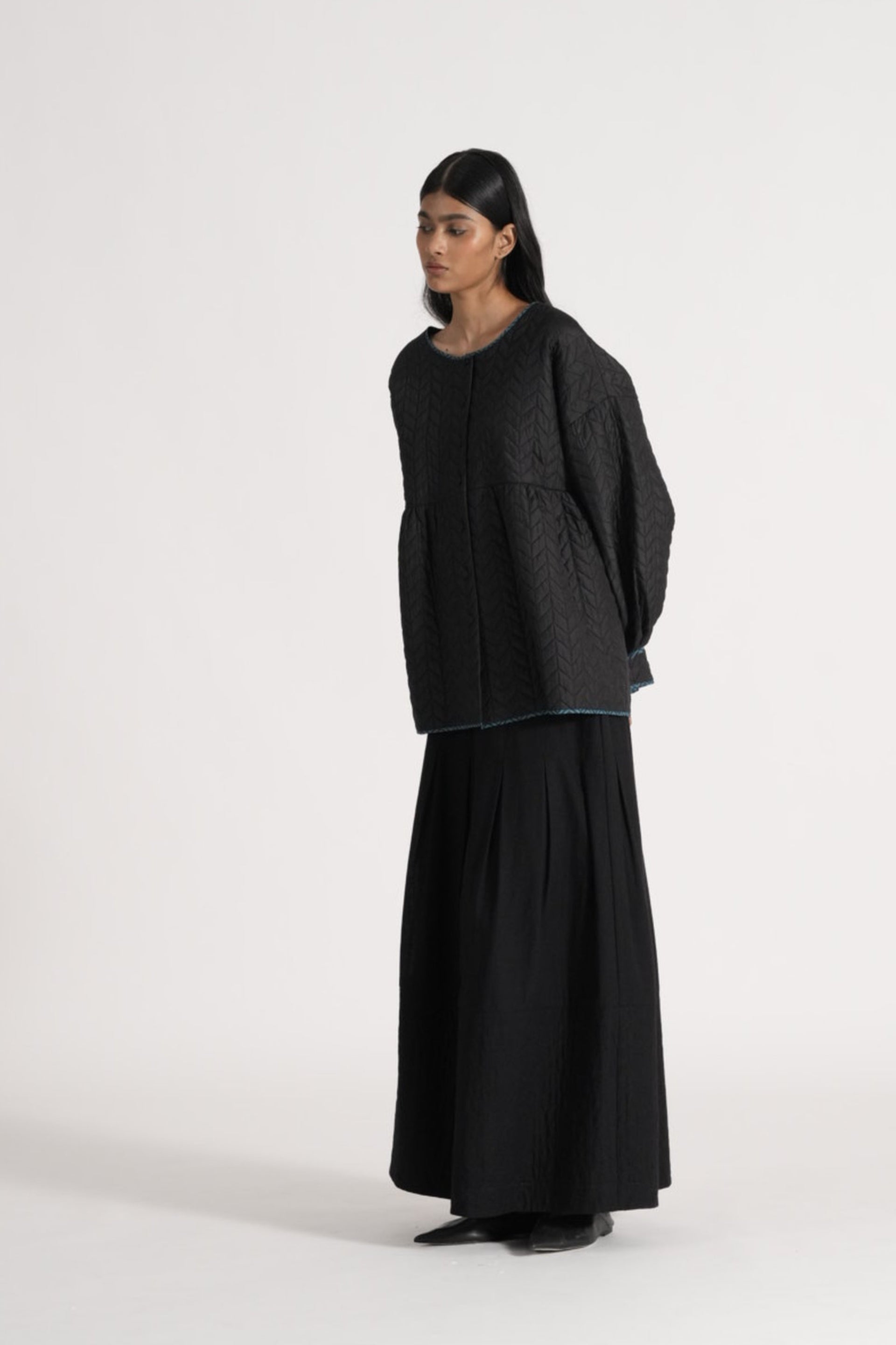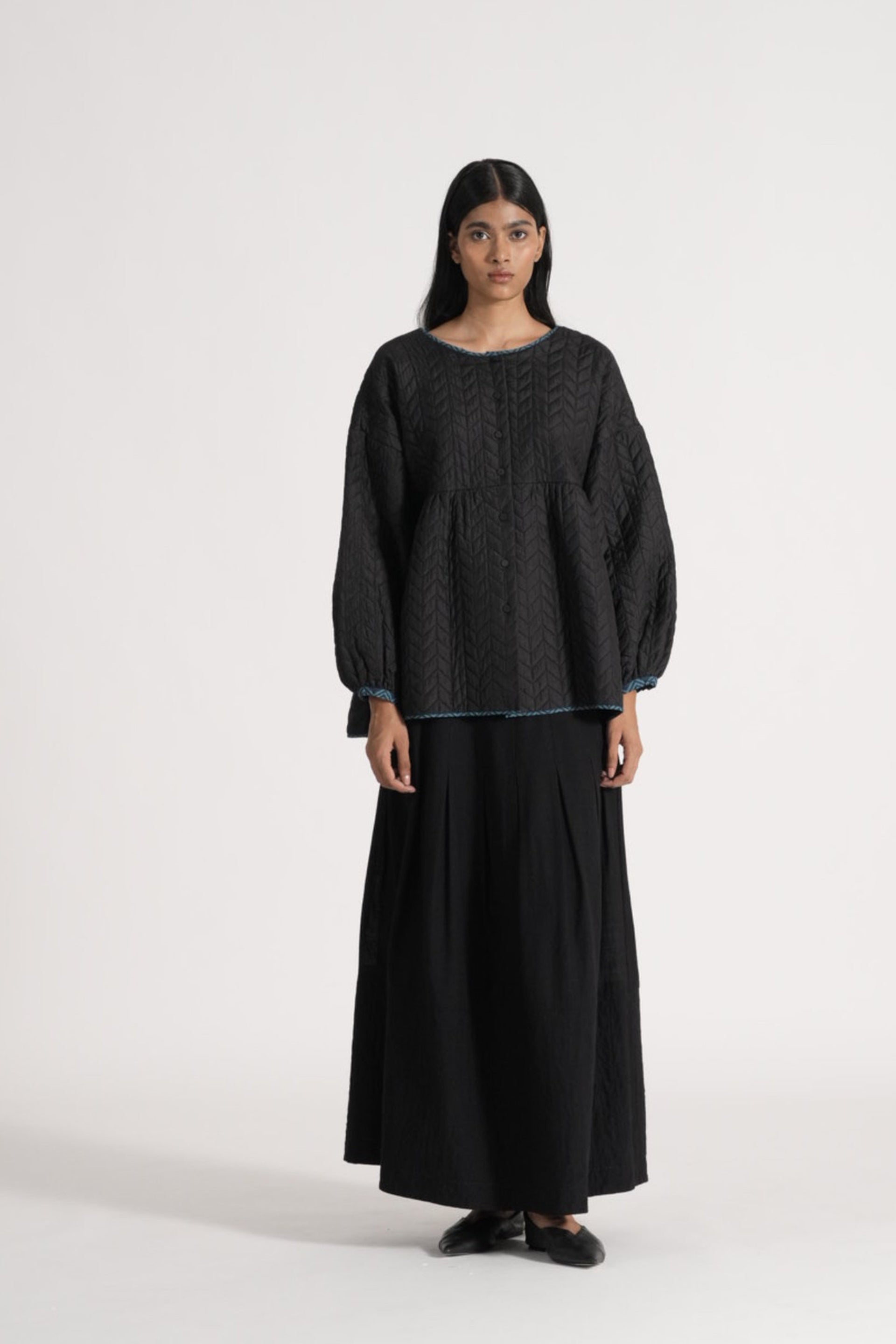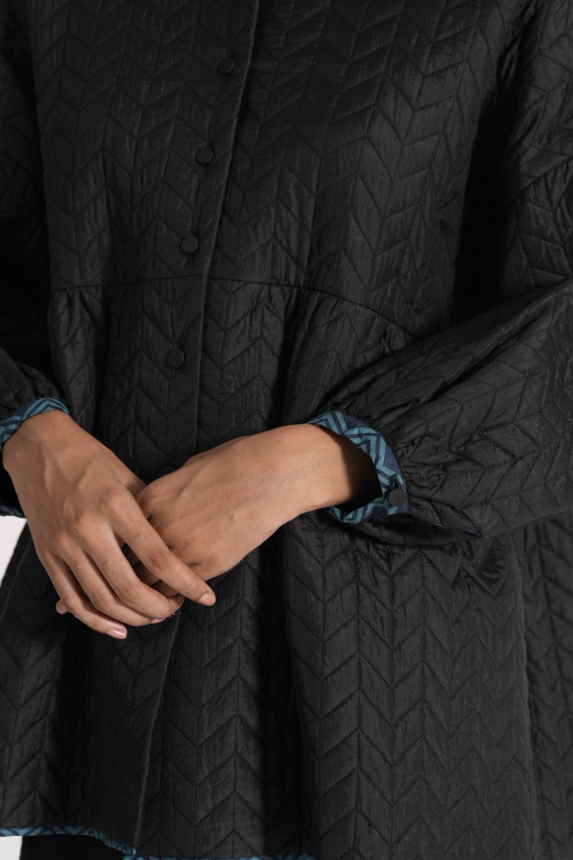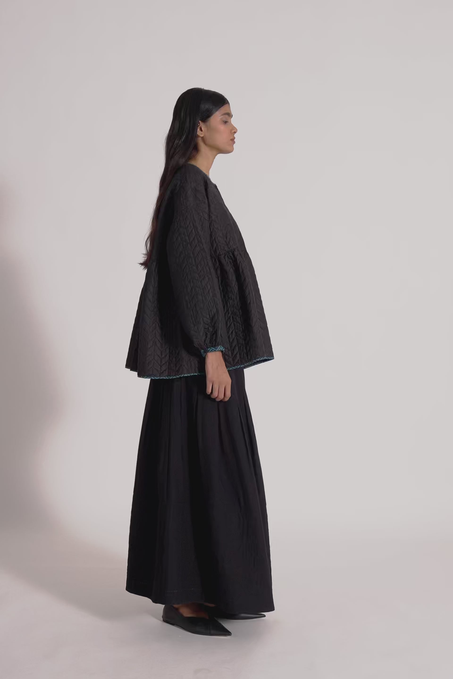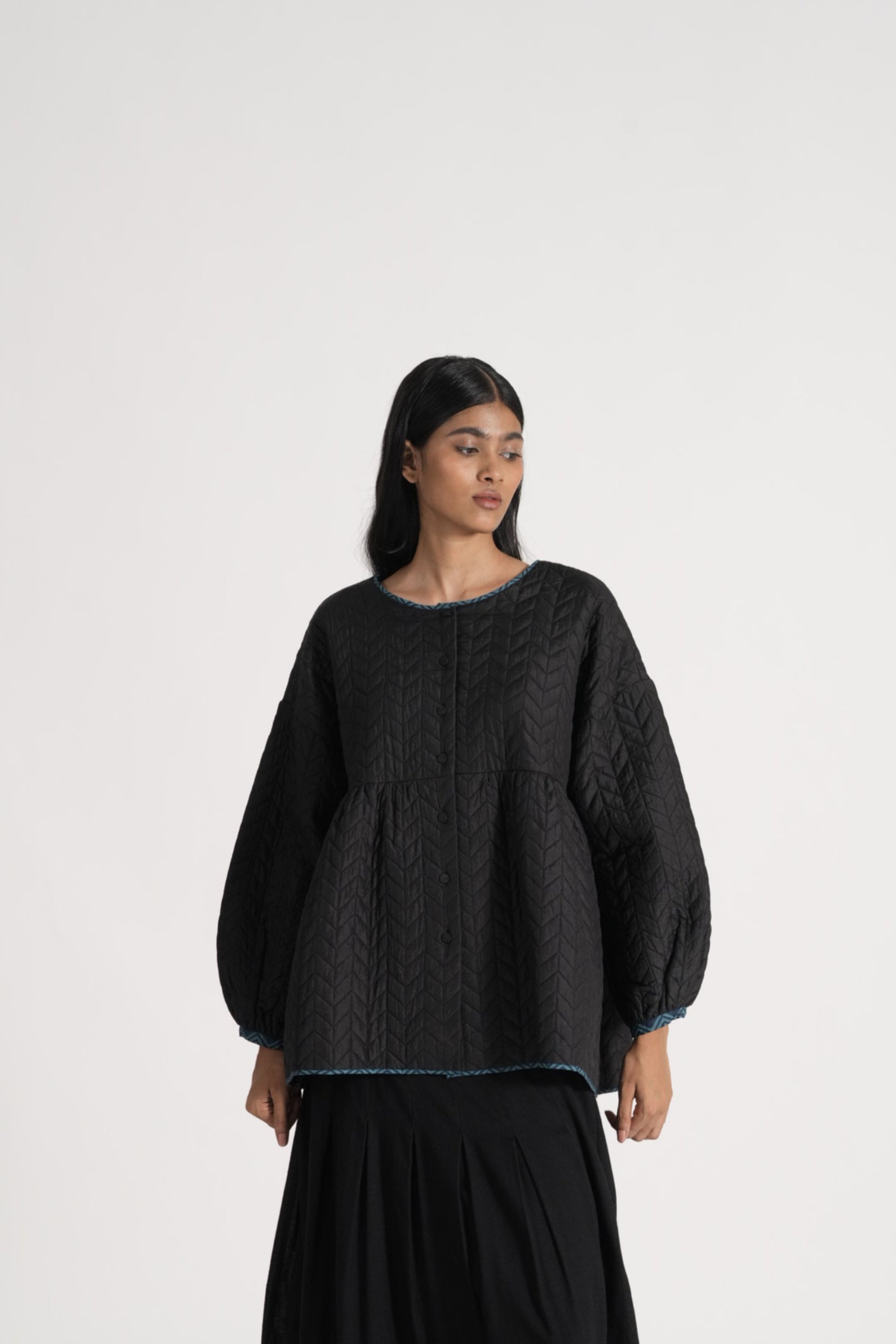 Round Neck Quilted Top In 100% SILK, Finished With Handblock Print Piping Detail. Lined With 100% Silk.