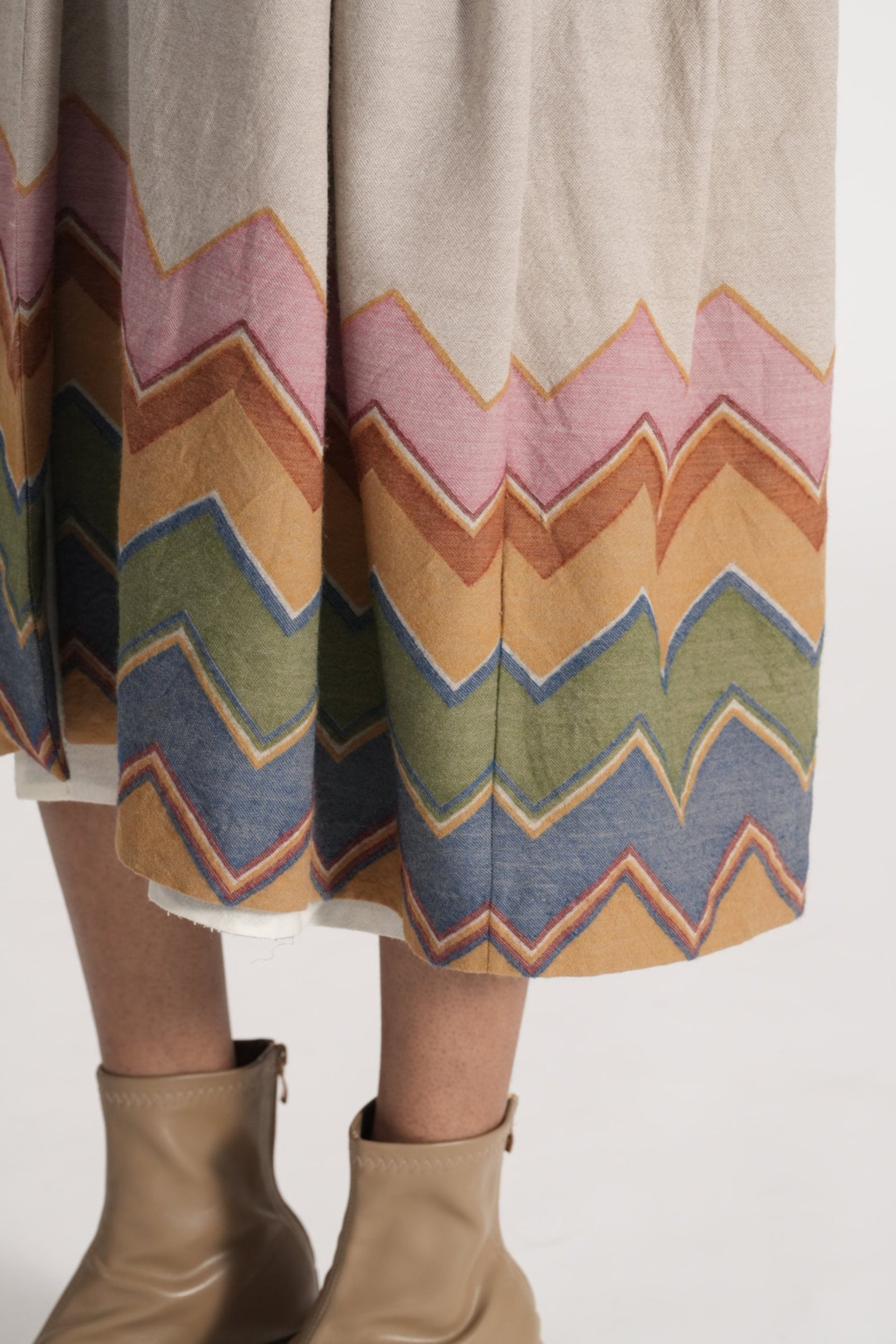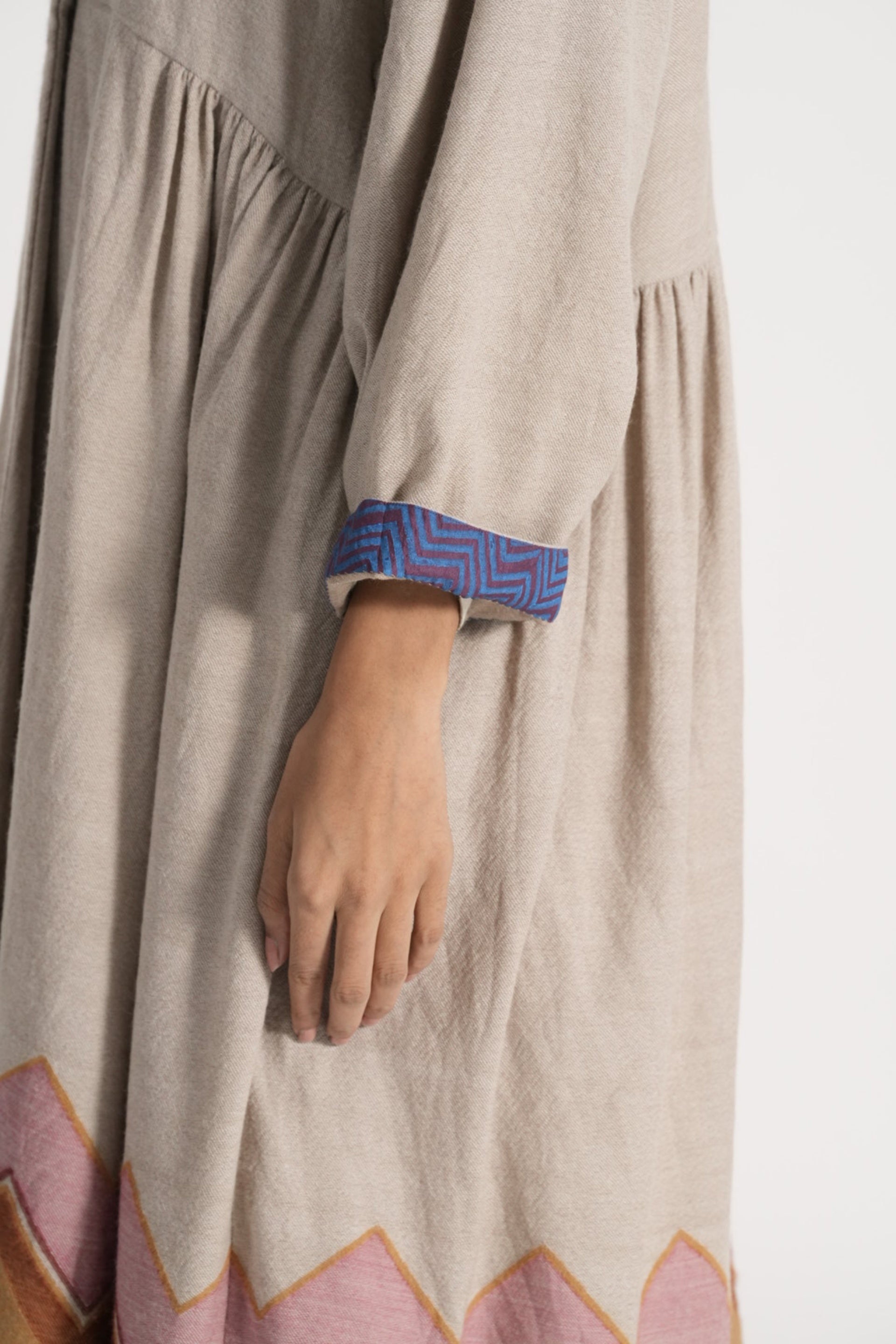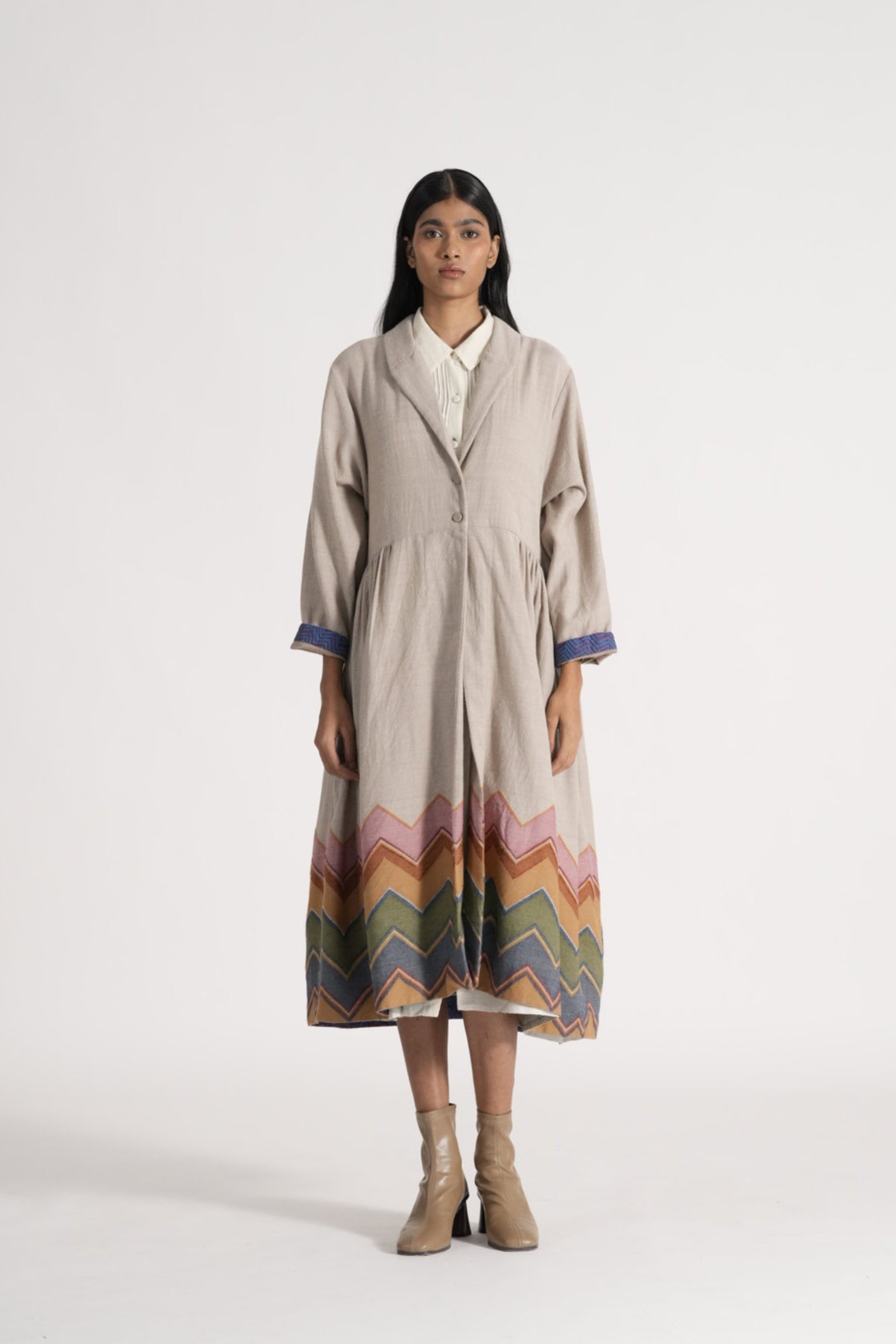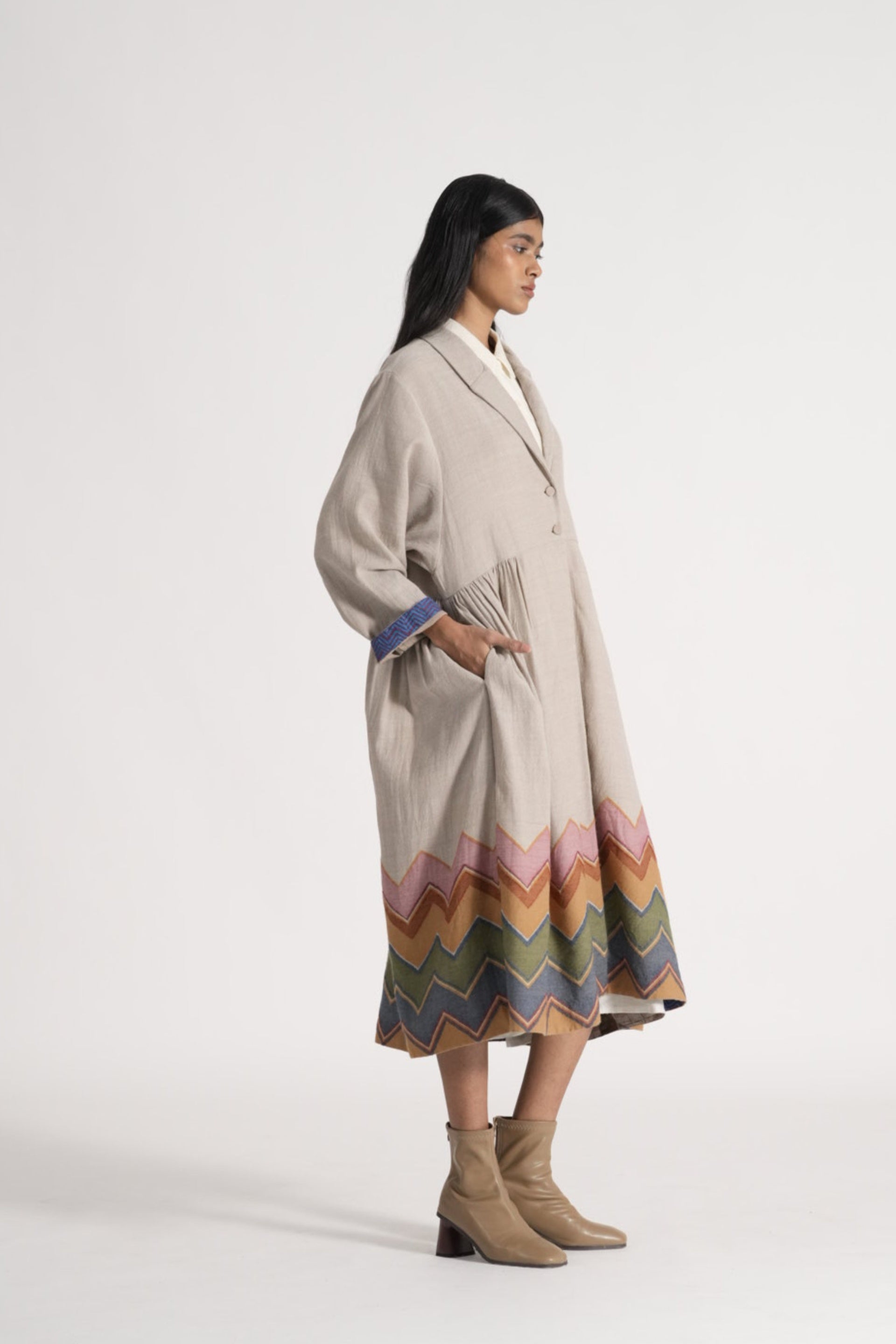 Relaxed fit long jacket with single button with multicolor chevron on hem in 100% merino wool jacquard. Lined with handblock print 100% silk.