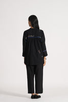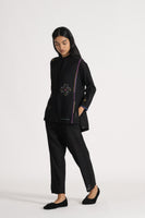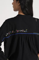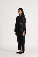 Relaxed Fit, Mandrain Collar Button Down Shirt With High Low Hem And Side Slit. Embroidered With Multicolor Floral Motifs And Delicate Hand Stitches In 100% Merino Wool.