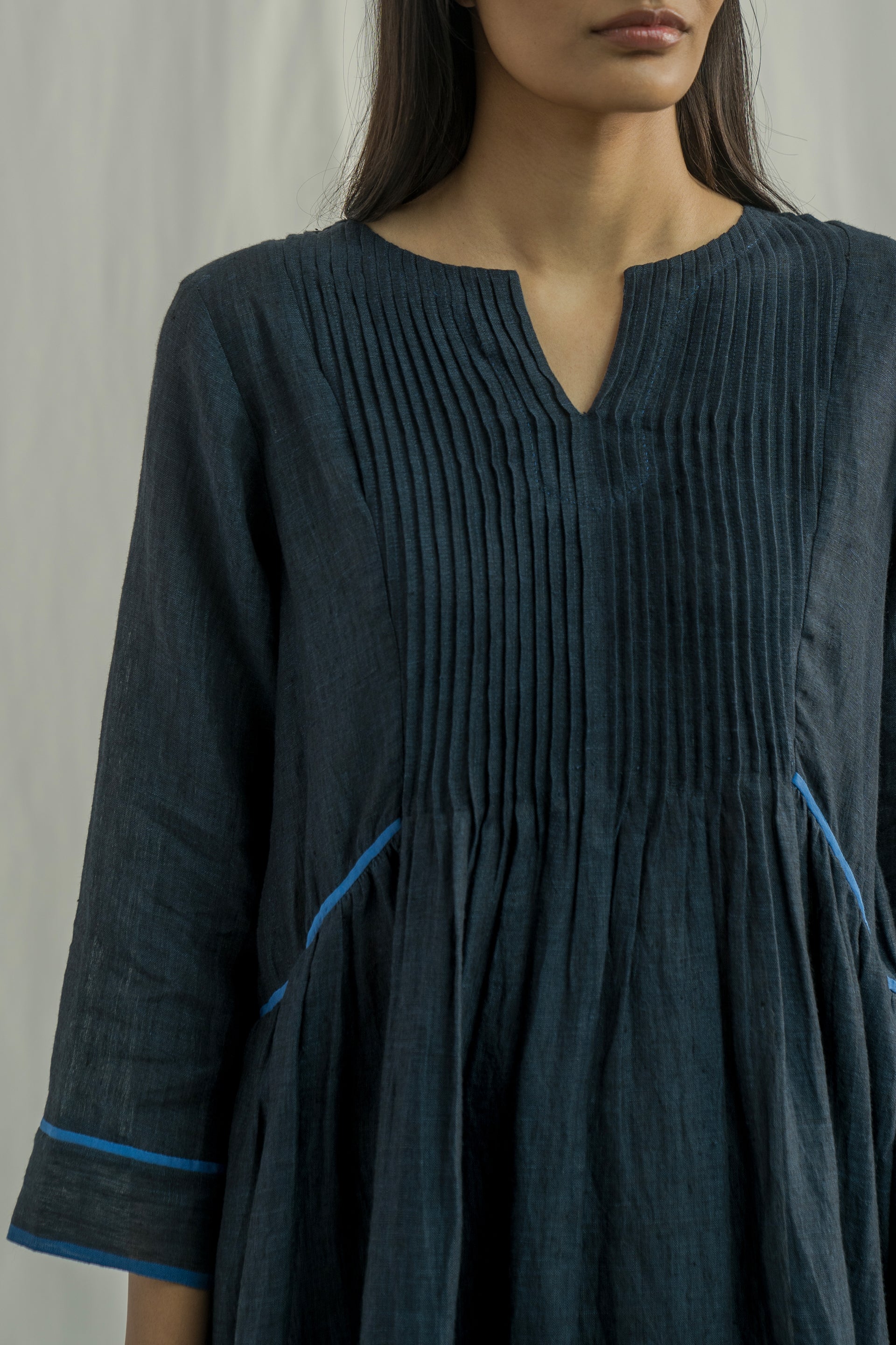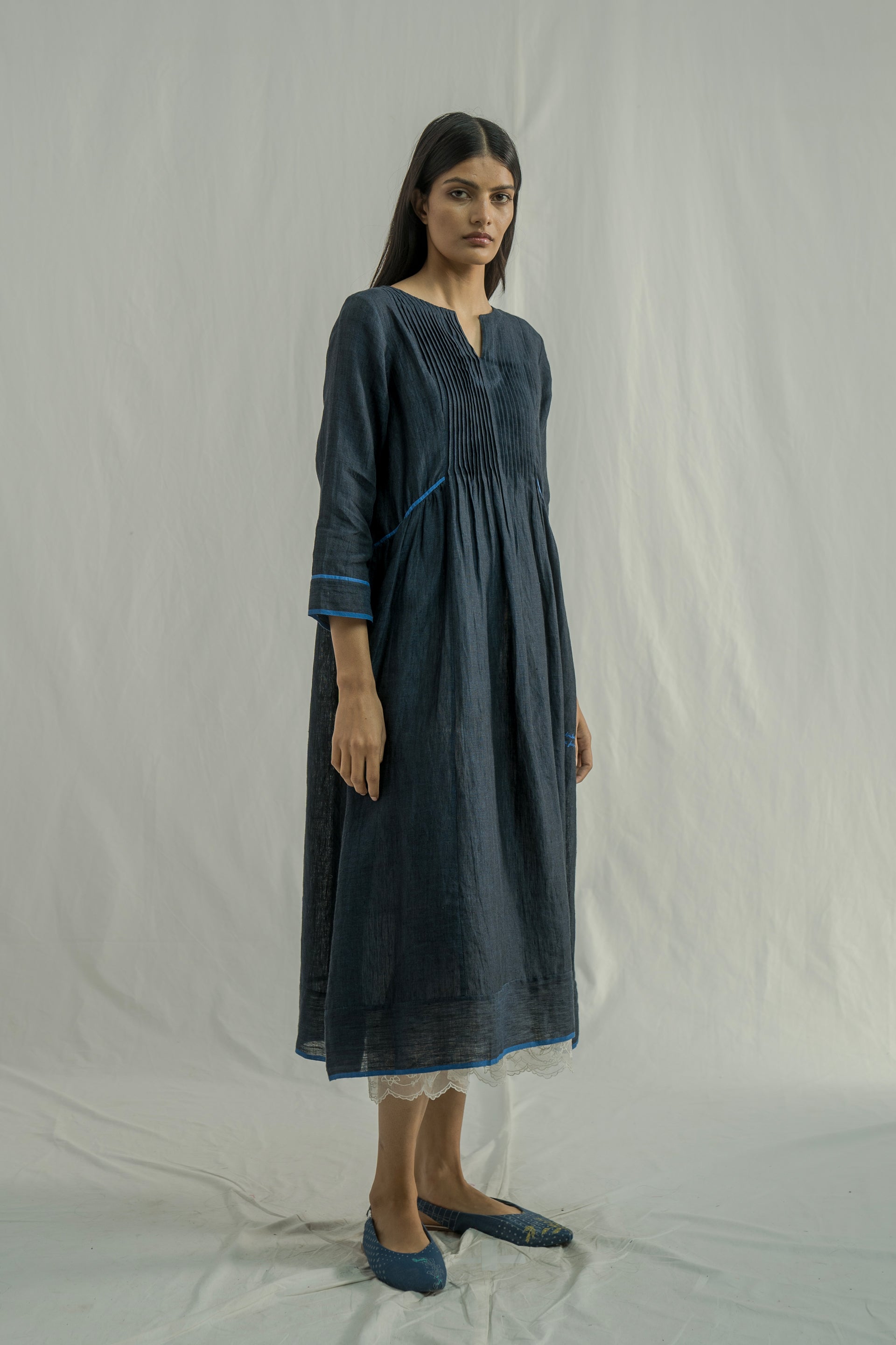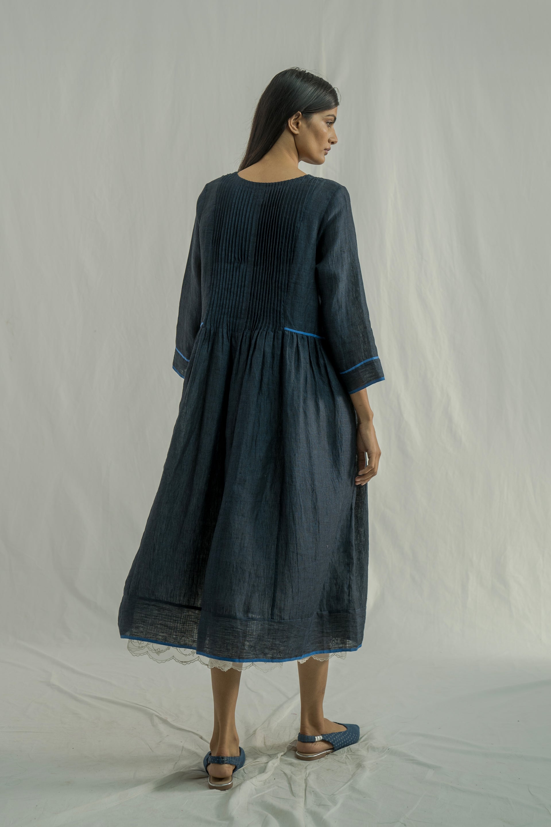 A midi-length dress with a round neckline and center cut, featuring 3/4 sleeves, pintuck detailing on the front and back bodice, and contrast selvedge inserts on the hem and sleeves. Crafted from solid 100% linen.