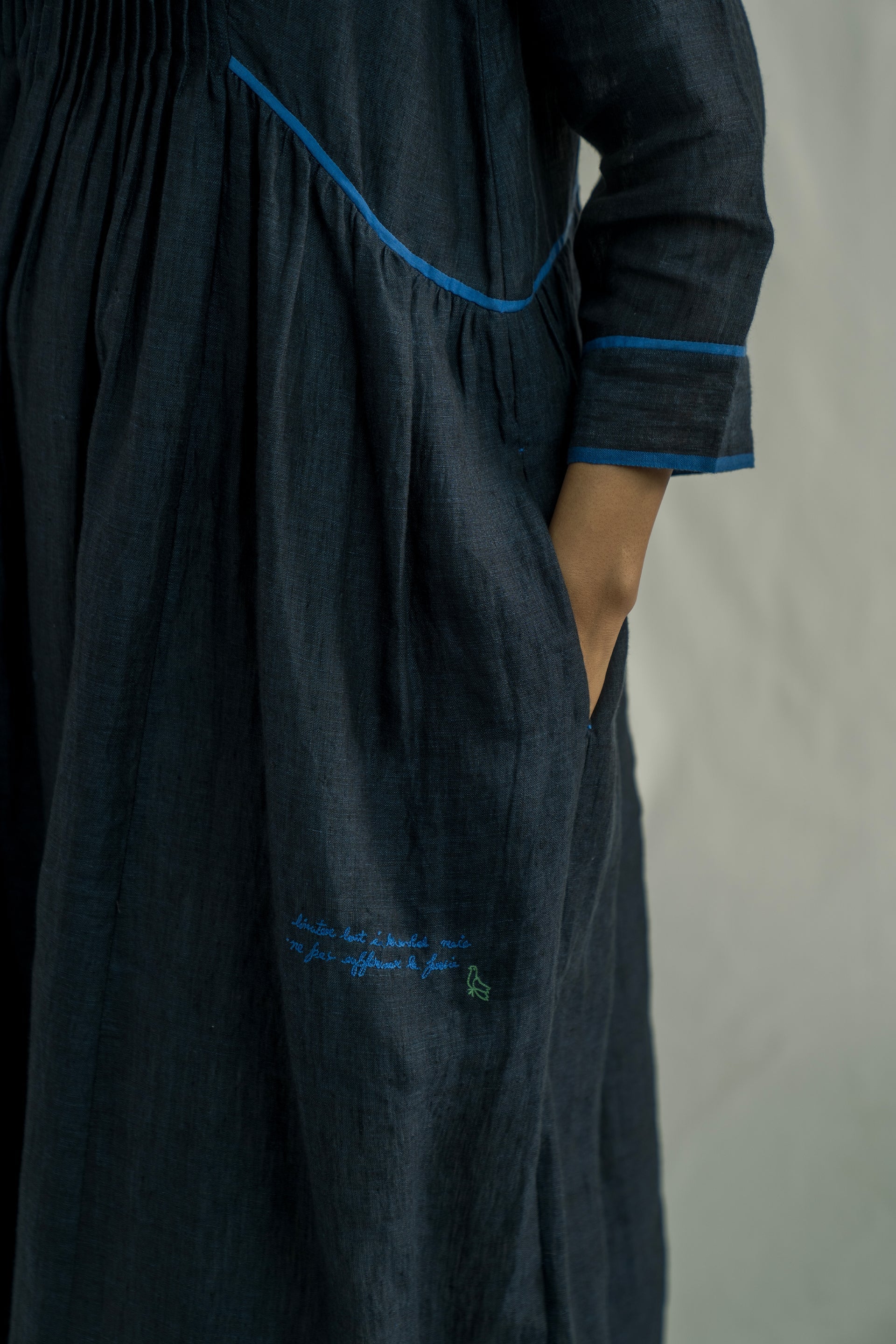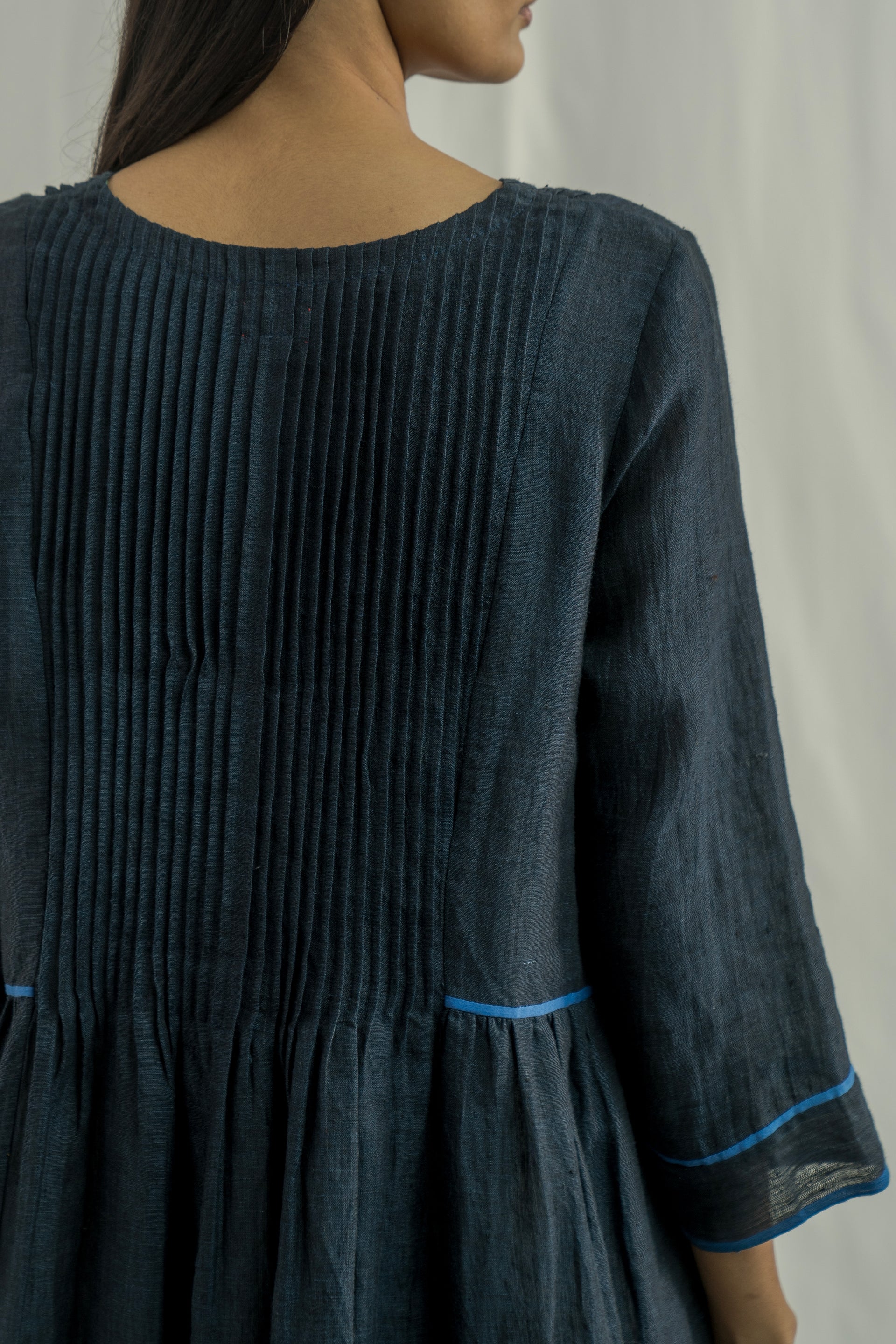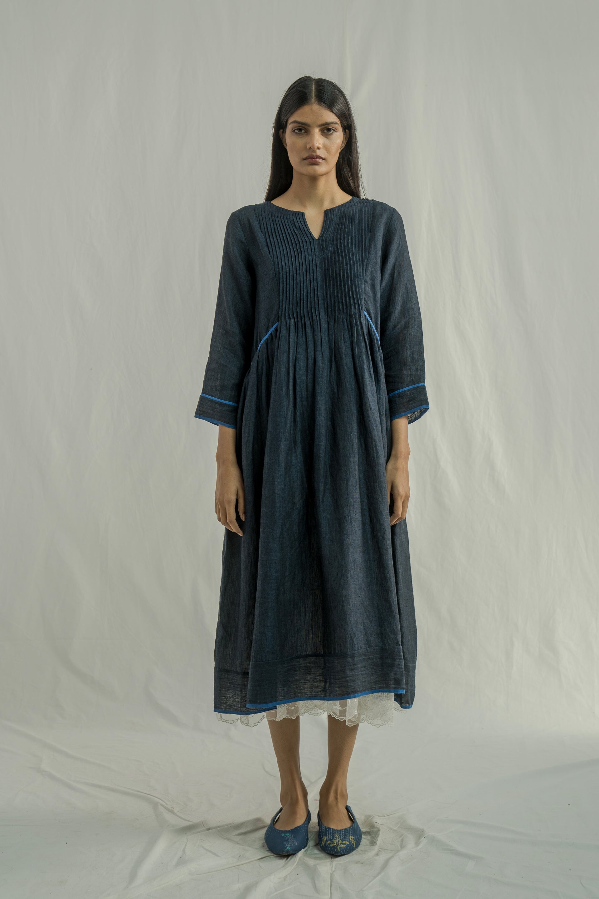 A midi-length dress with a round neckline and center cut, featuring 3/4 sleeves, pintuck detailing on the front and back bodice, and contrast selvedge inserts on the hem and sleeves. Crafted from solid 100% linen.