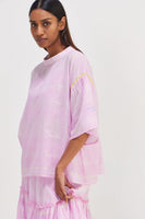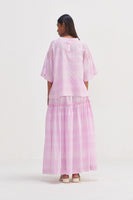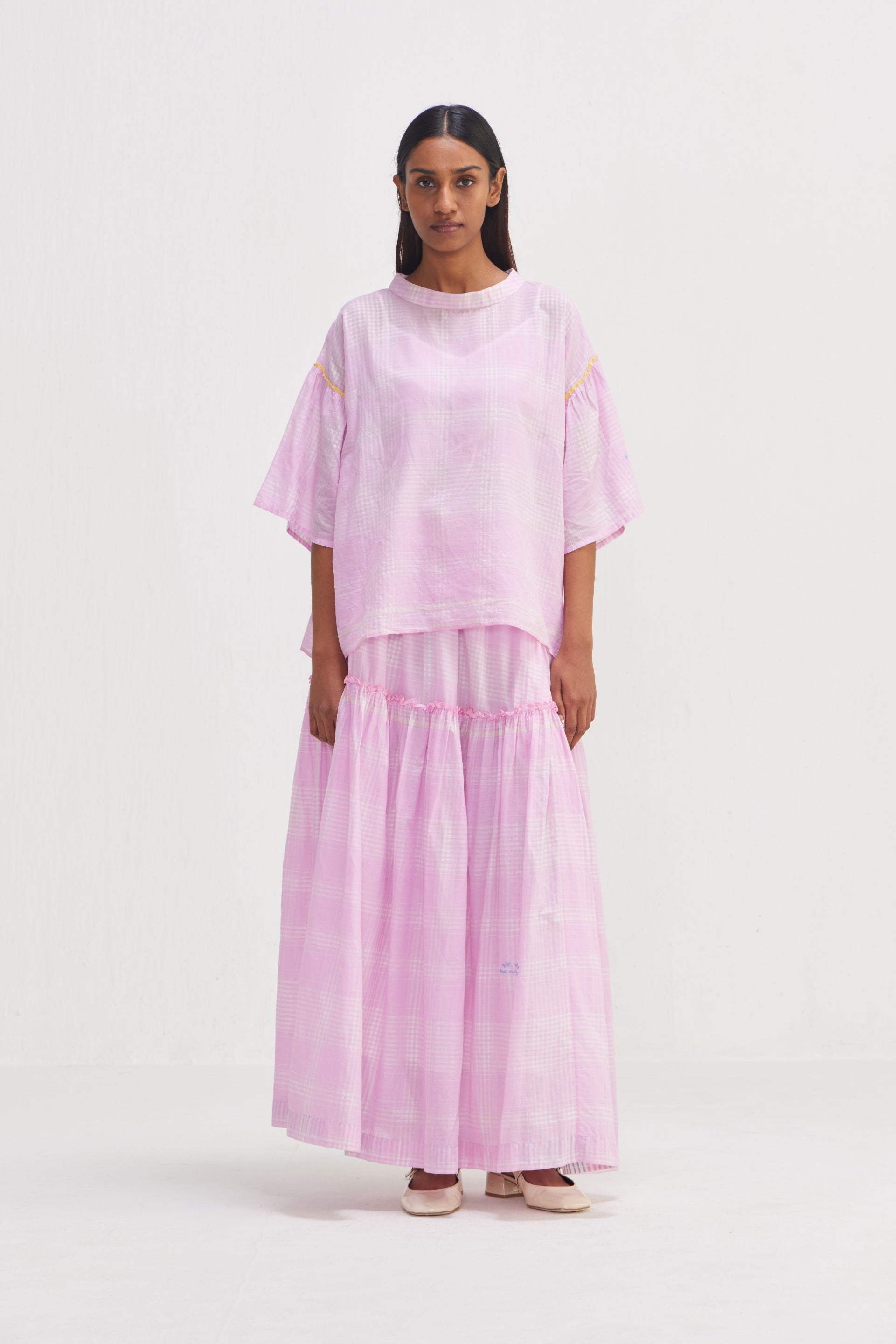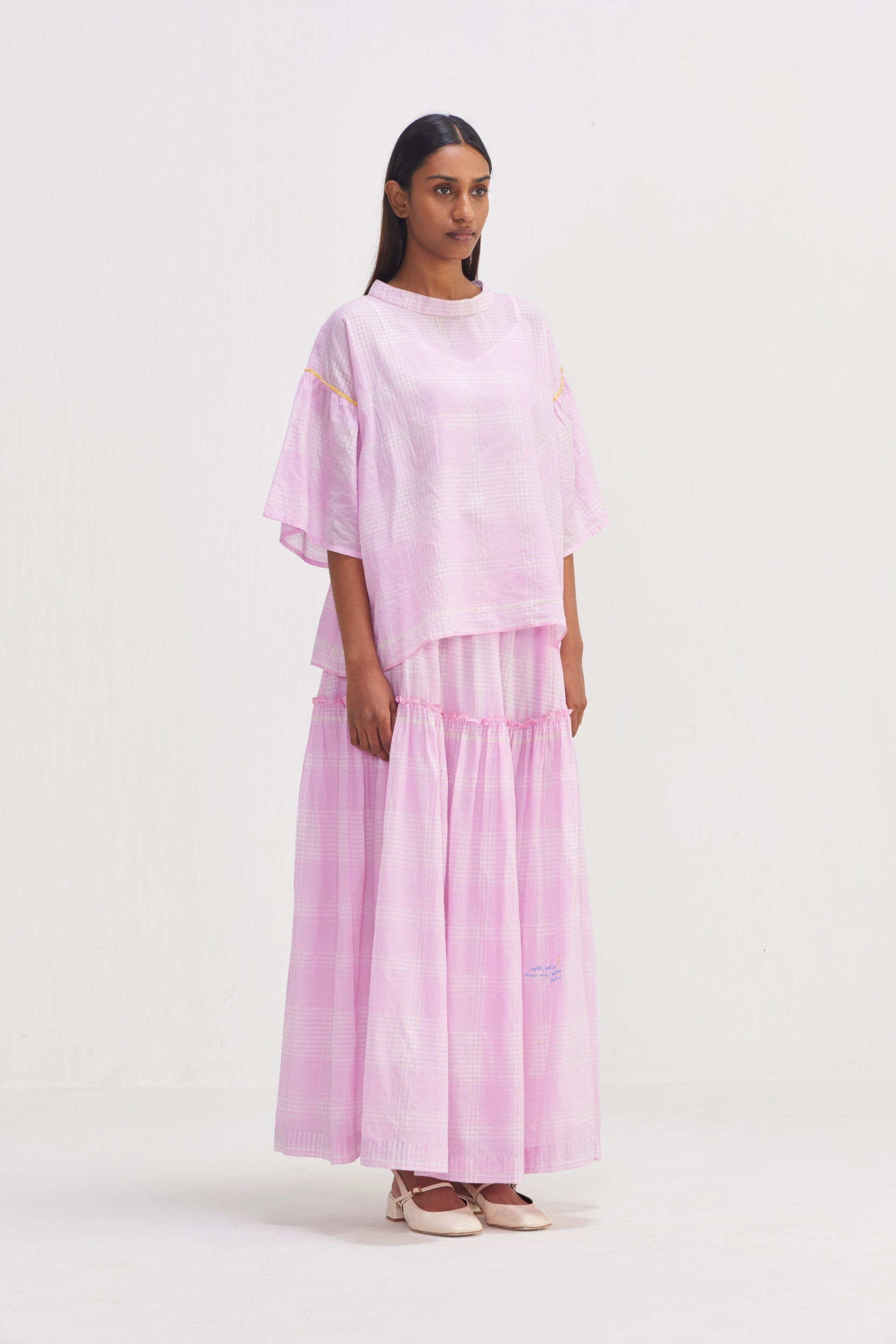 Checkered top, featuring contrast gathers on the sleeves for a unique touch. Complete with selvedge detail and delicate hand embroidery text, this top exudes sophistication and style.